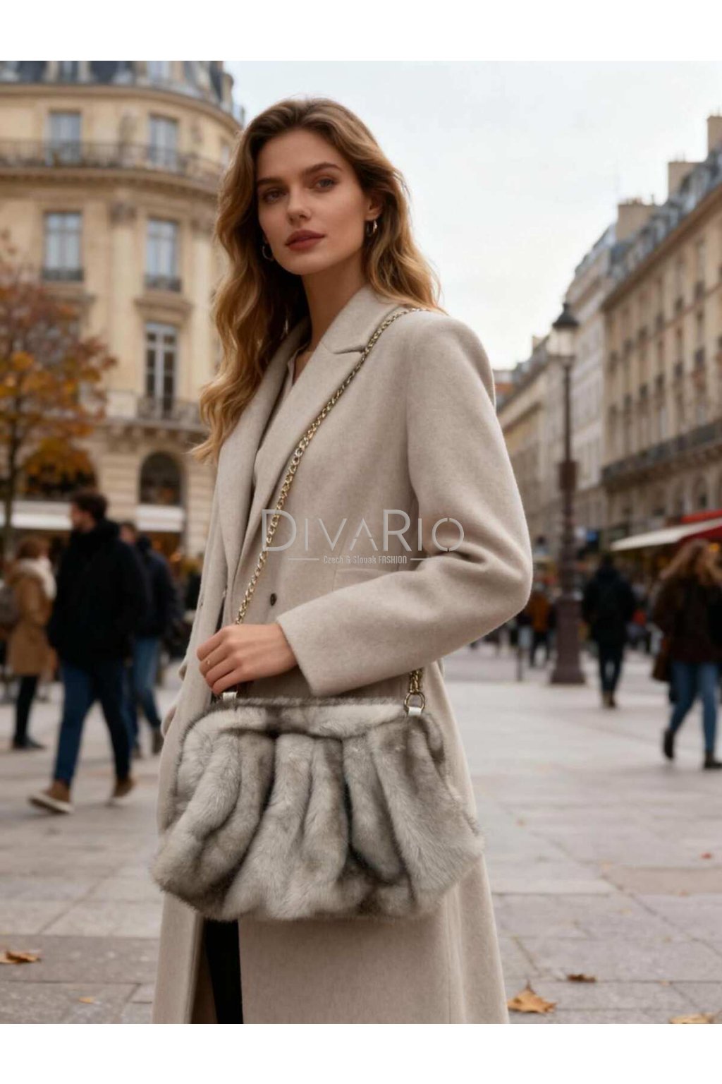 Kožušinová kabelka v šedo hendej farbe, zlatá retiazka ako ramienko. Hebučký materiál.