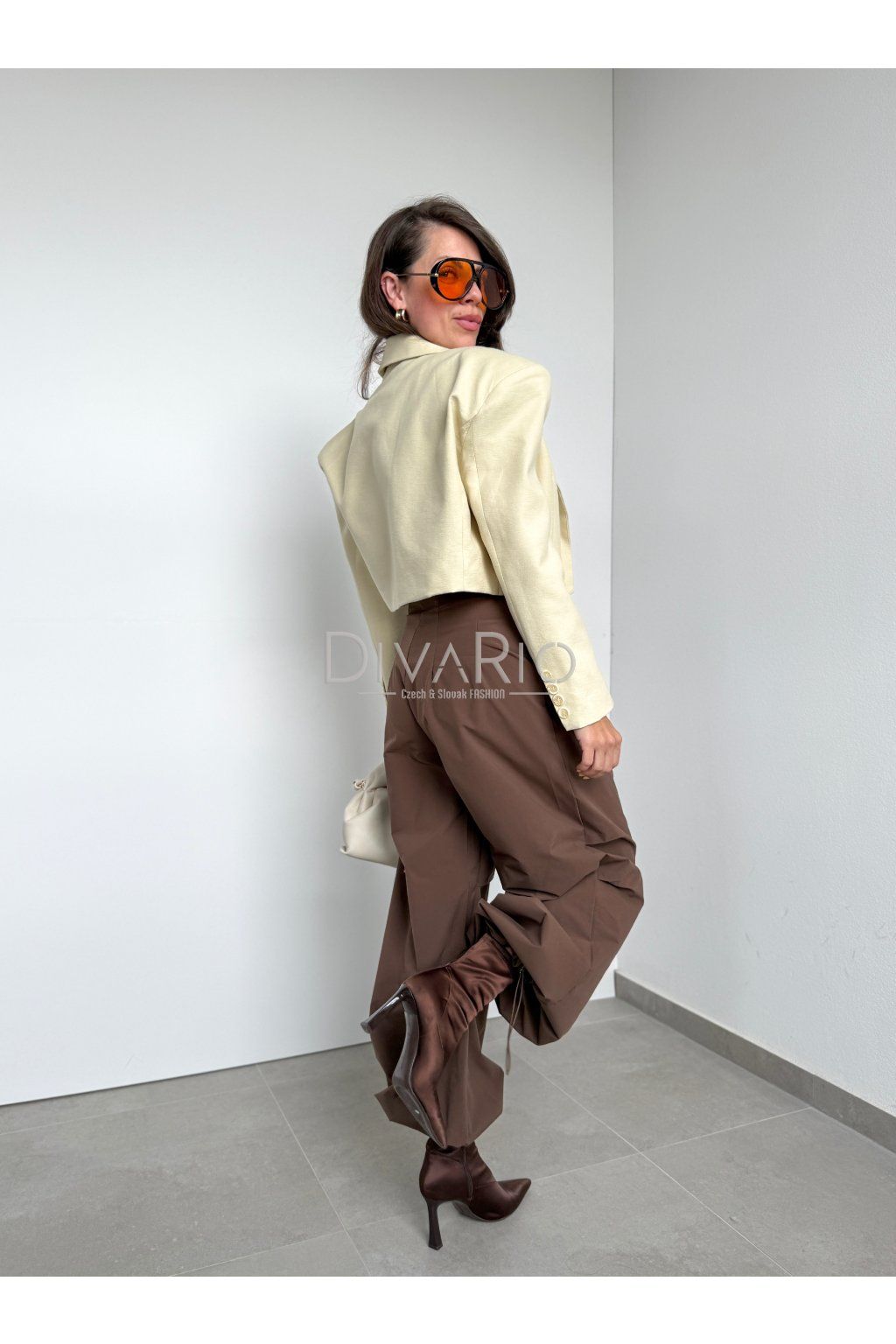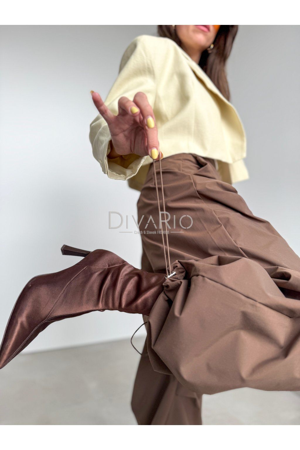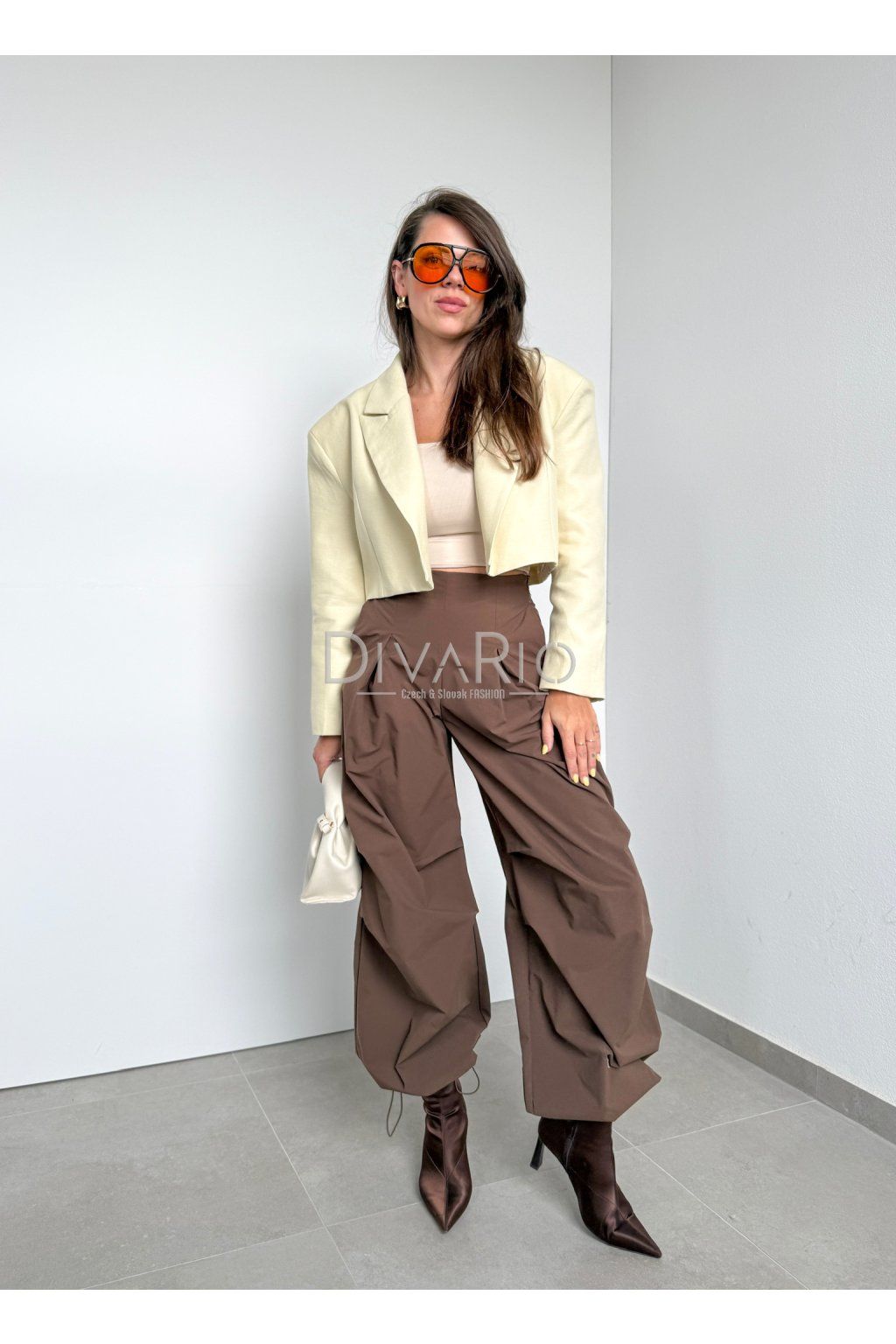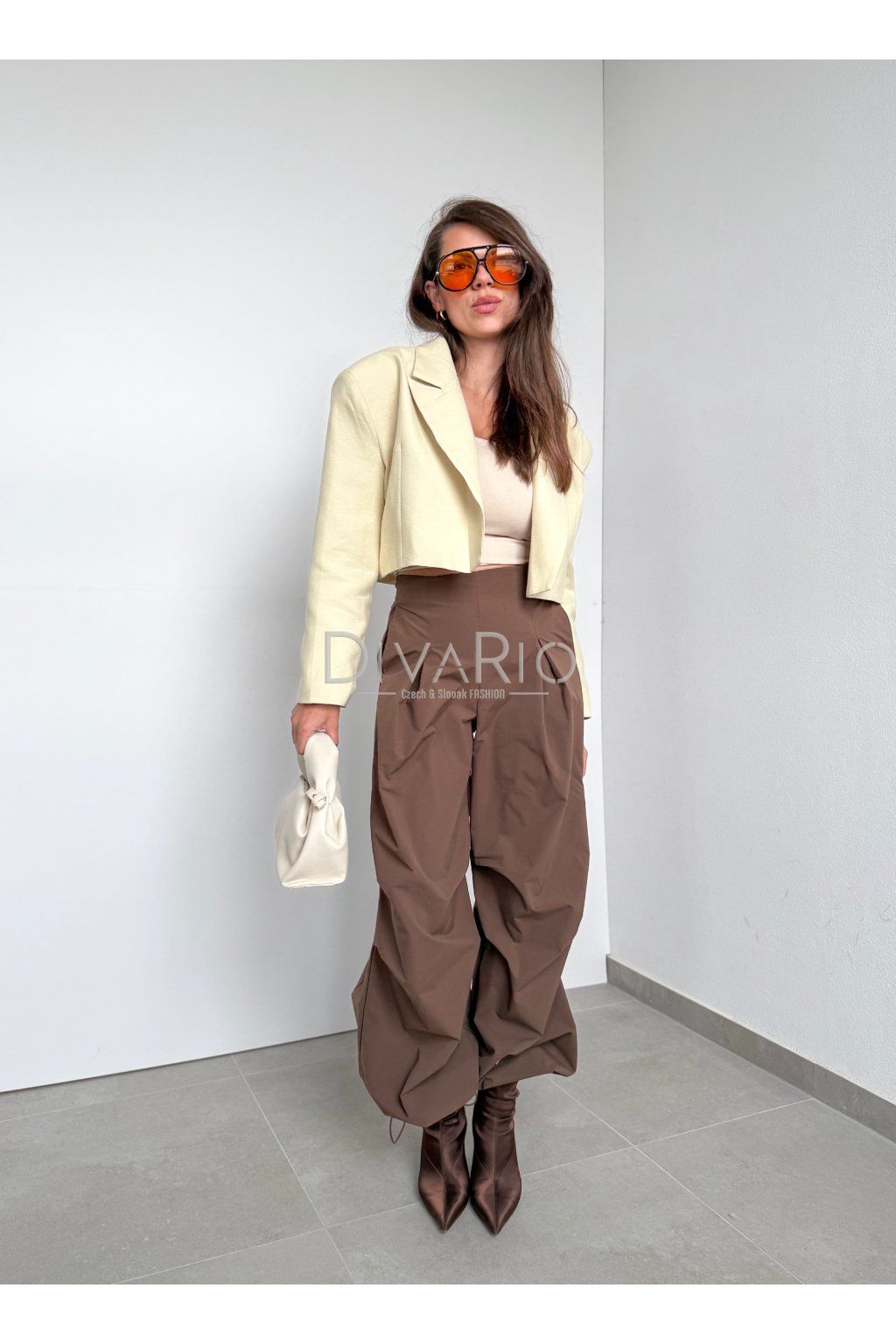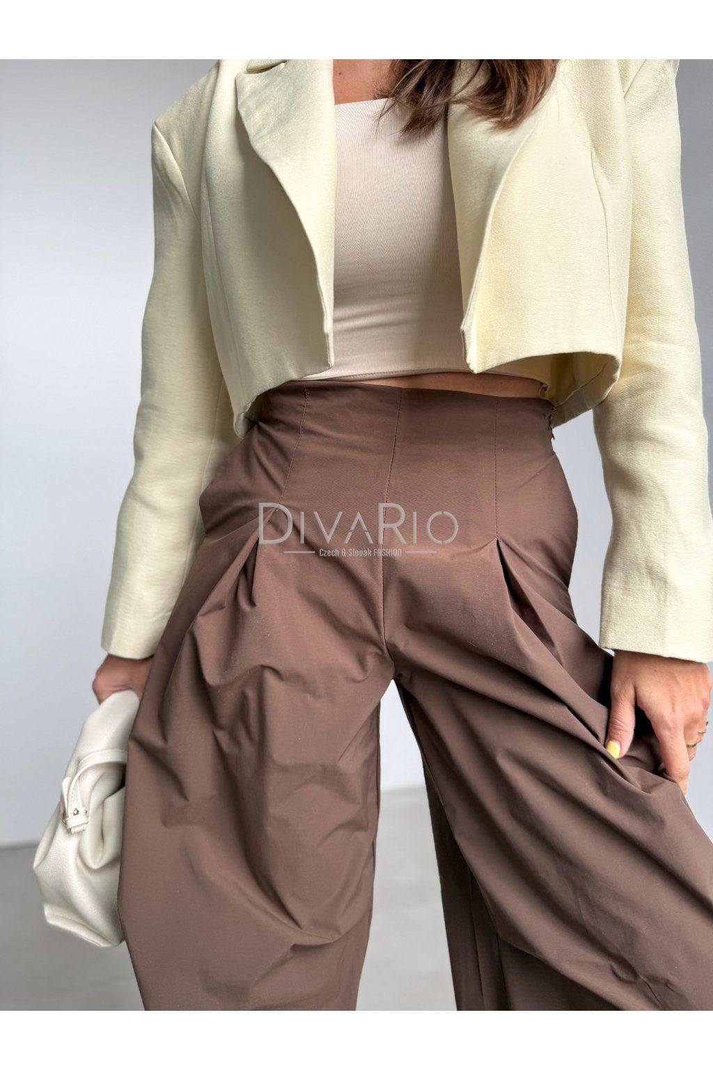 Hnedé balónové nohavice, vysoký pas, sťahovanie na spodku.