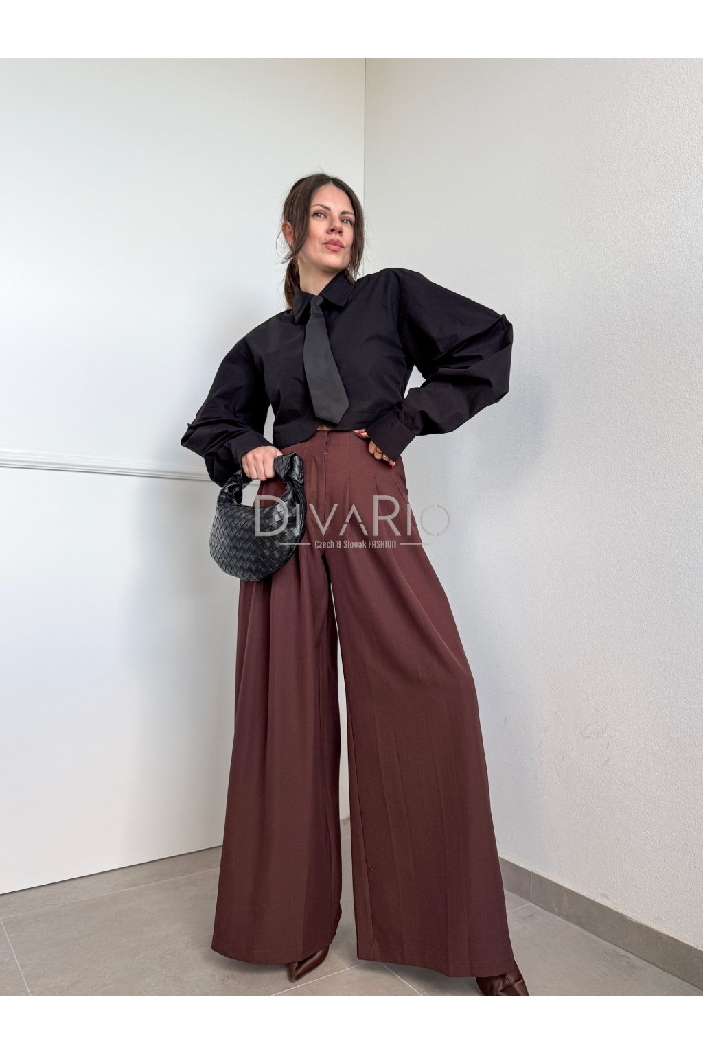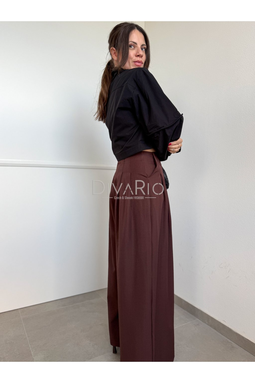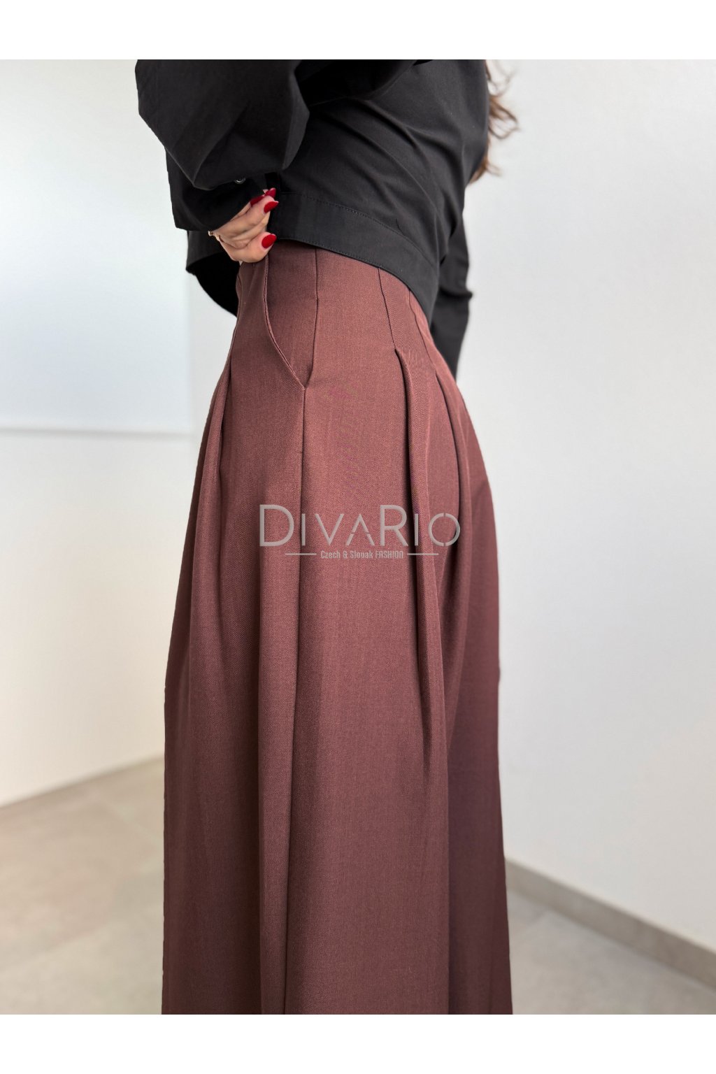 Hnedé široké elegantné nohavice, vysoký pas, vrecká.