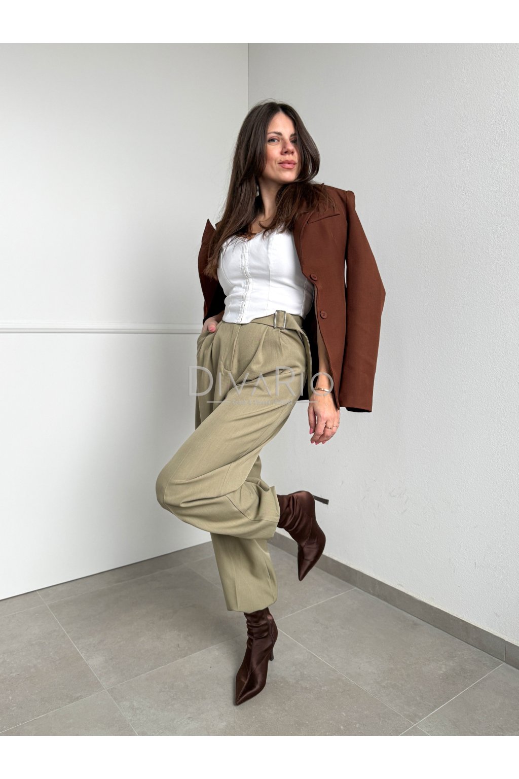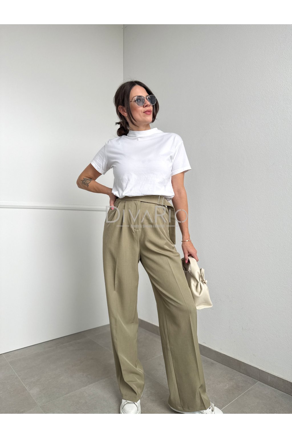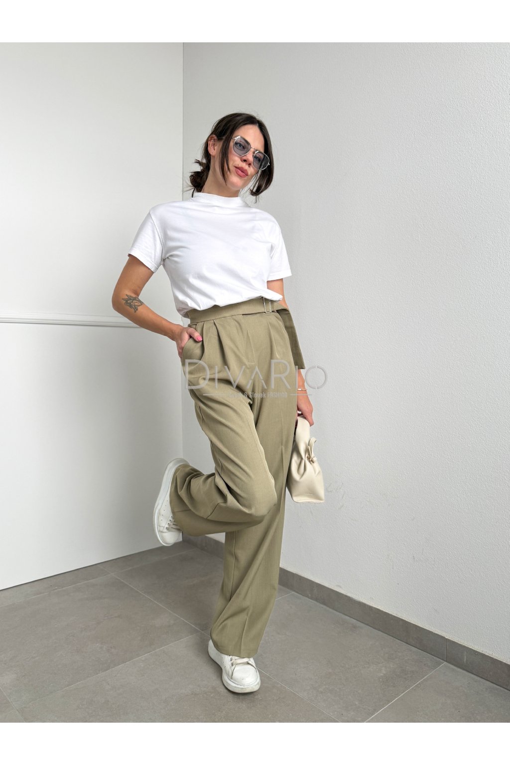 Zelené široké elegantné zelené nohavice s látkovým opaskom, vysoký pas, vrecká.