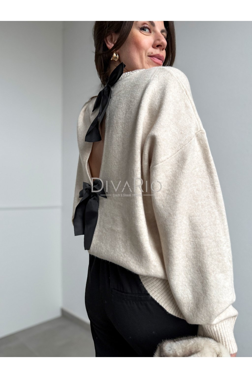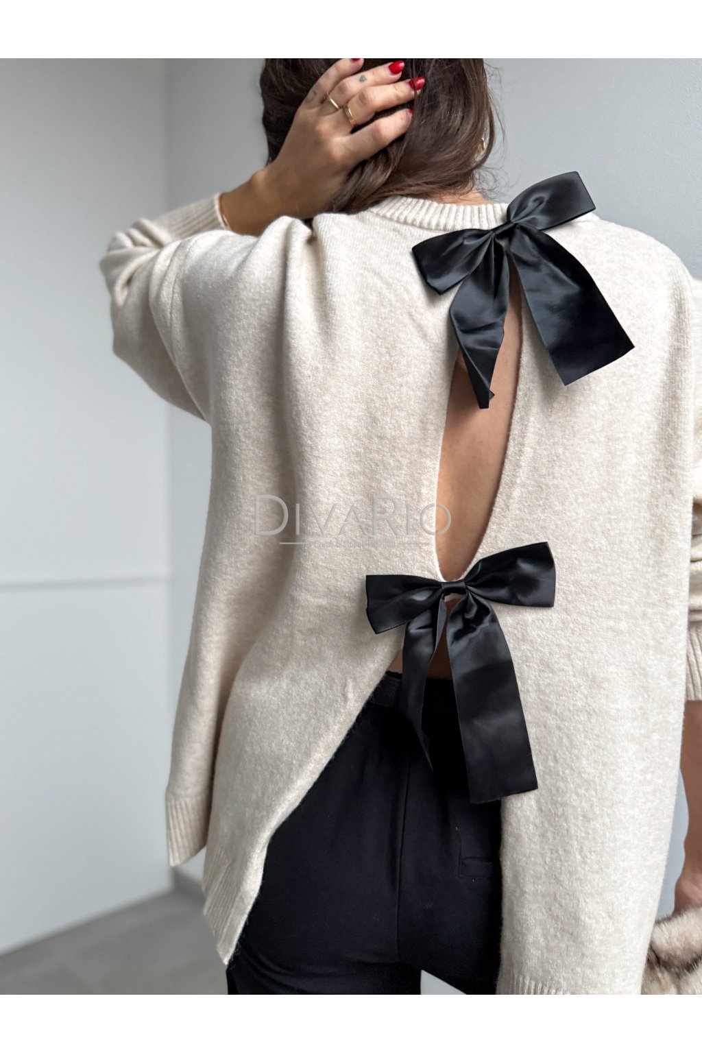 Bežový svetrík s čiernými mašličkami na chrbte, dlhý rukáv, príjemný jemný materiál. Overisze strih.