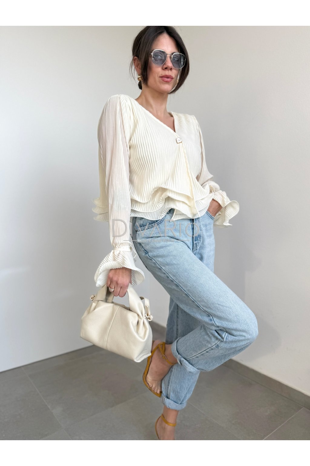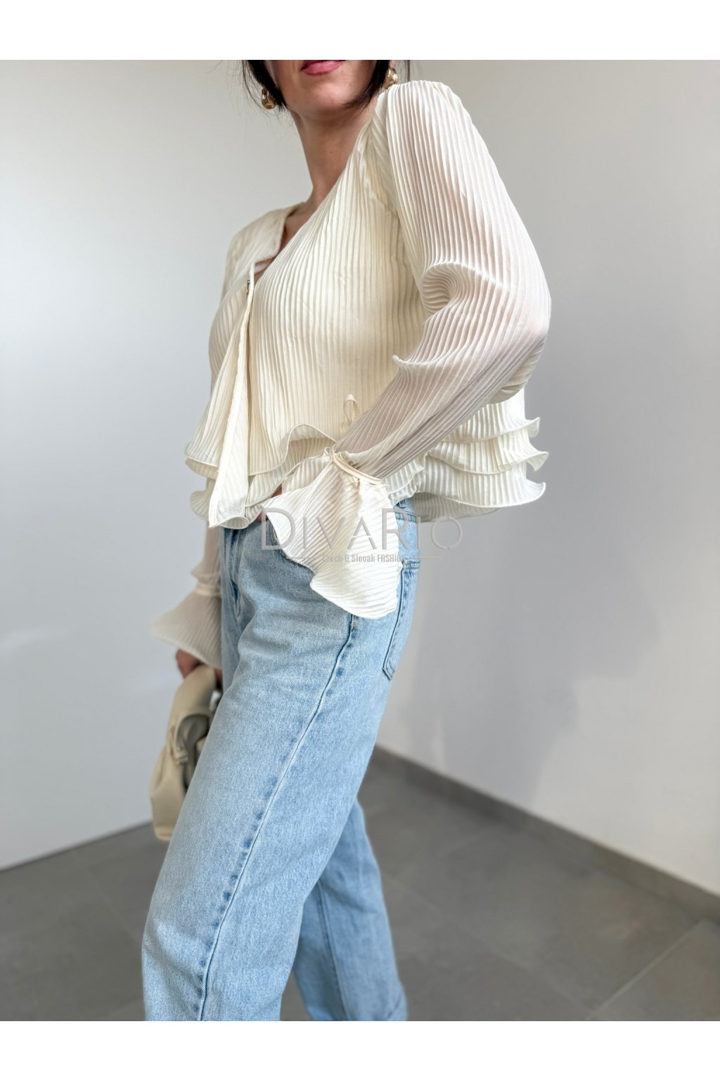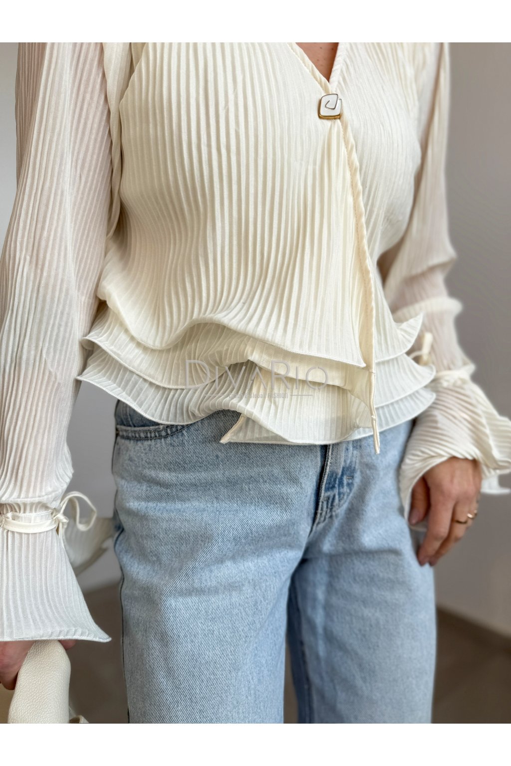 Bežový plisovaný saténový top s dlhým rukávom. Gombík, zvlnený spodok, zvonové manžety na rukávoch, ktoré si vytvoríme zviazaním prišitej šnúrky.
