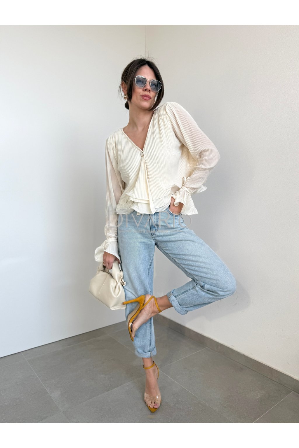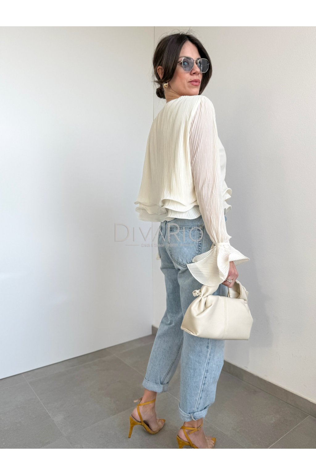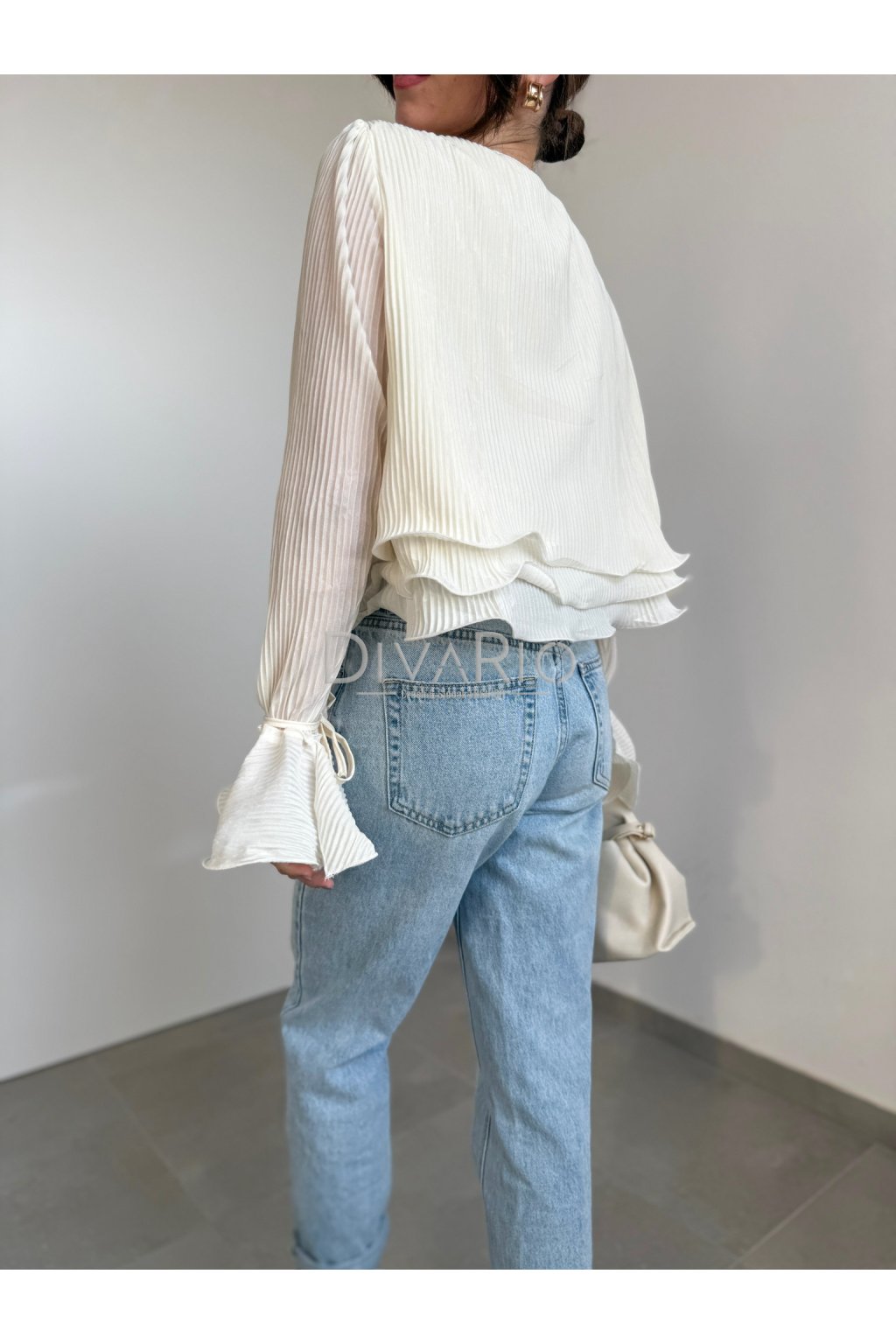 Bežový plisovaný saténový top s dlhým rukávom. Gombík, zvlnený spodok, zvonové manžety na rukávoch, ktoré si vytvoríme zviazaním prišitej šnúrky.