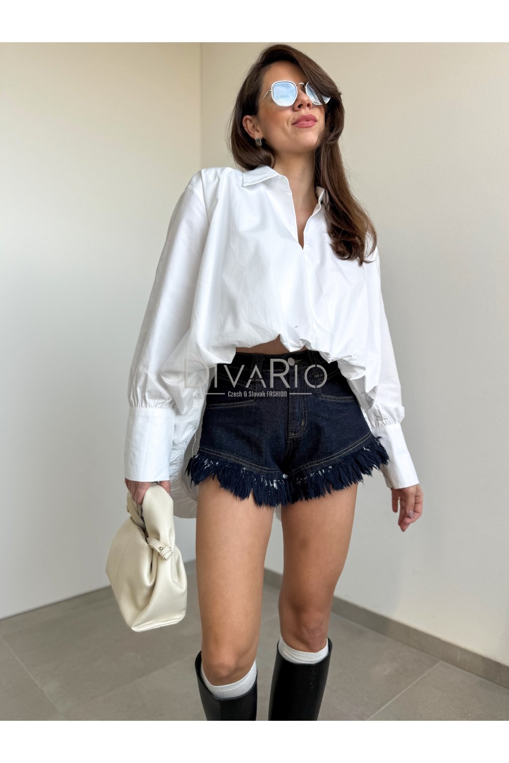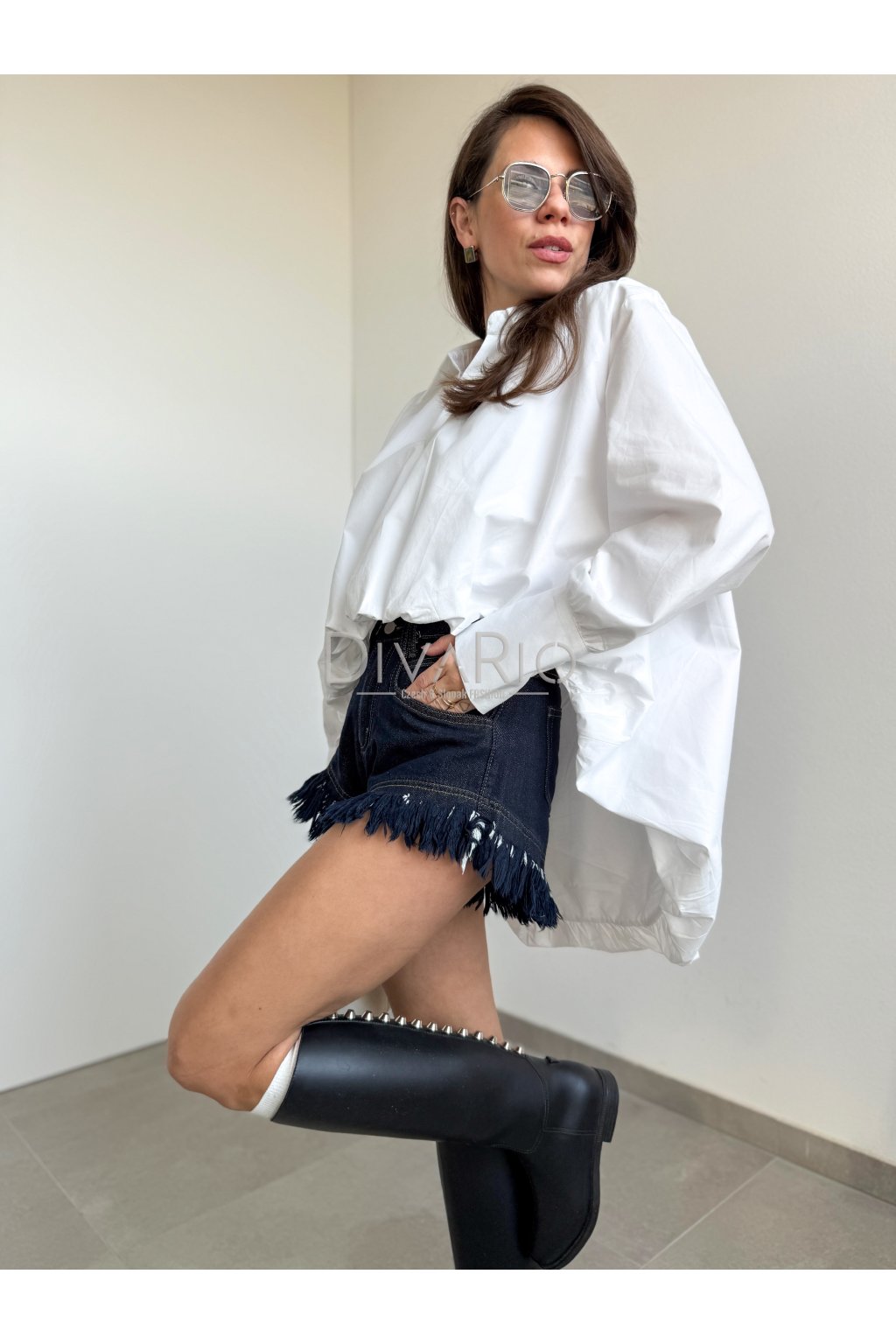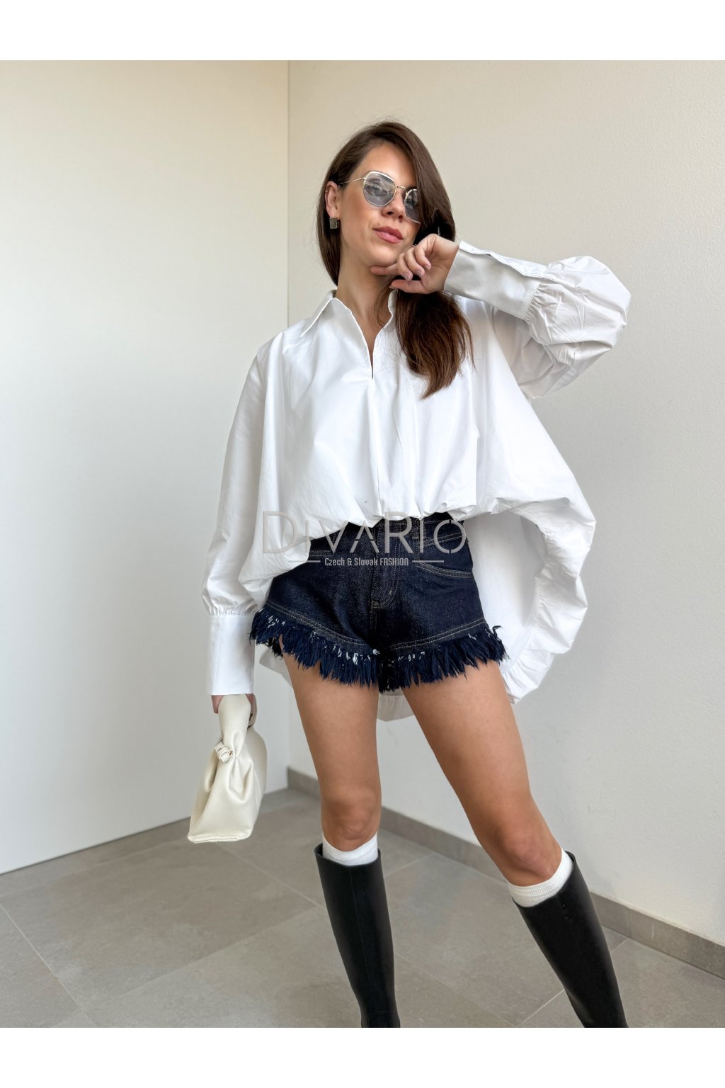 Biela overisze košeľa. Balónový oversize strih, bez zapínania, golier, široké rukávy s manžetou.