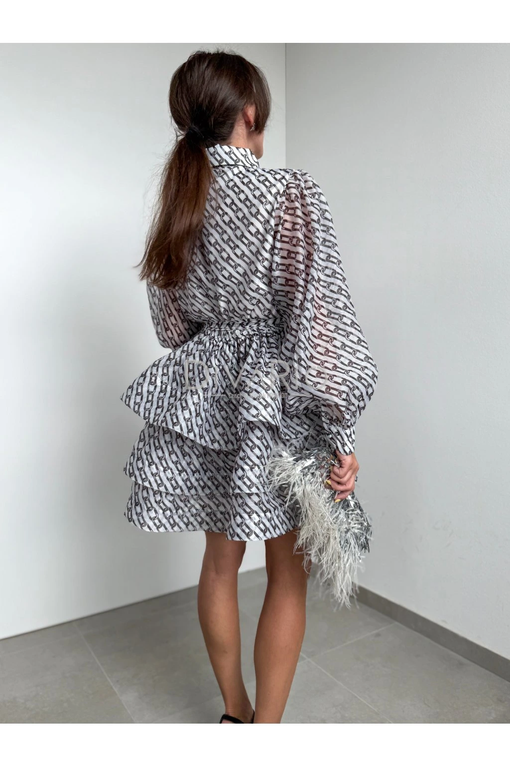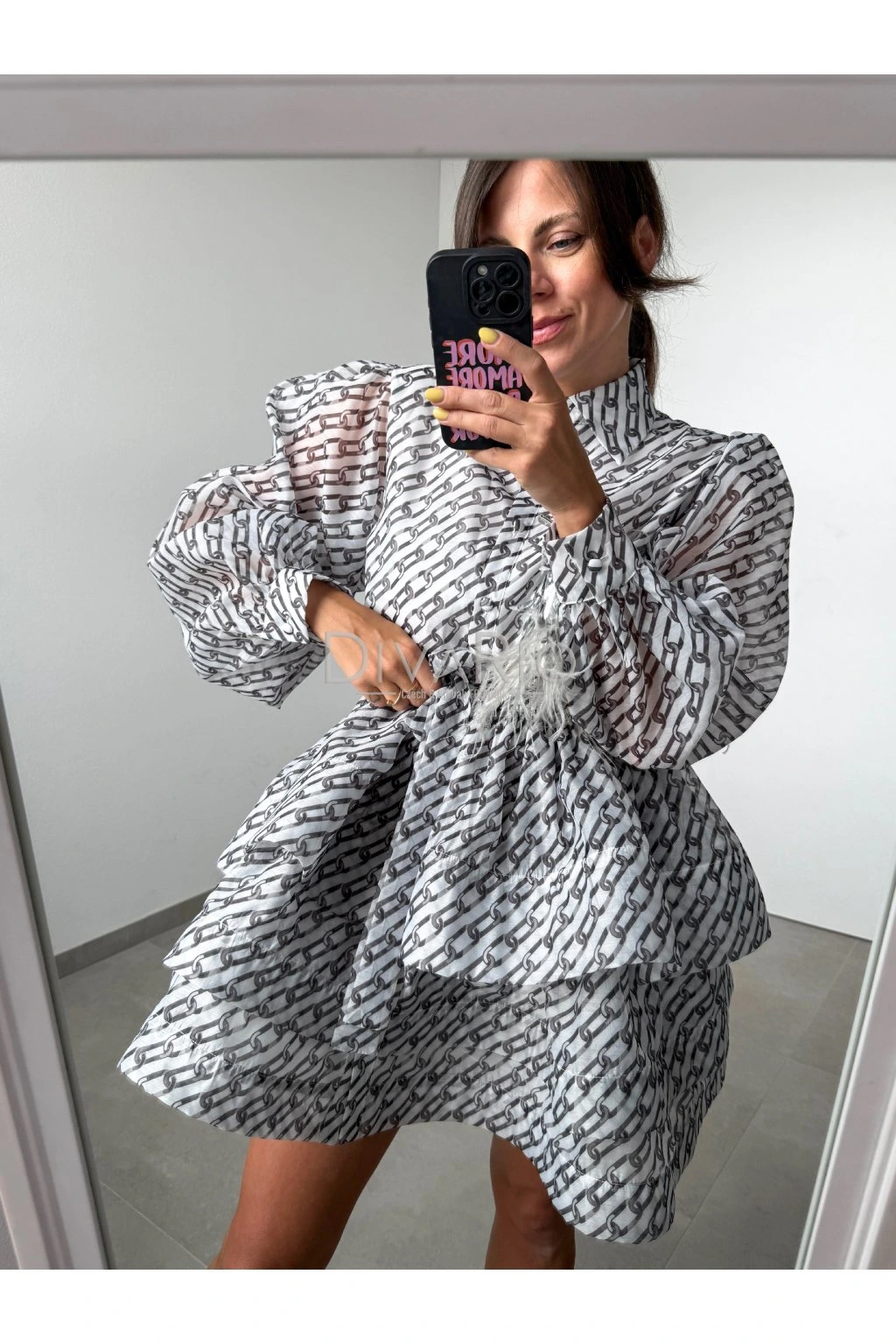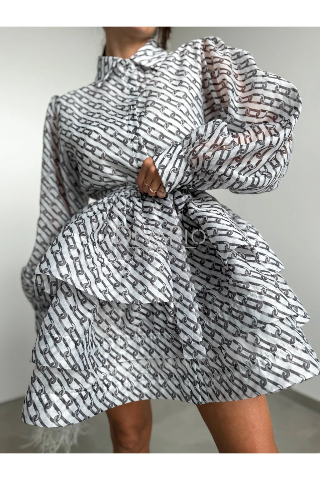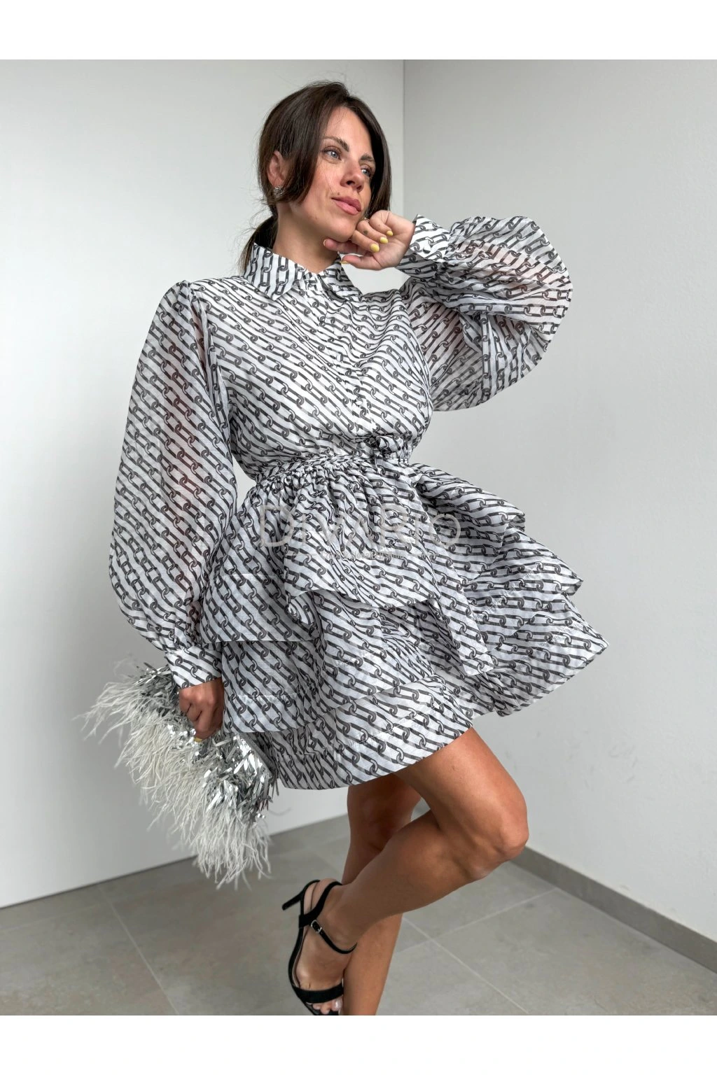 Krátke bielo čierne šaty s dlhym rukávom Zapínanie na gombíky, v pase opasok rovnakej látky. Sukňa odstáva ako na fotkách, sú v nej pevné tylové patenty.