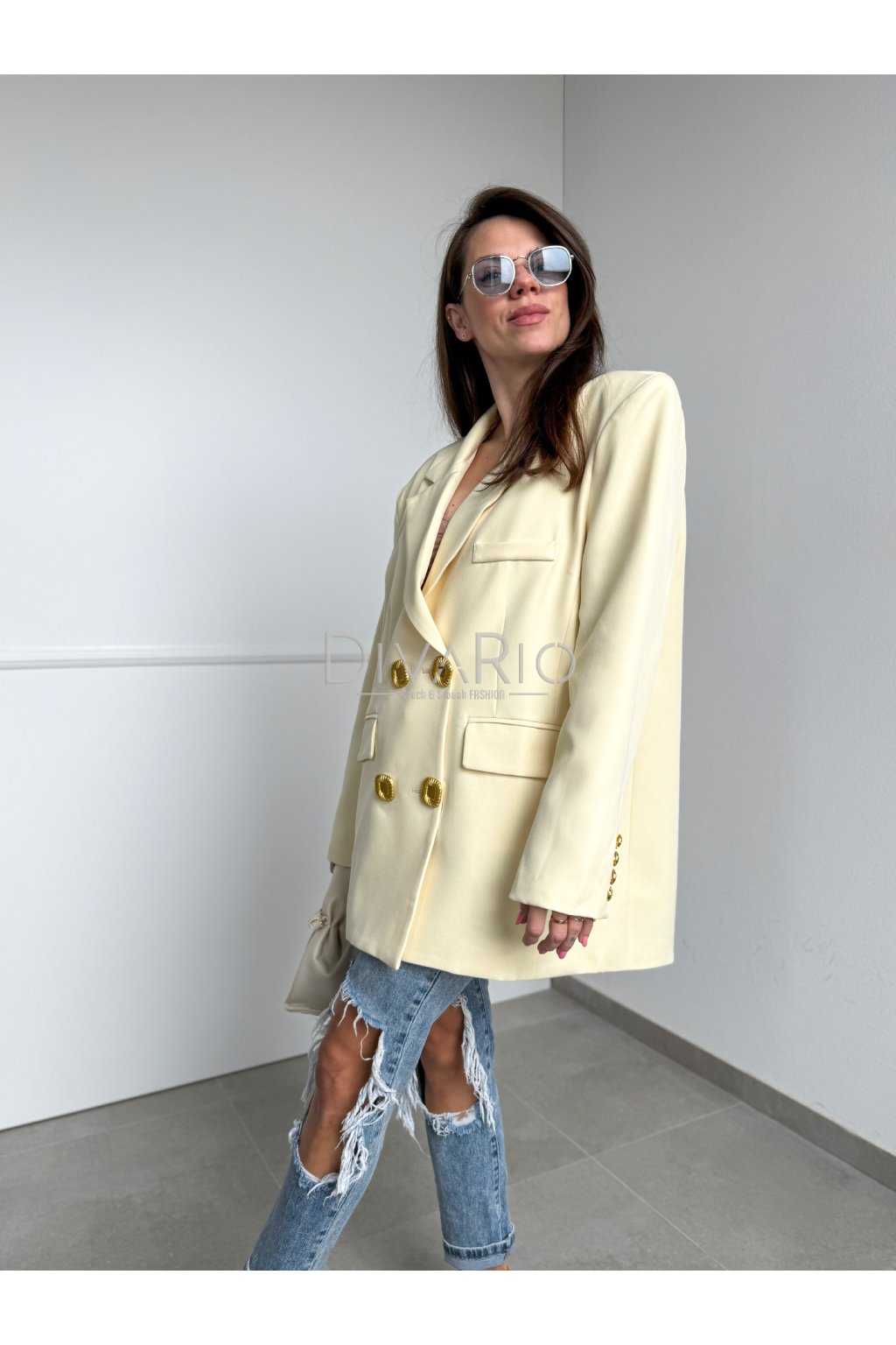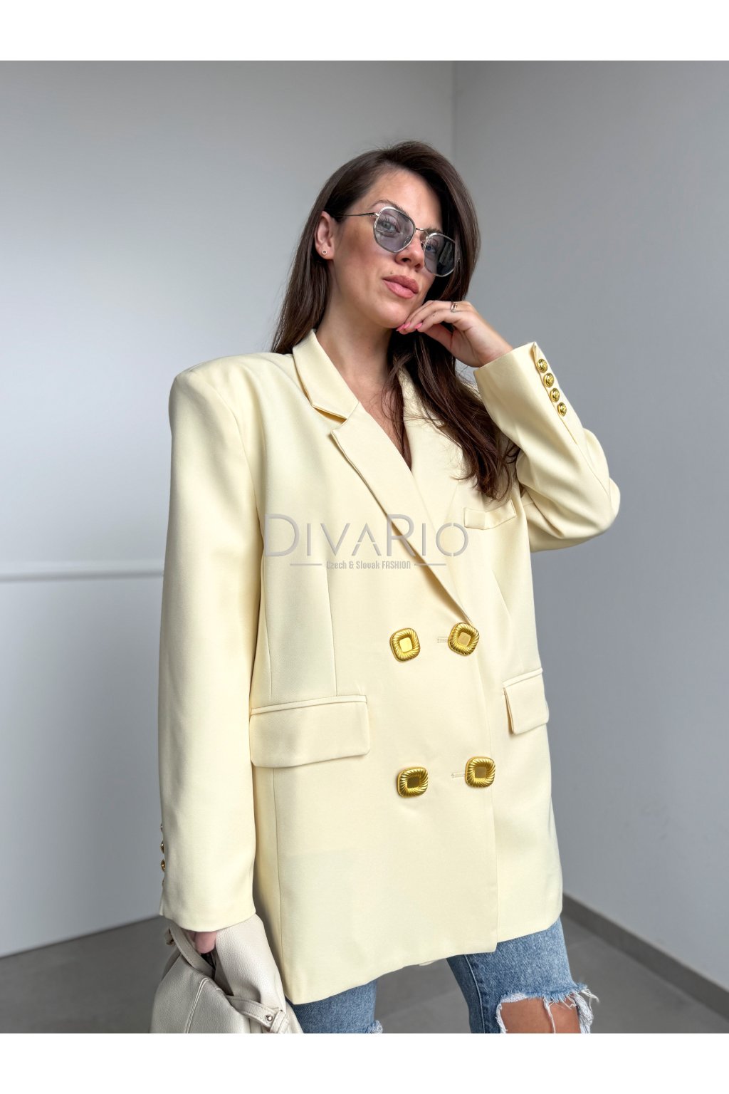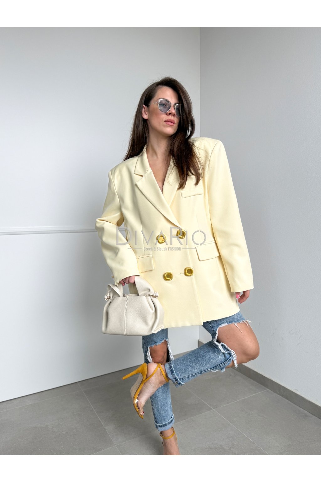 Oversize predĺžené sako v butteryellow (maslovo žltej) farbe. Zapínanie na zlaté ozdobné gombíky.
