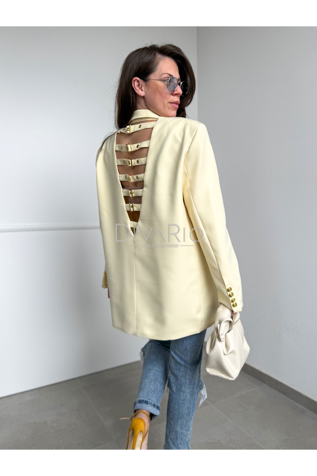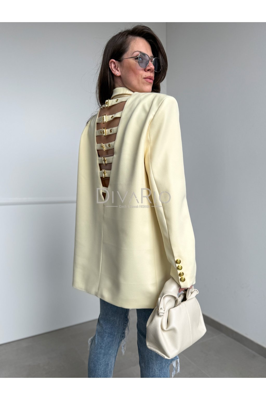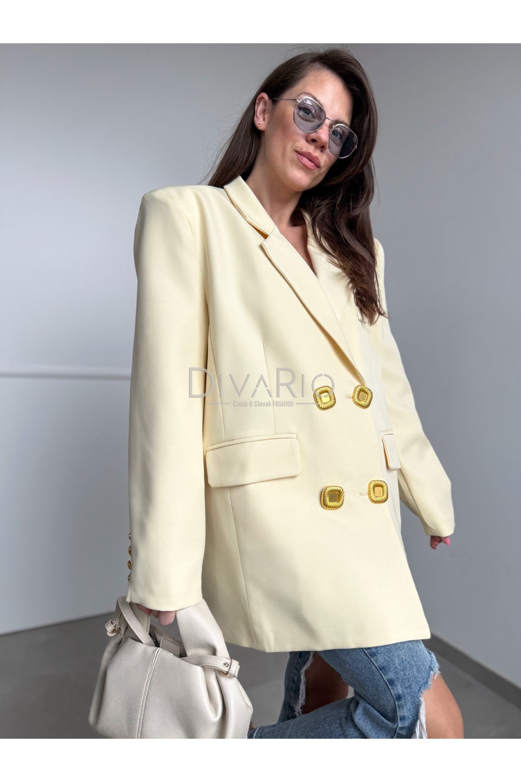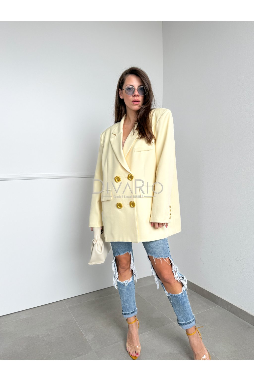 Oversize predĺžené sako v butteryellow (maslovo žltej) farbe. Zapínanie na zlaté ozdobné gombíky.