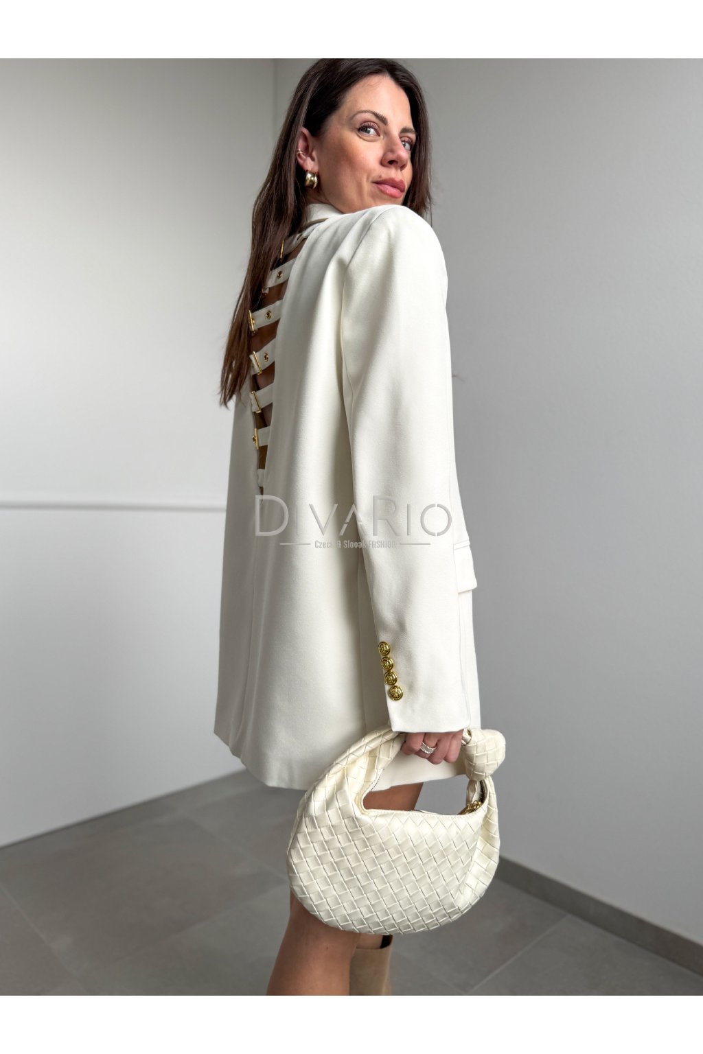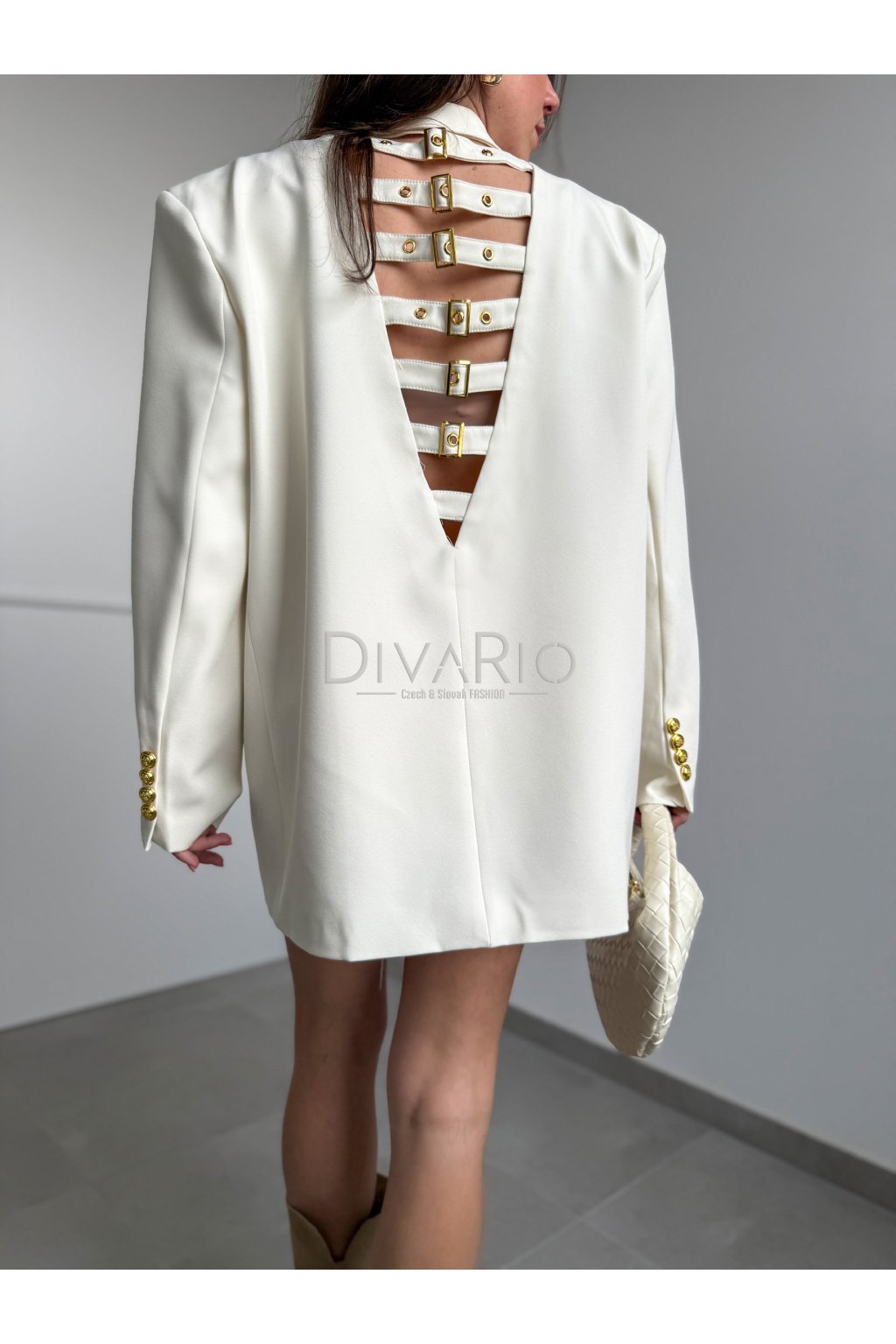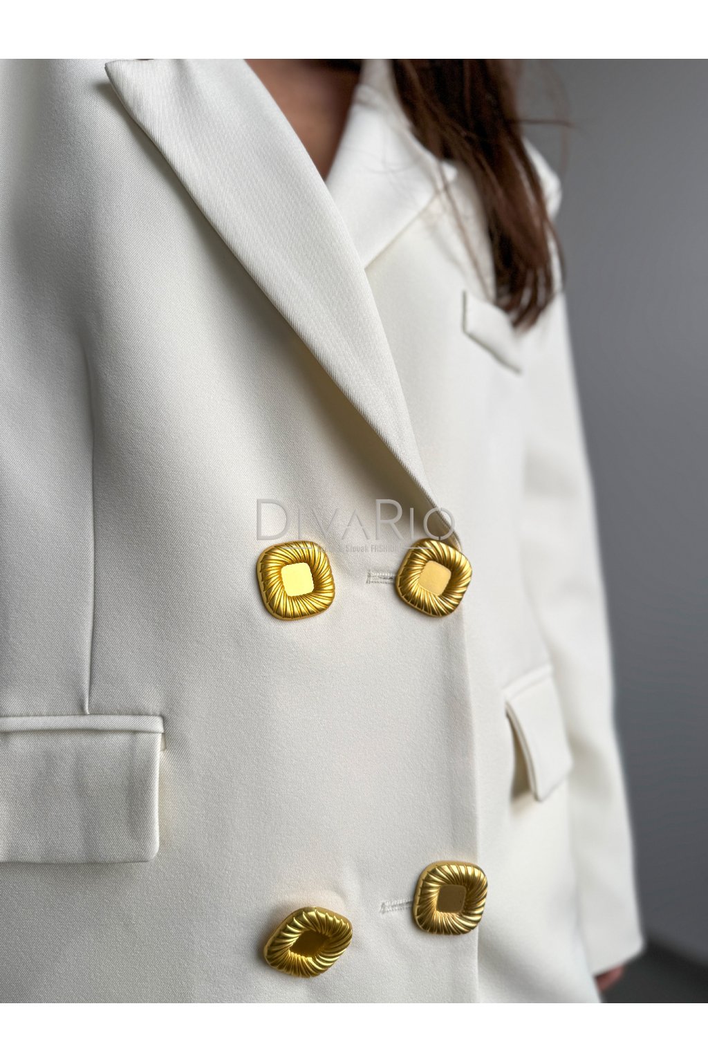 Oversize predĺžené sako v krémovej farbe. Zapínanie na zlaté ozdobné gombíky.