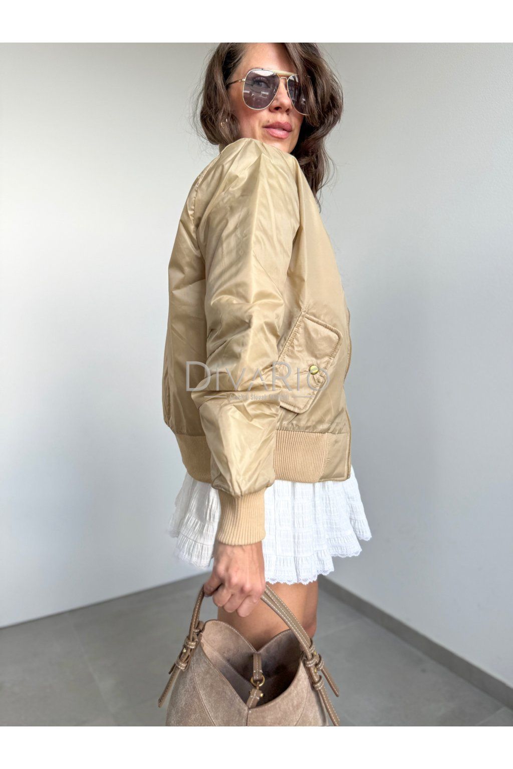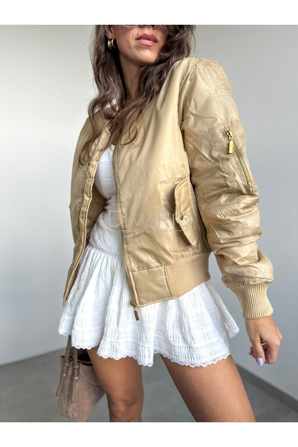 Šušťáková bombera v zlatej farbe, zlaté zipsy, zapínanie na zips, nariasená rukávy, dlhý rukáv.