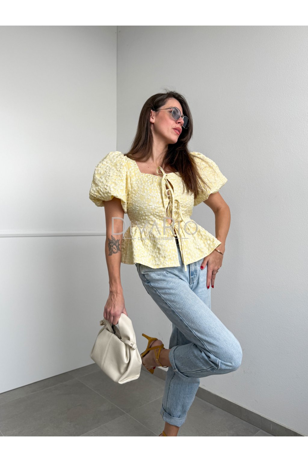 Zavinovací top s krátkym balónovým rukávom, maslovo žltá farba. Top kvalita.