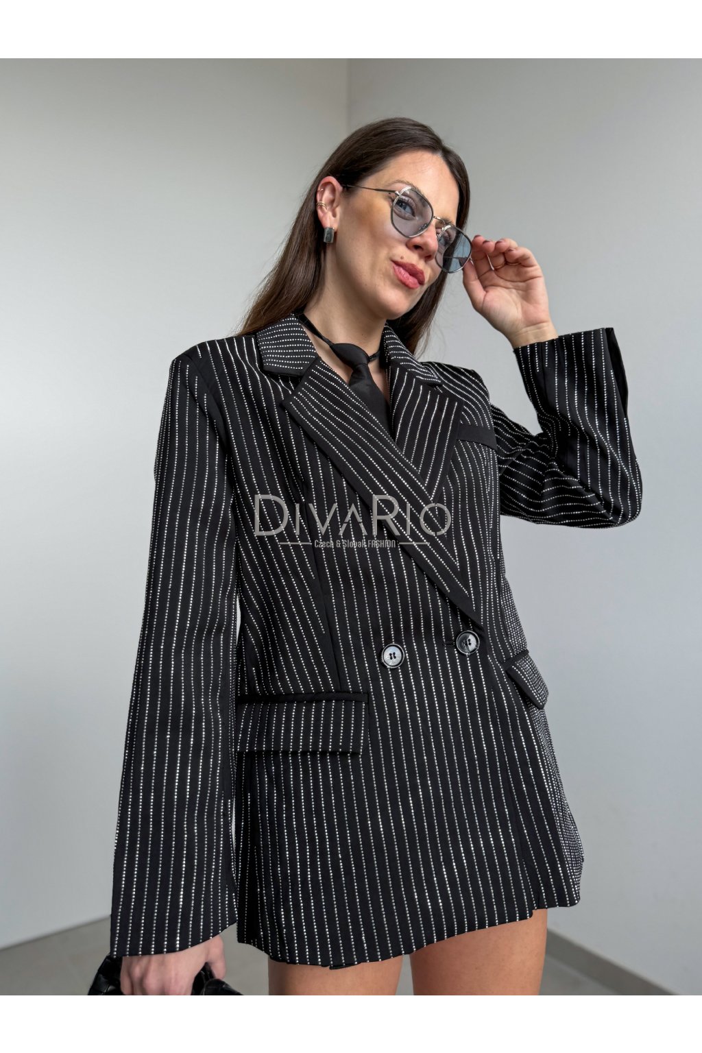 Oversize predĺžené sako v čiernej farbe so striebornými prúžkami. Dlhý rukáv, zapínanie na gombík, príjemne viskózové futro. Kravata nie je súčasťou saka, viete dokúpiť v doplnkoch.