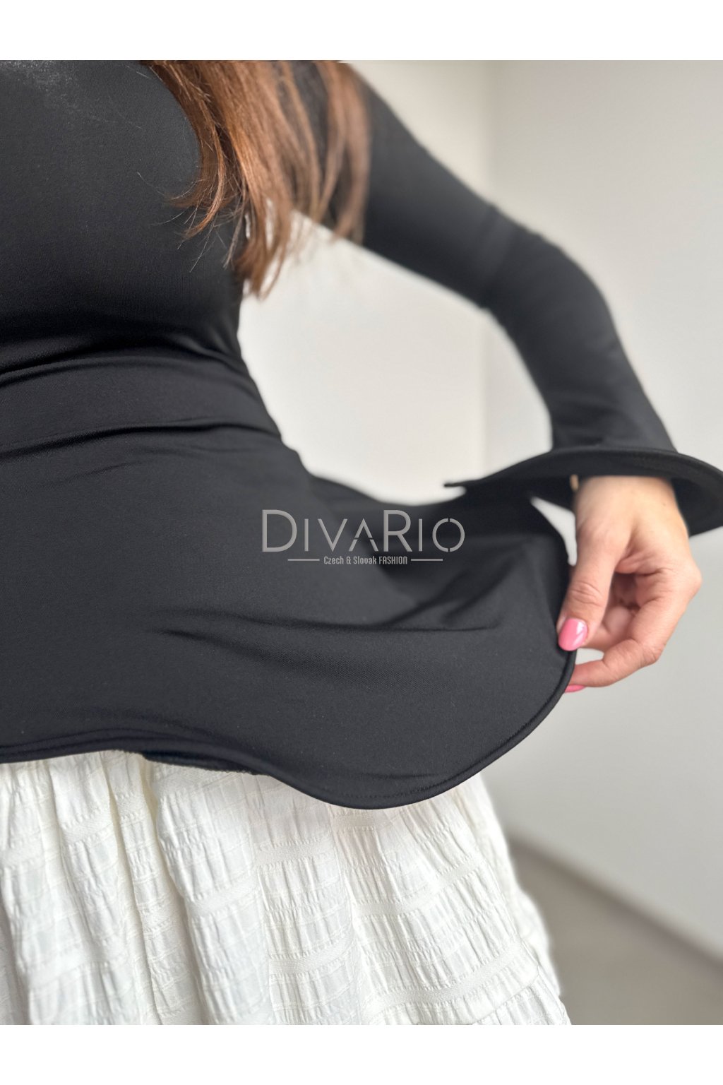 Obtihanutý čierny top s asymetrickým strihom, dlhý rukáv. Elastický materiál, na rukávoch a na spodku topu drôtik, ktorý pevne odstáva.
