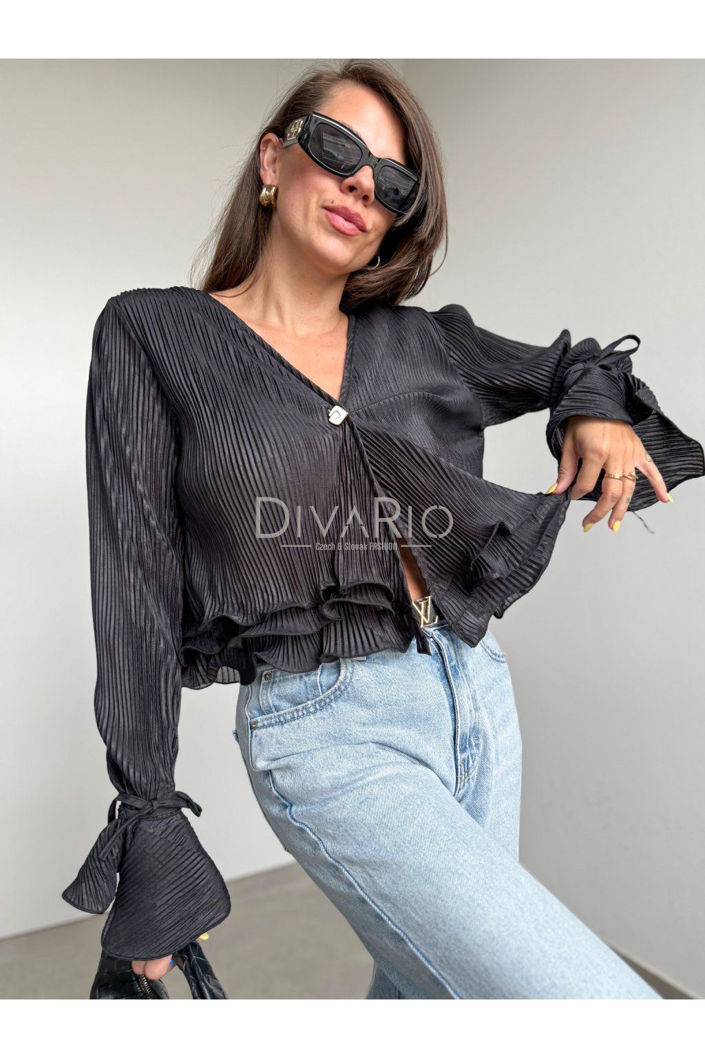 Čierny plisovaný saténový top s dlhým rukávom. Gombík, zvlnený spodok, zvonové manžety na rukávoch, ktoré si vytvoríme zviazaním prišitej šnúrky.