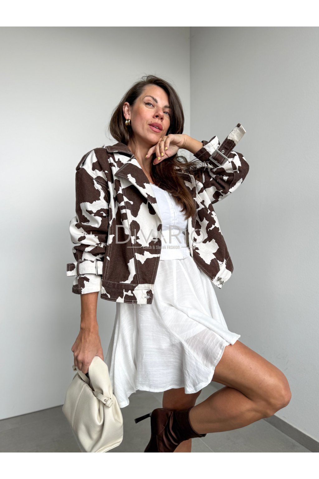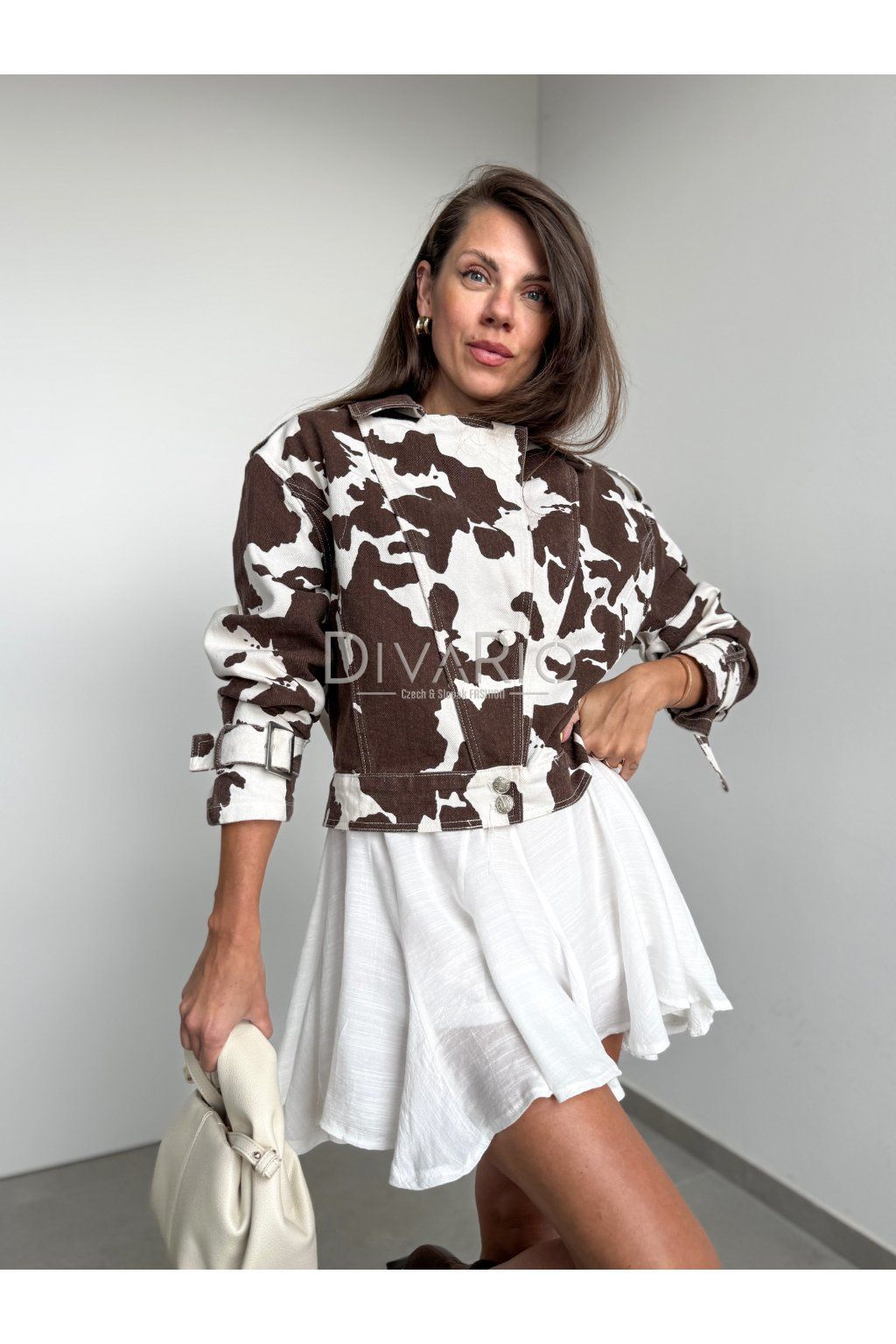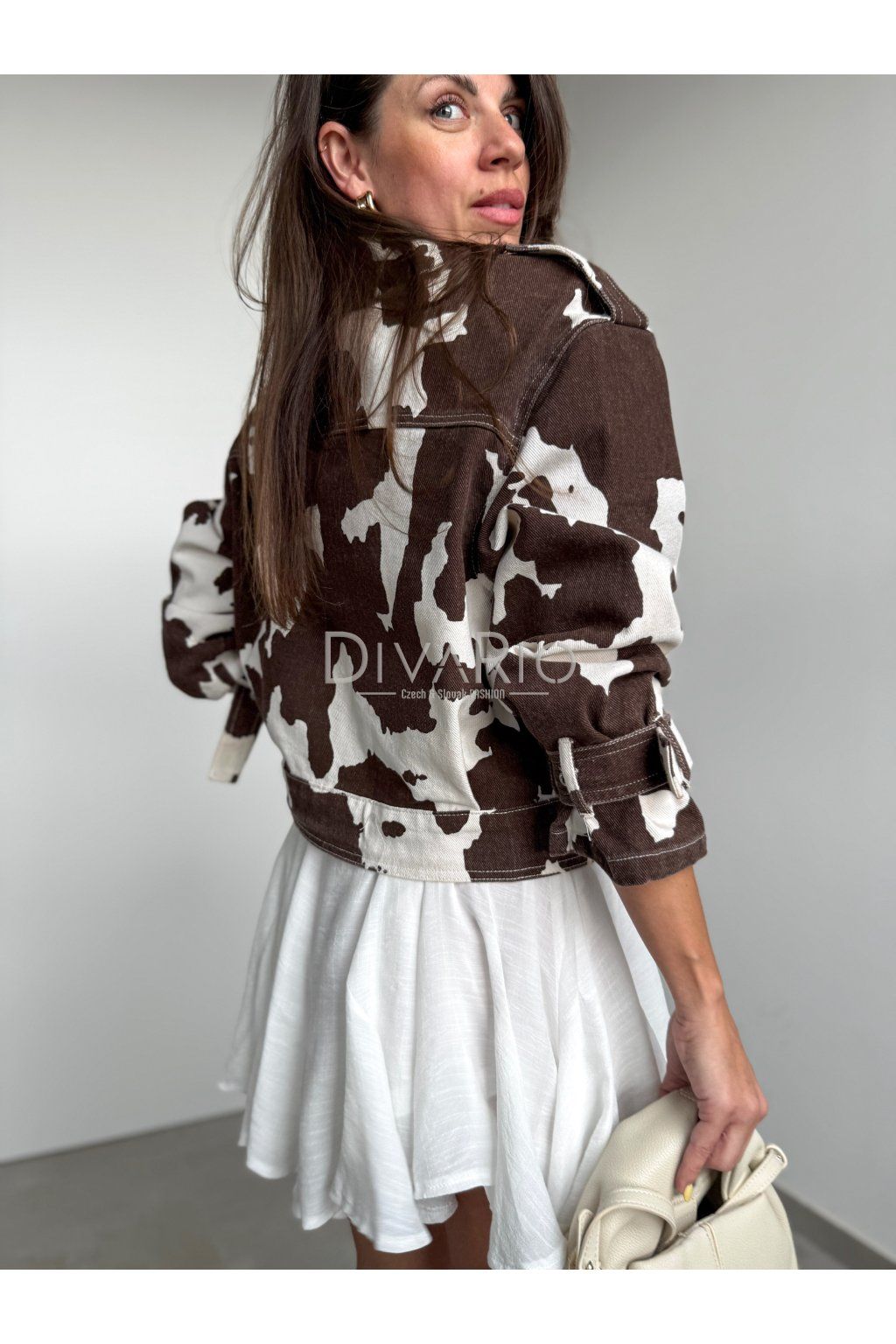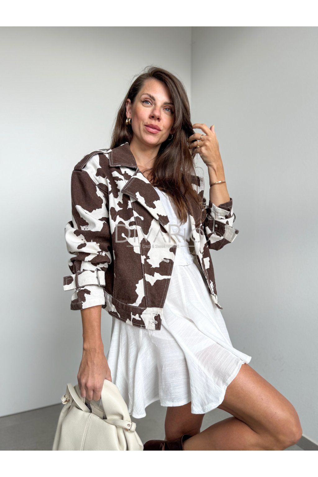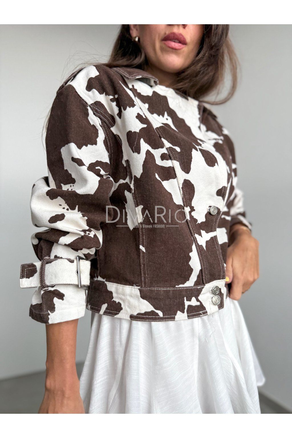 Rifľová oversize bunda s kravckou potlačou. Top kvalita, zapínanie na zips a gombíky, opasky na rukávoch.