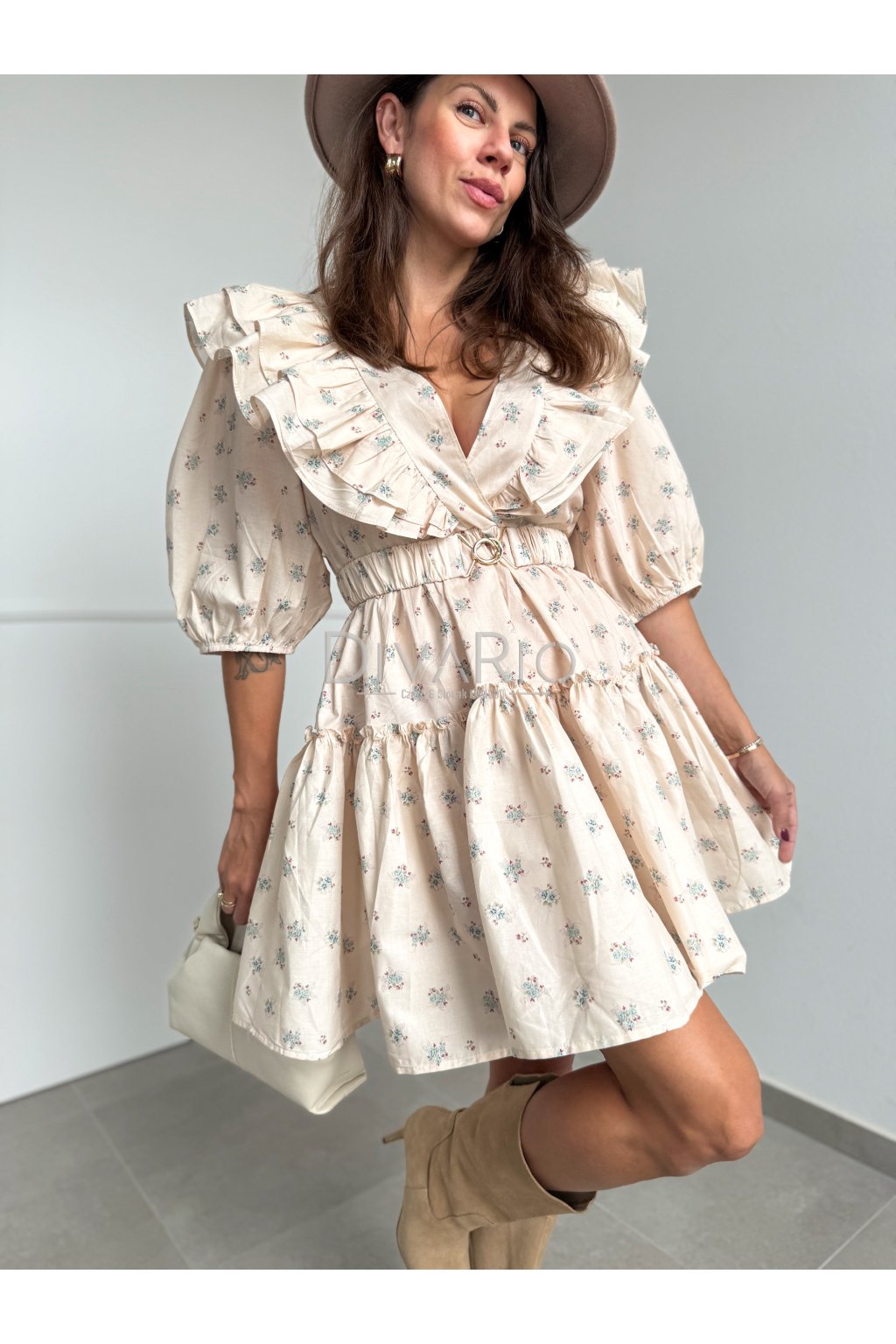 Bežové šaty s mini kvetinkami, presstrihnuté v pase, košeľový materiál. Opasok s prackou súčasťou šiat.