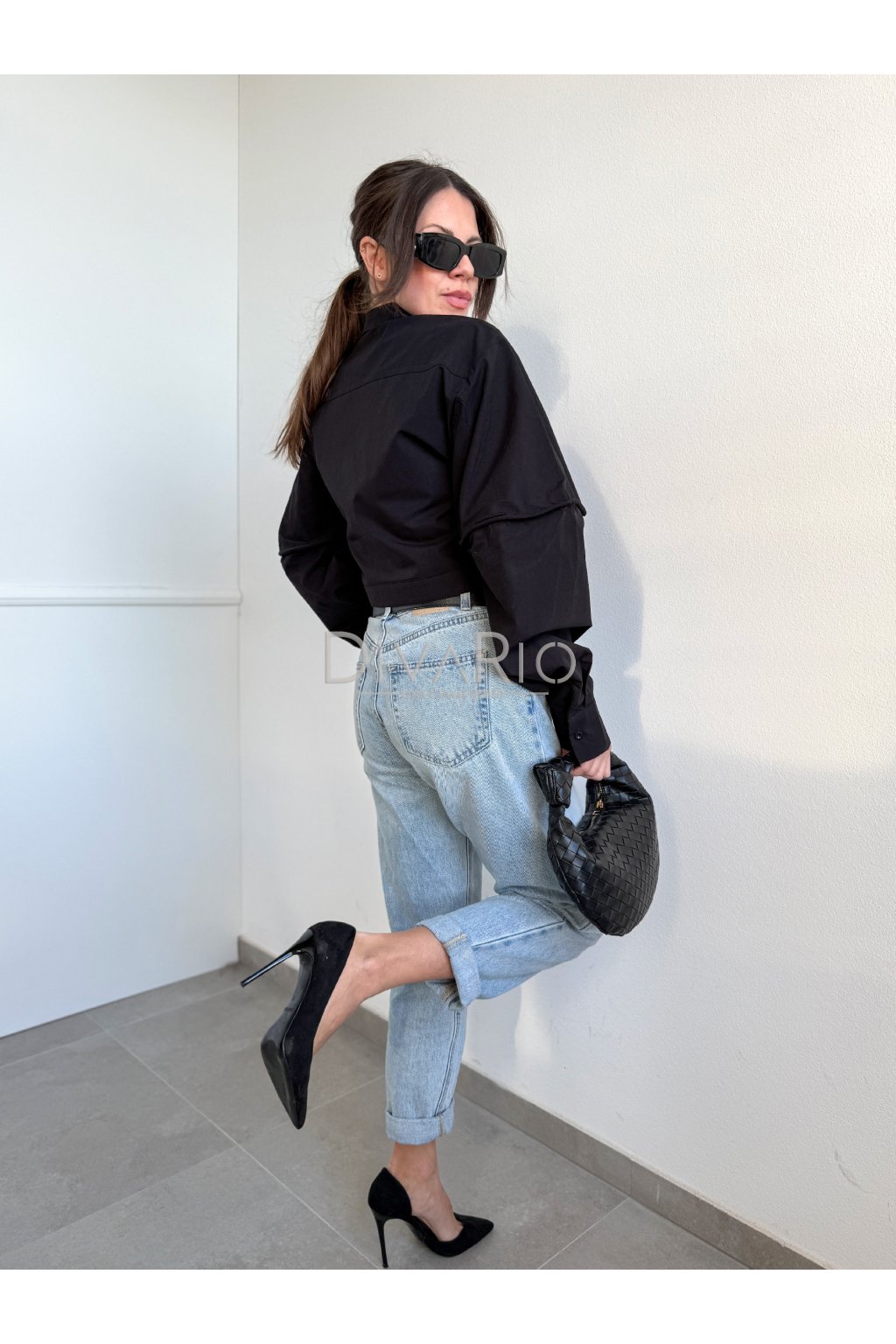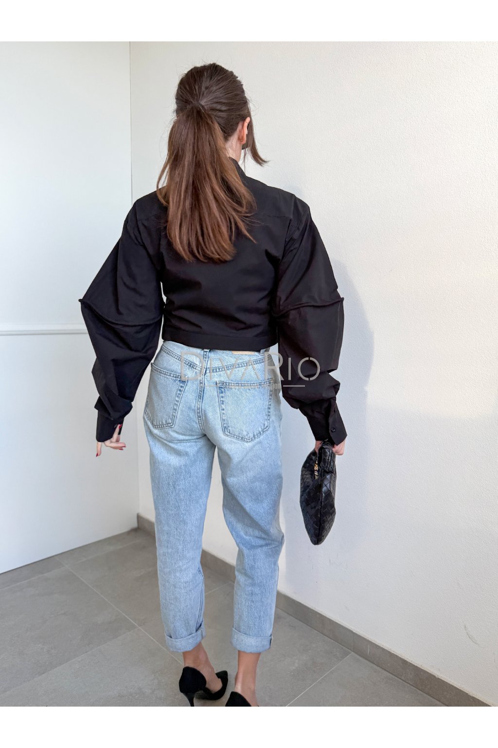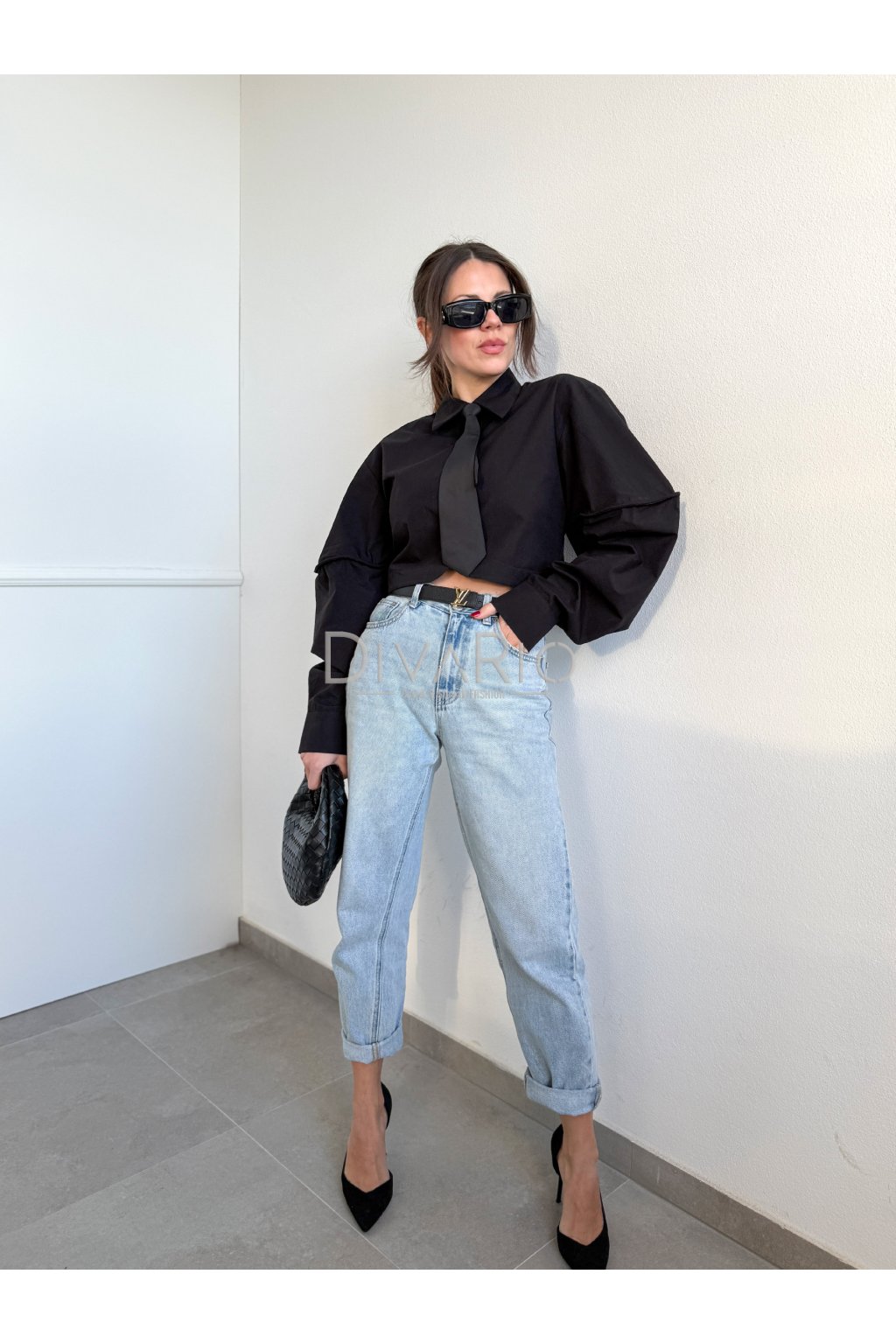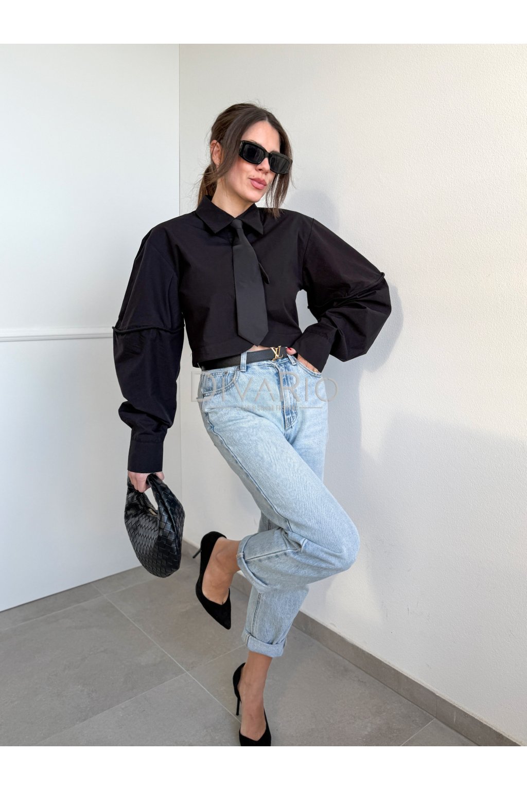 Crop košeľa v čiernej fabre s kravatou, bavlnený materiál, rozšířené rukávy. Kravata je pouzitelna aj pre iny outfit. Zužovanie a rozopinanie kravaty na skryty zips.