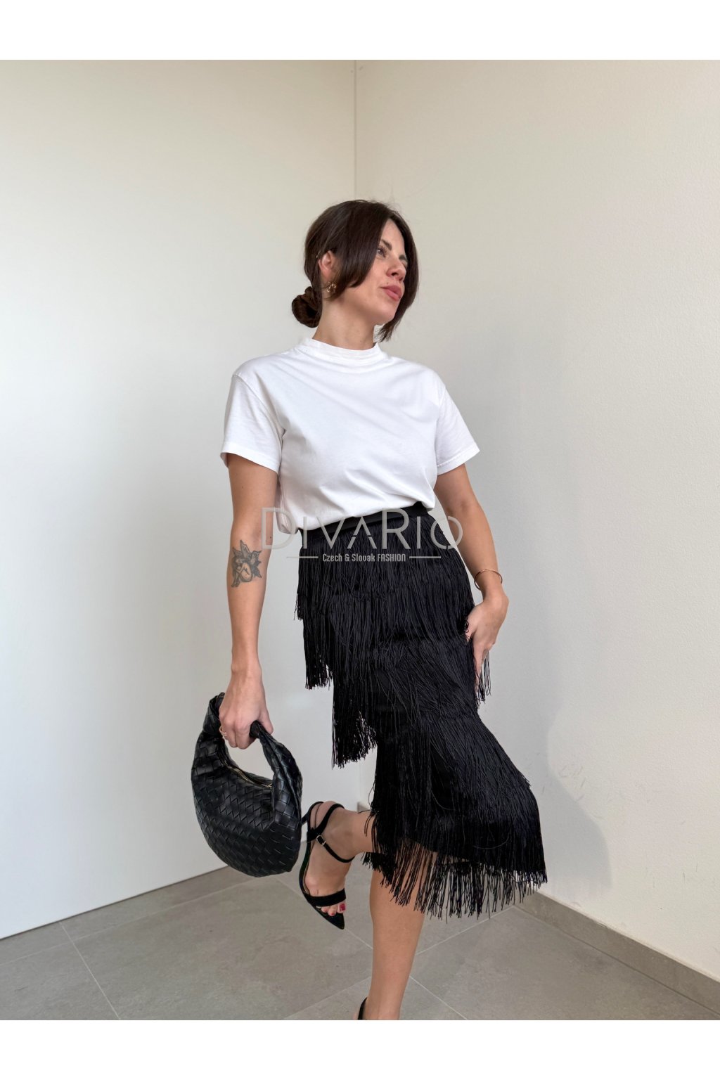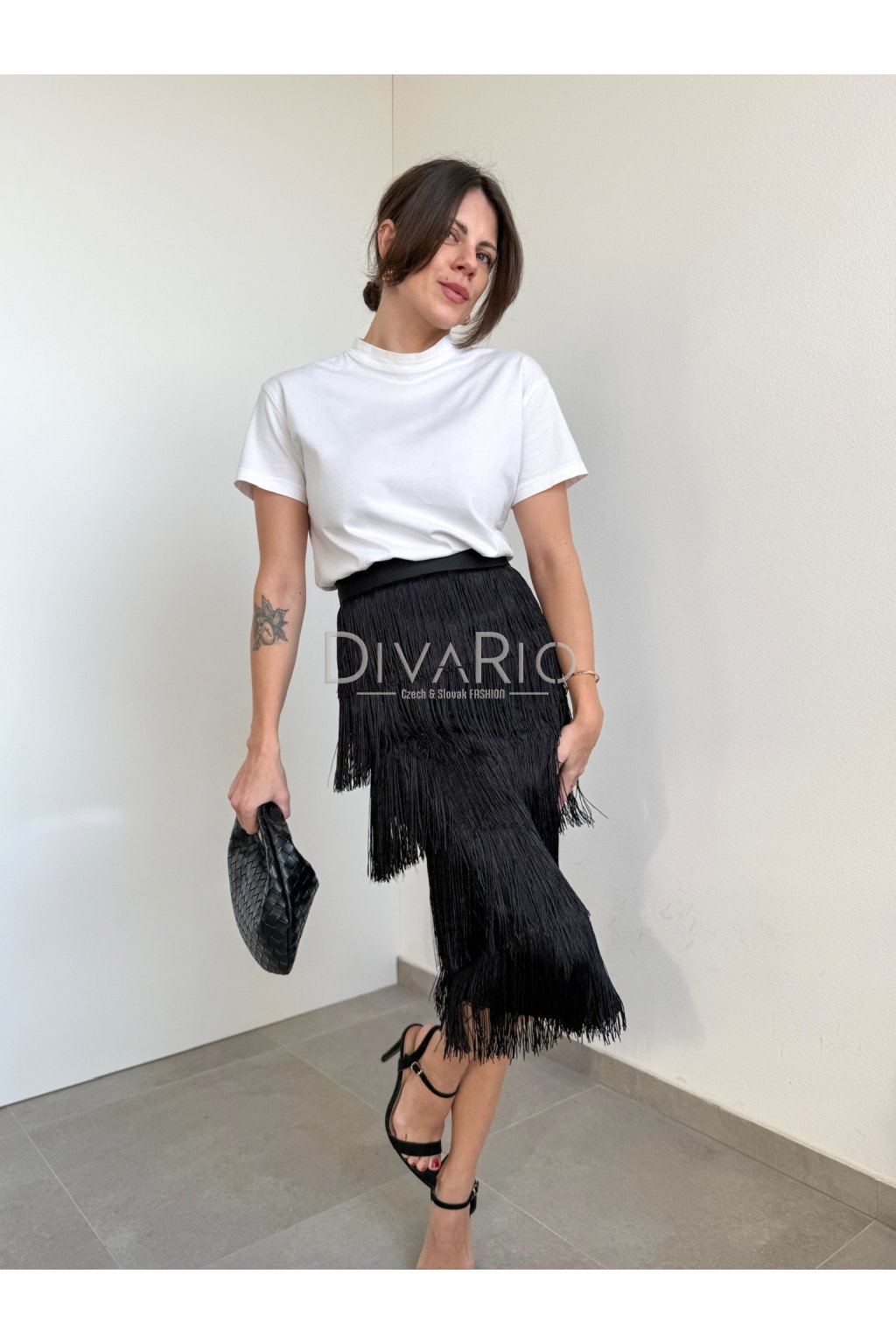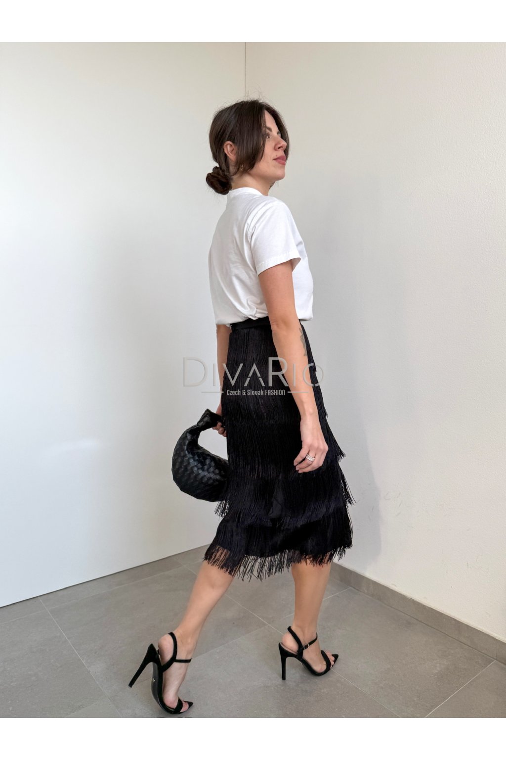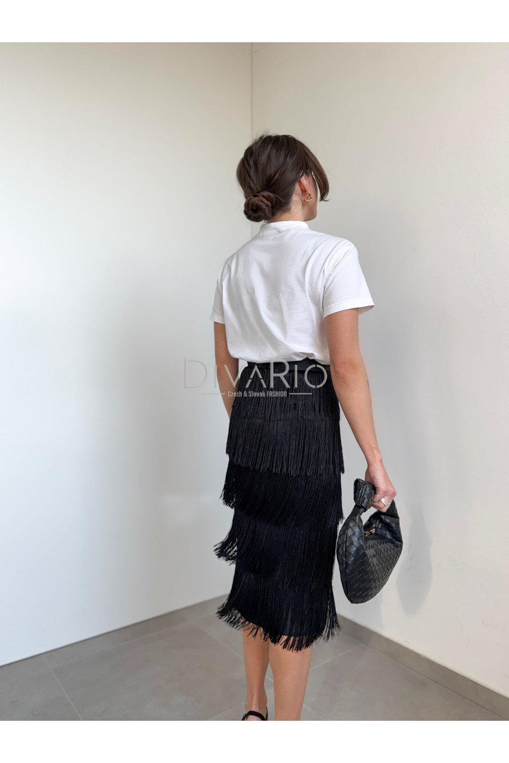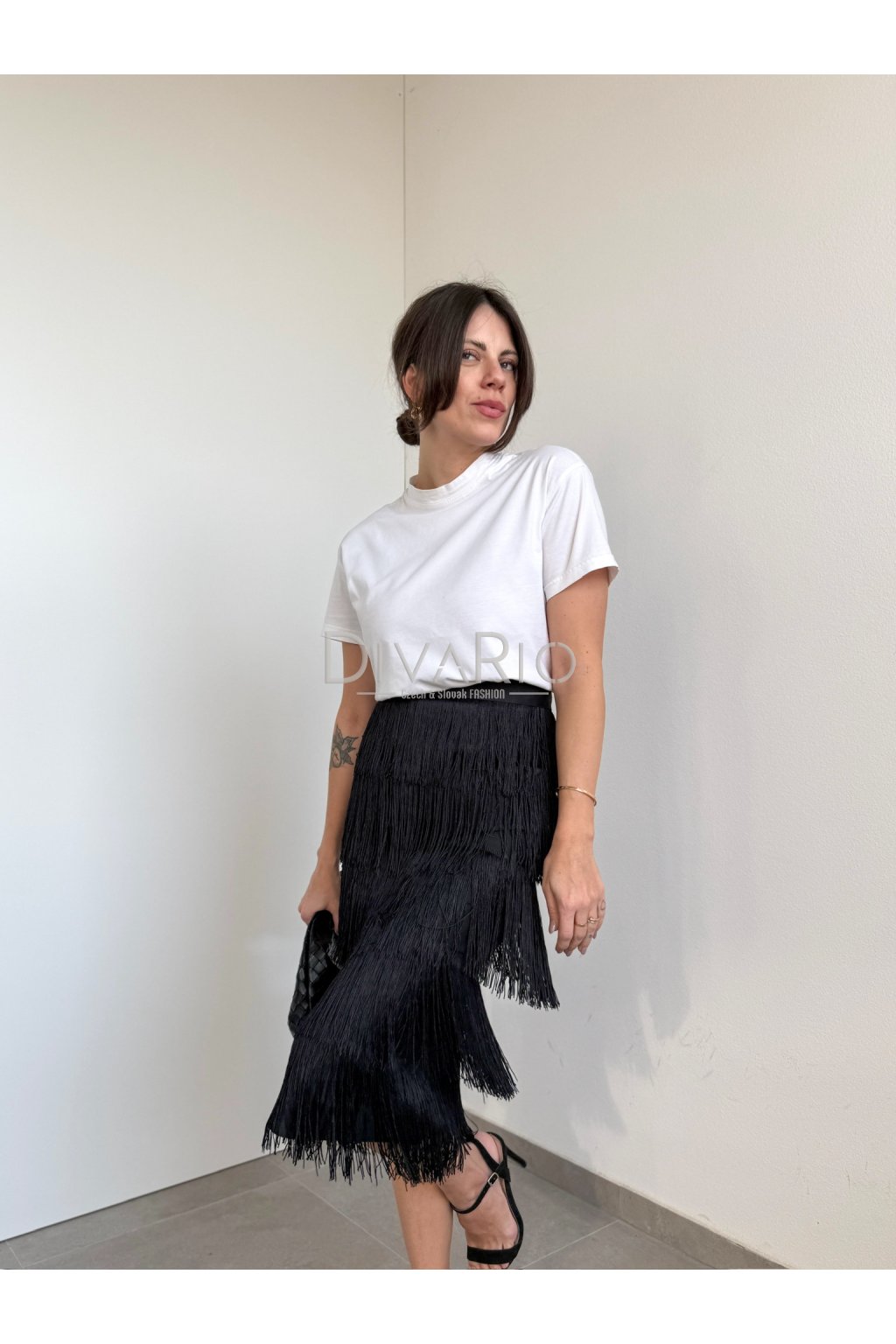 Dlhá čierna sukňa so strapcami, vysoký pas.