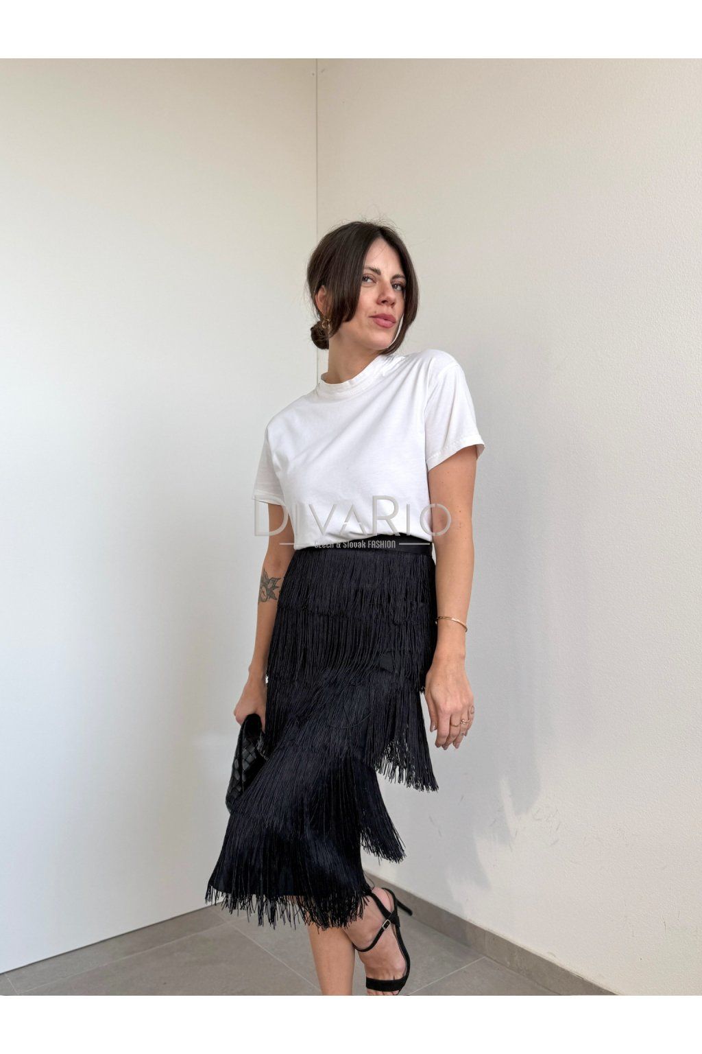 Midi čierna sukňa so strapcami, vysoký pas. Elastický materiál, odporúčame zvoliť o číslo väčšiu veľkosť.