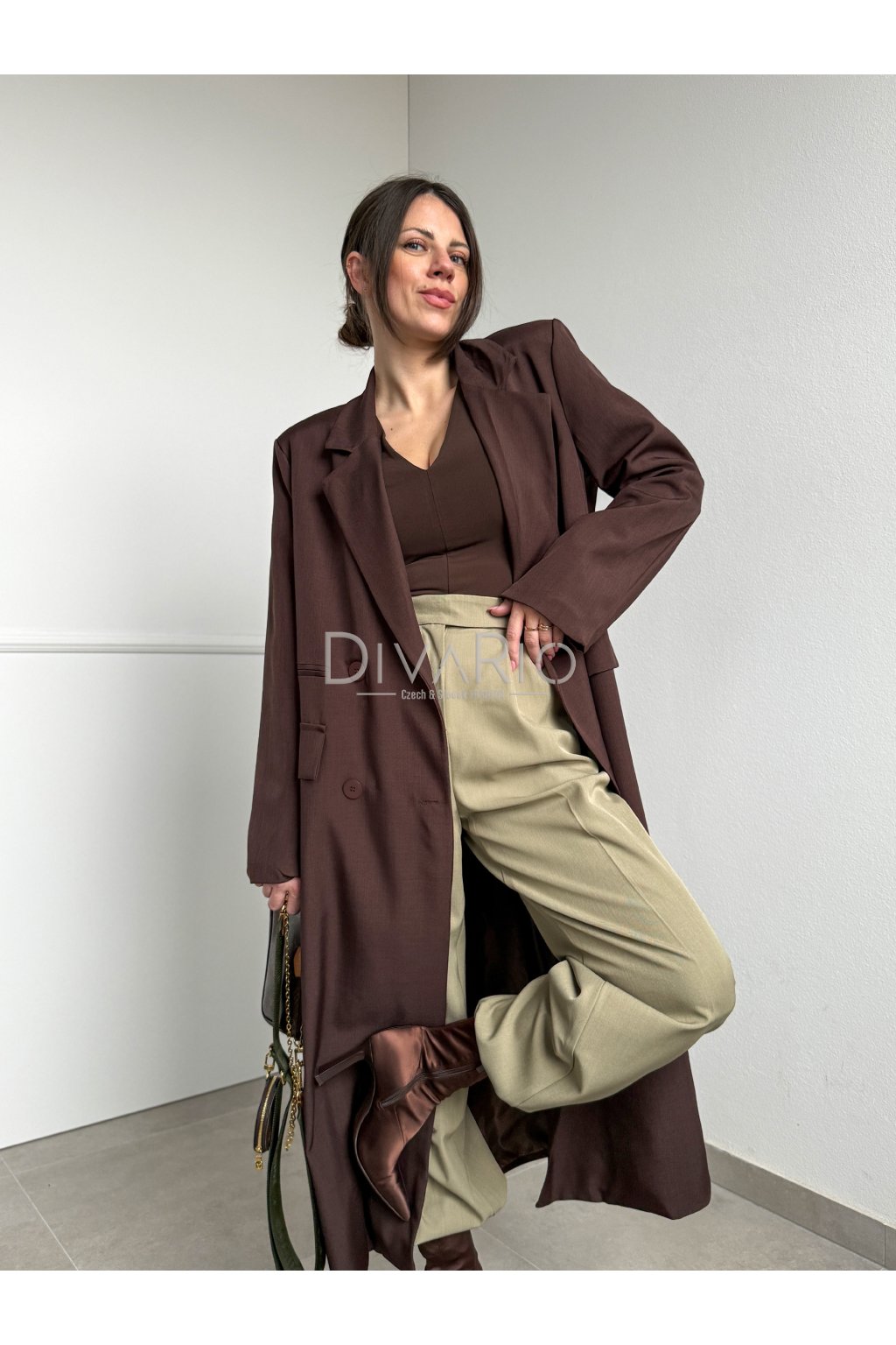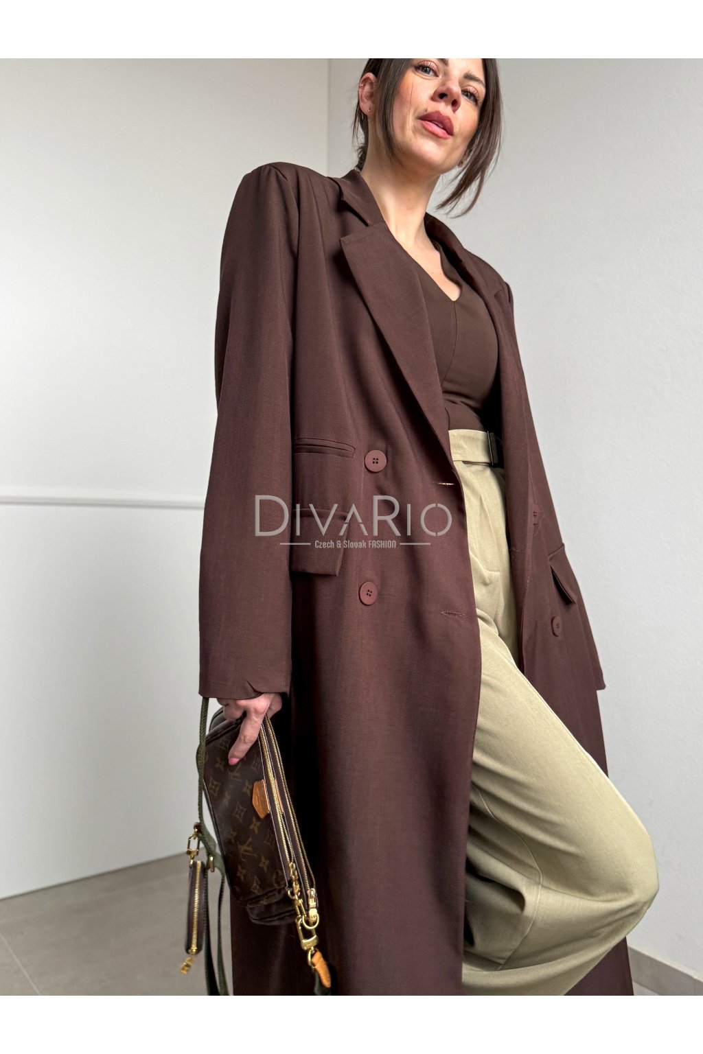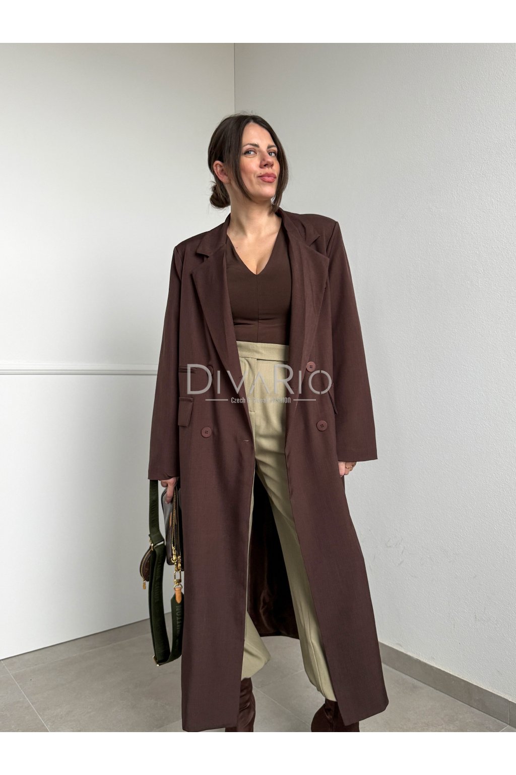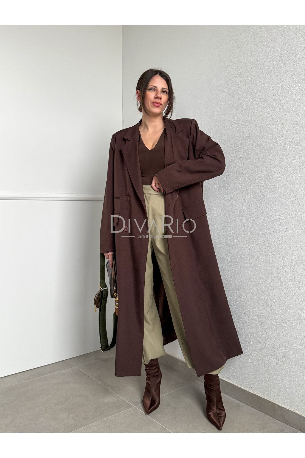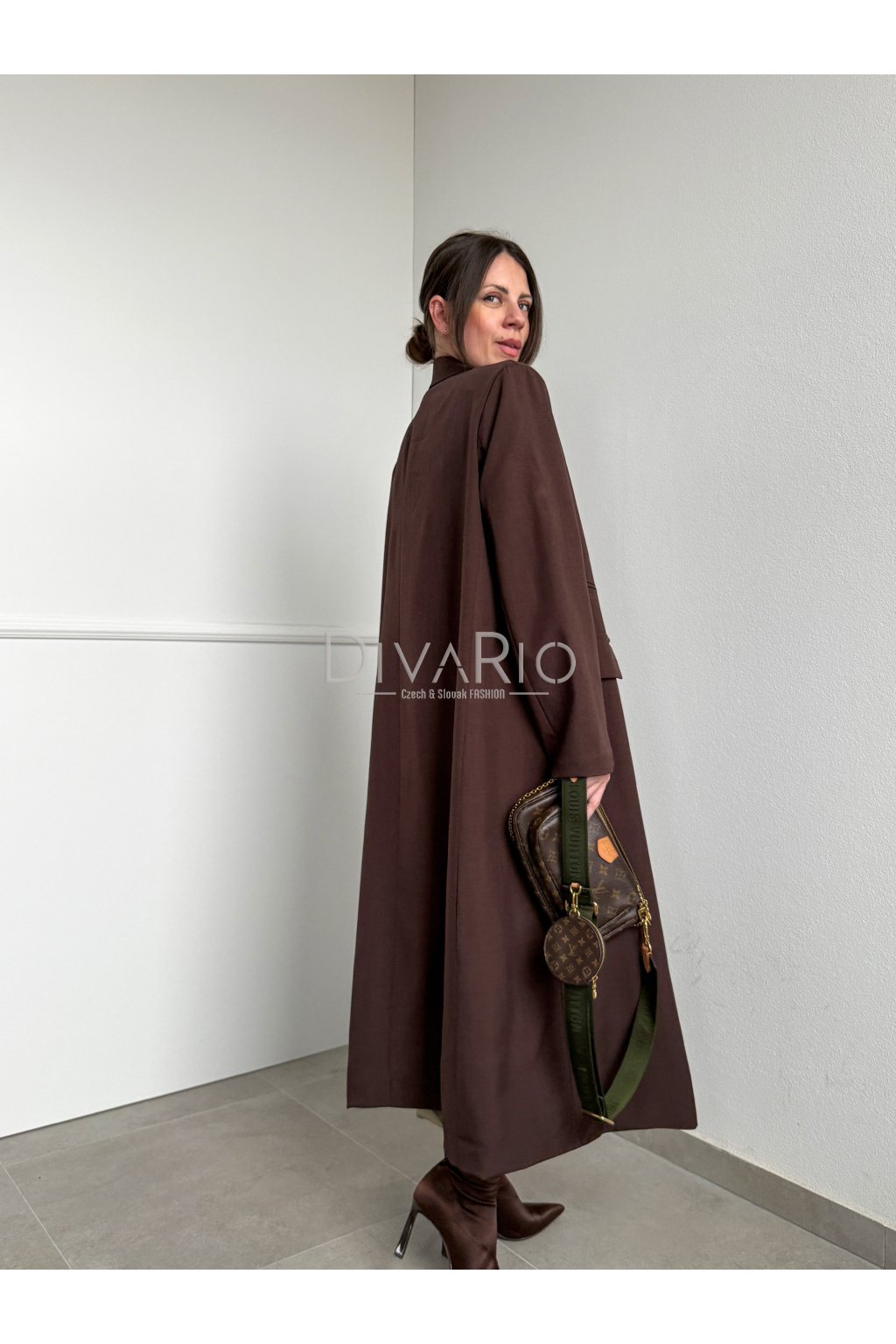 Dlhý tmavo hnedý prechodný kabát, futrovaný, dlbhý rukáv, zapínanie na gombíky.