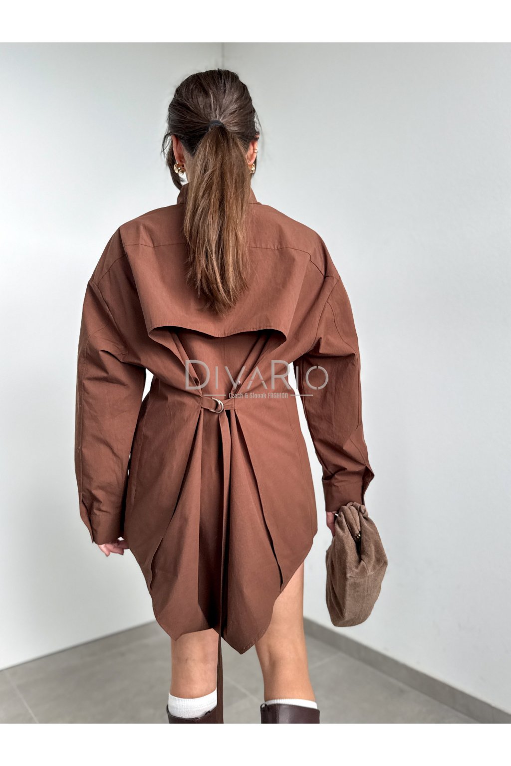 Predĺžená koľeľa v čokoládovej hnedej farbe, dlhý rukáv, stiahnutie na chrbte, zapínanie na gombíky.