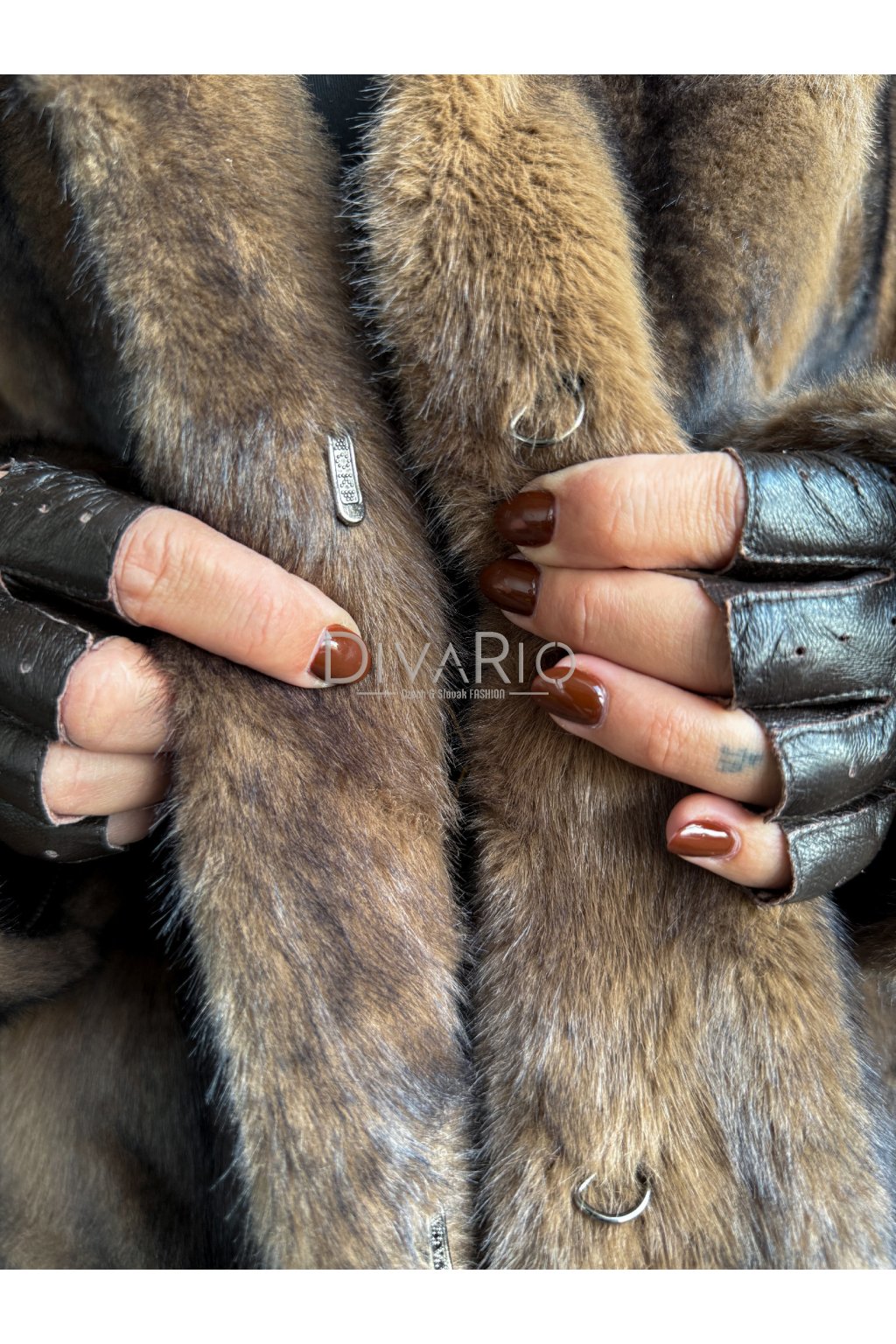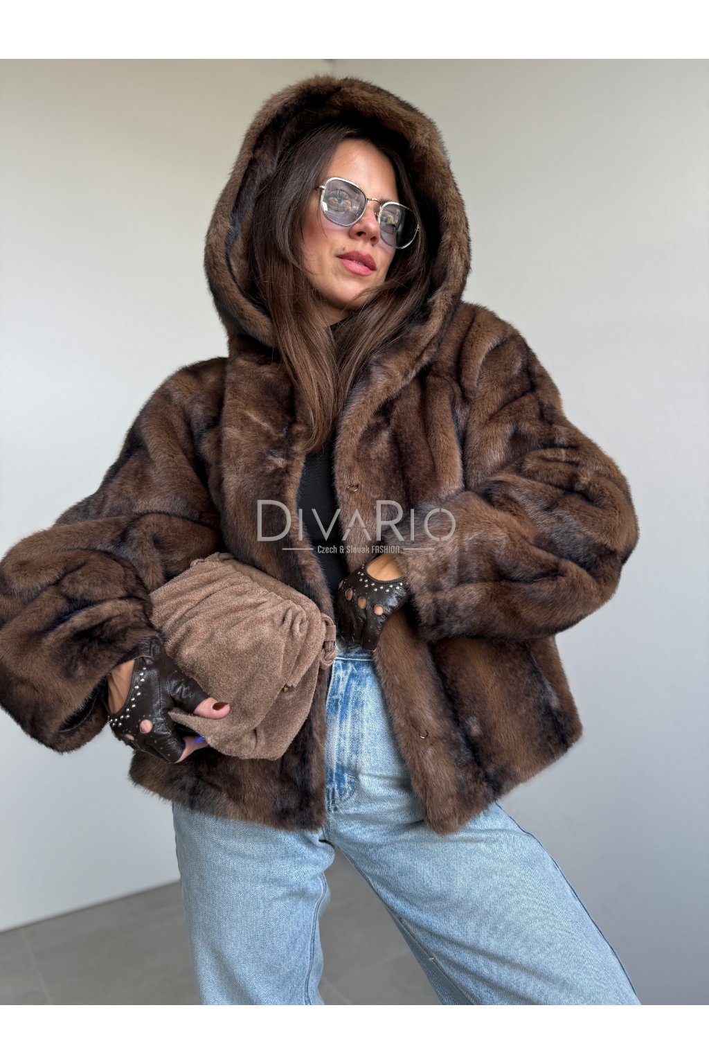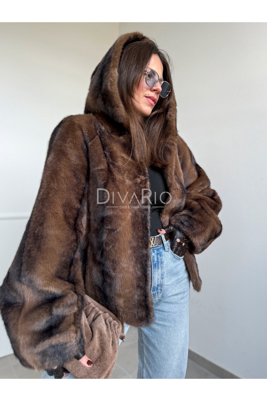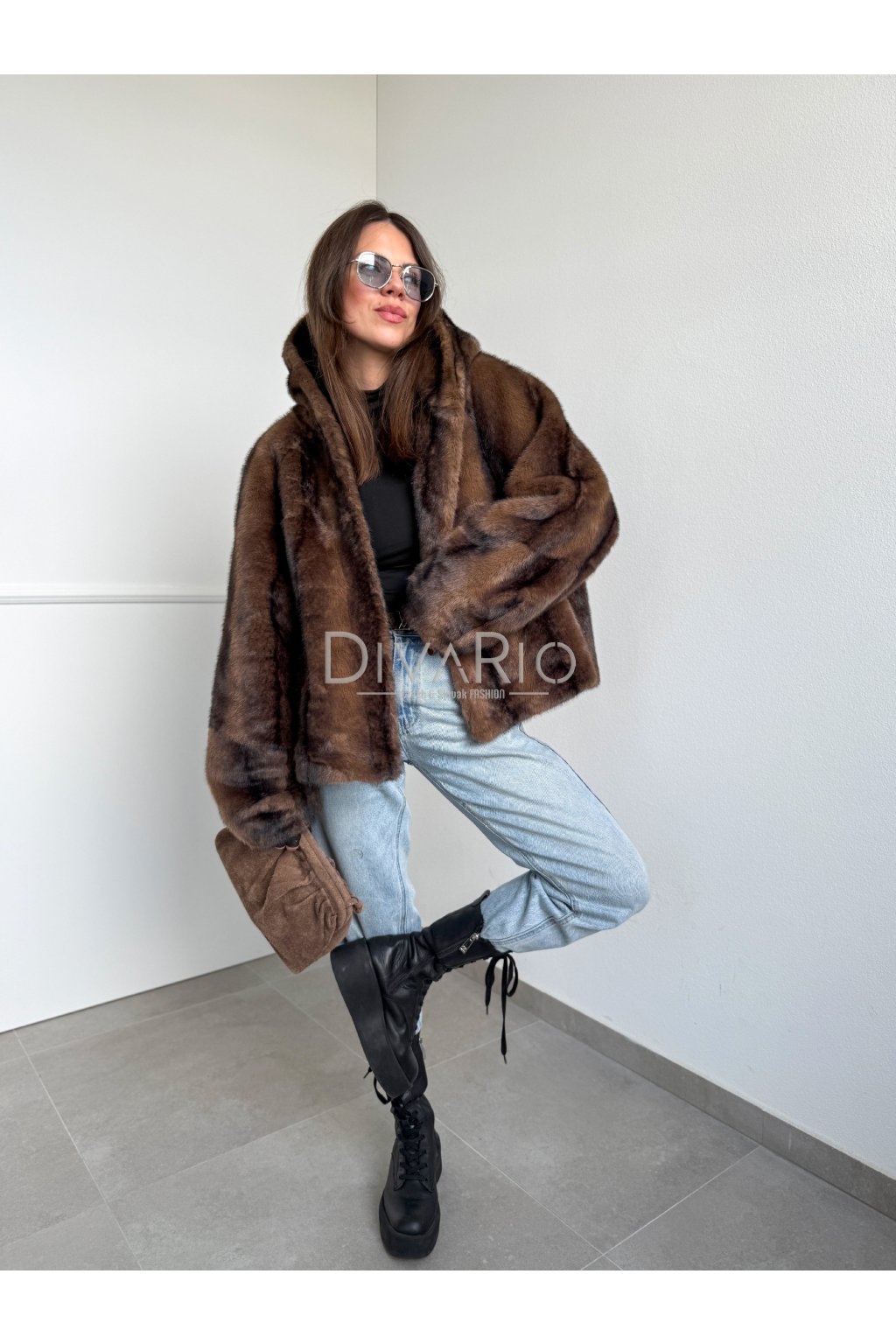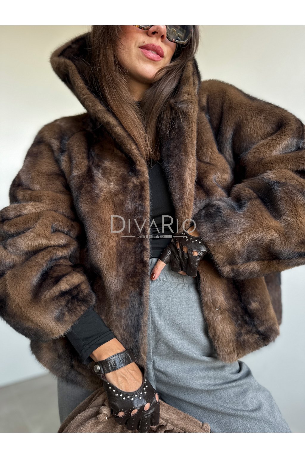 Tmavo hnedý kožuštek v top kvalite. Dlhý rukáv, podšívka. Zapínanie na koníčky, mohutná kapucňa.