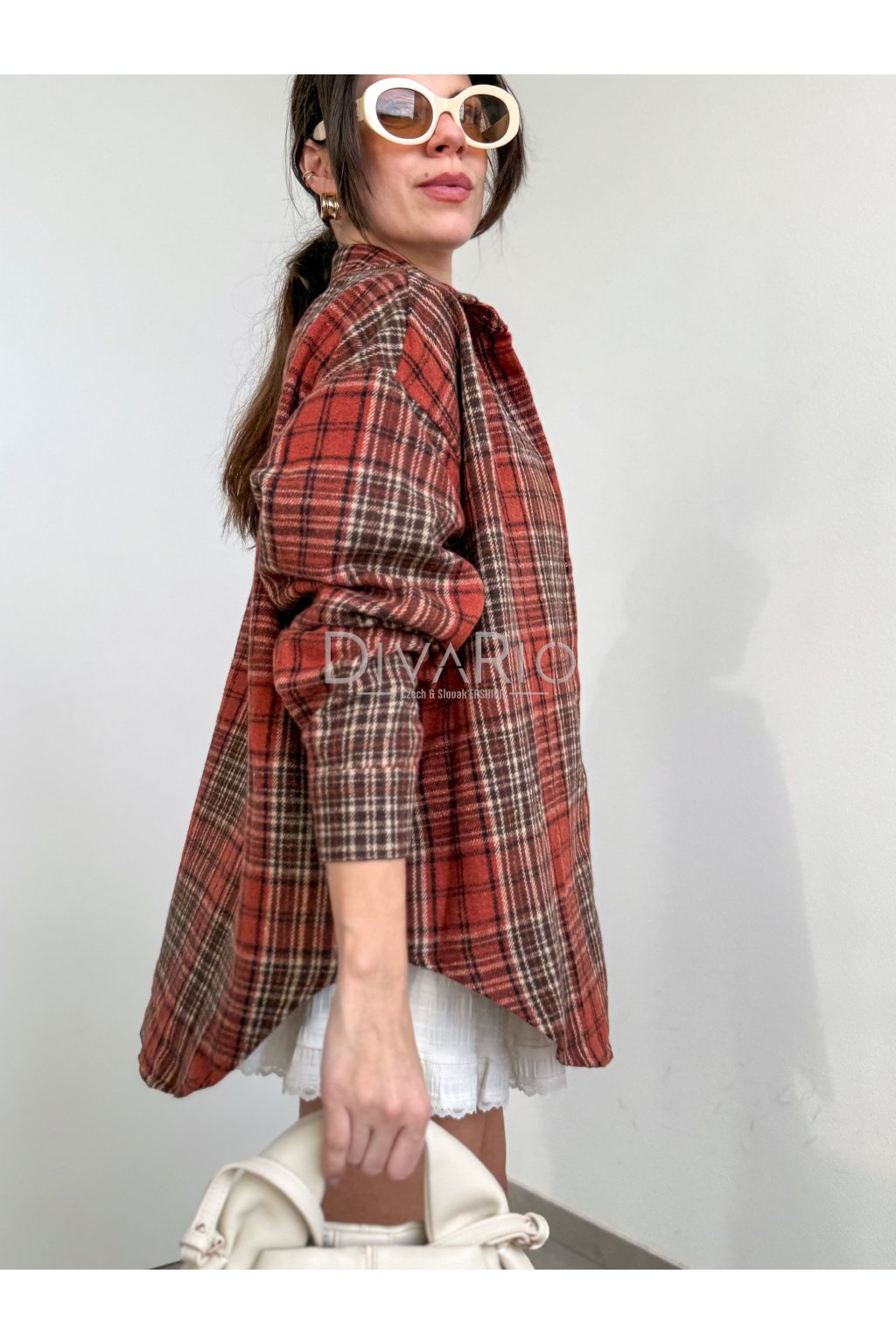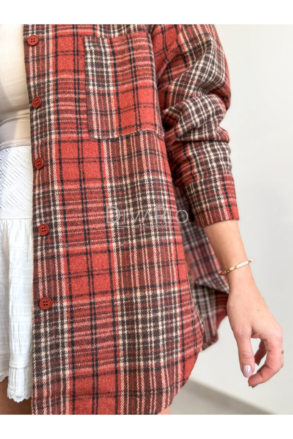 Kockovaná flanelová košeľa v červených odtieňoch. Dlhý rukáv, zapínanie na gombíky.