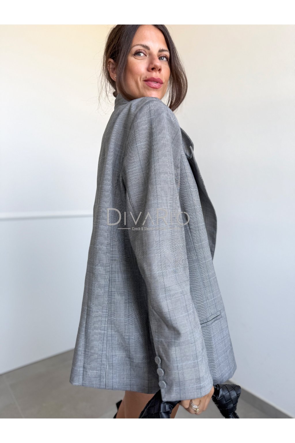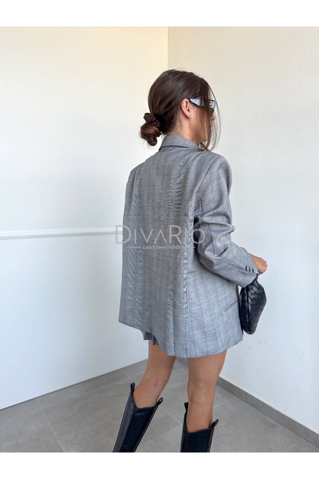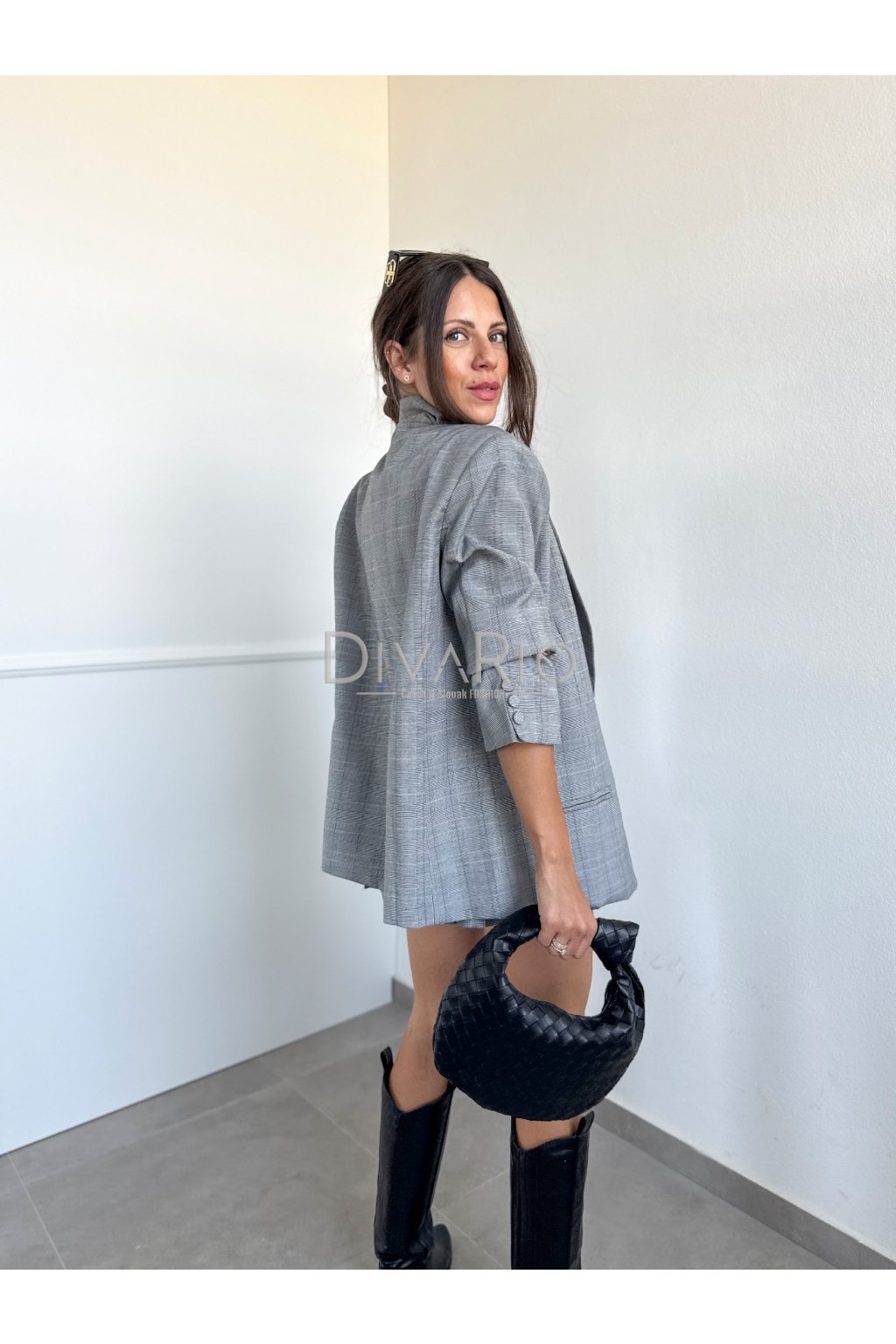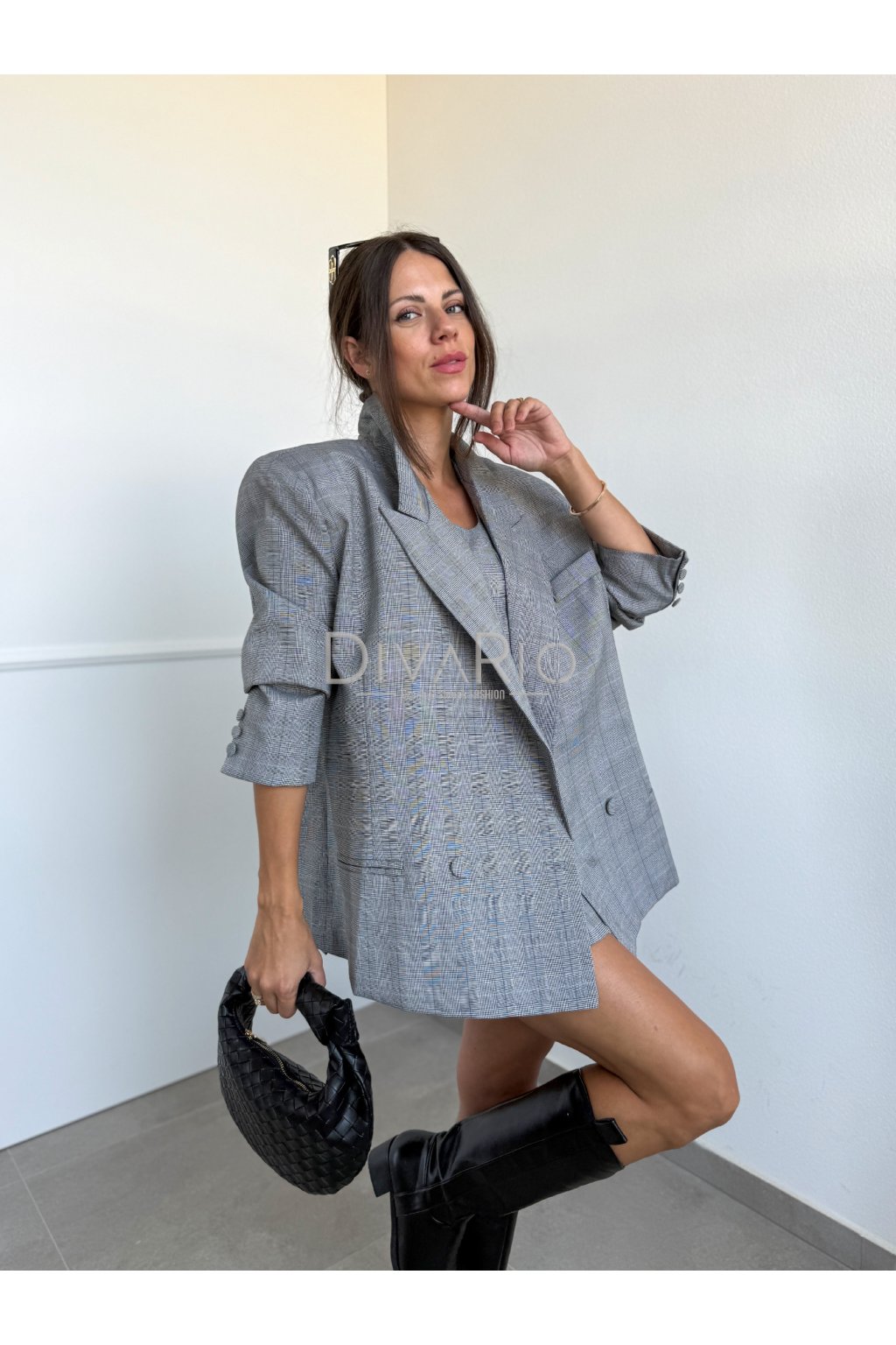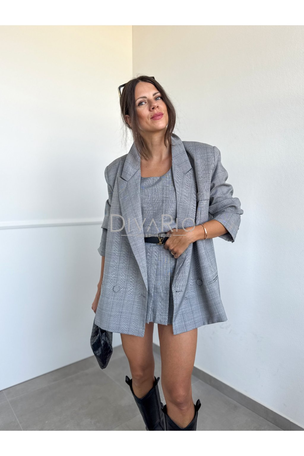 Skladané šaty s oversize sakom v sete. Kockovaný šedý vzor, dosť oversize sako, šaty s hrubými ramienkami a putkami na opasok.