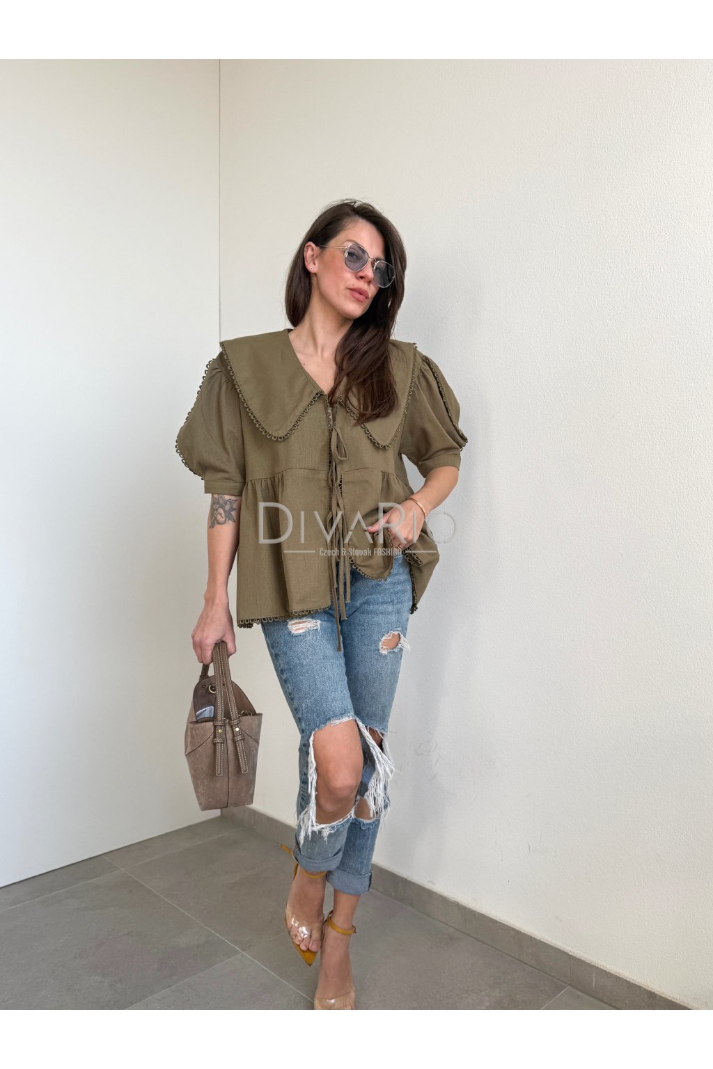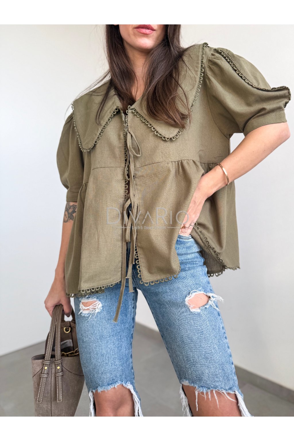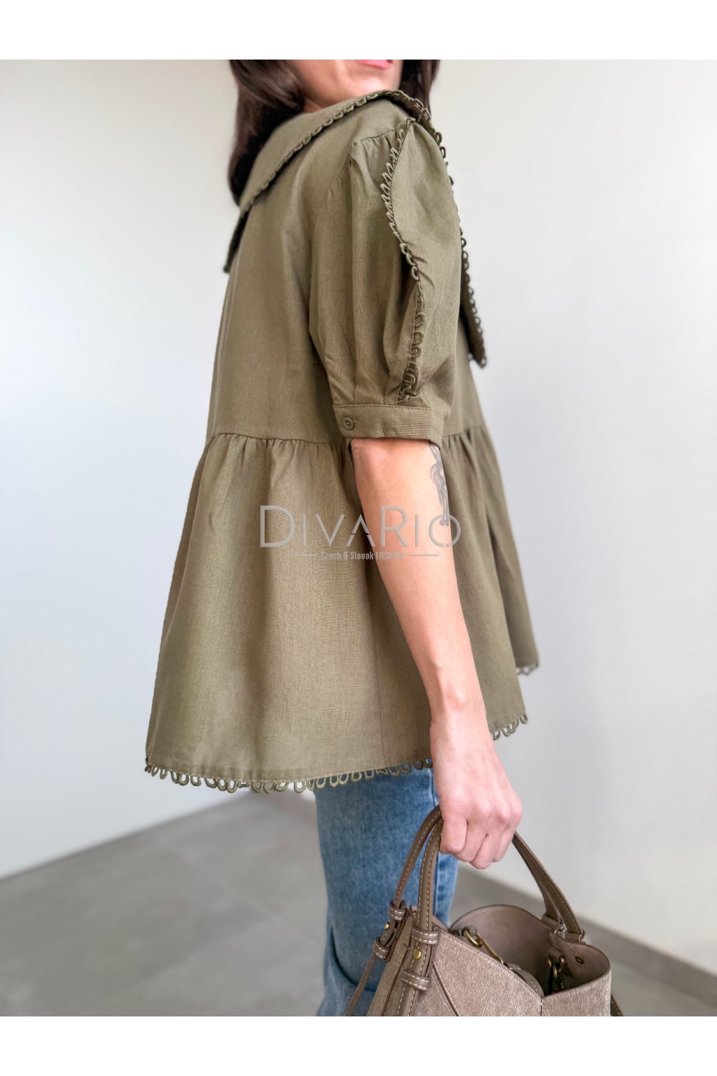Khaki zelená ľanová košeľa s viazaním, krátky puff rukáv, golierik. Top kvalita, viazanie v prednewj časti, balonove krátke rukávy, oversize strih,