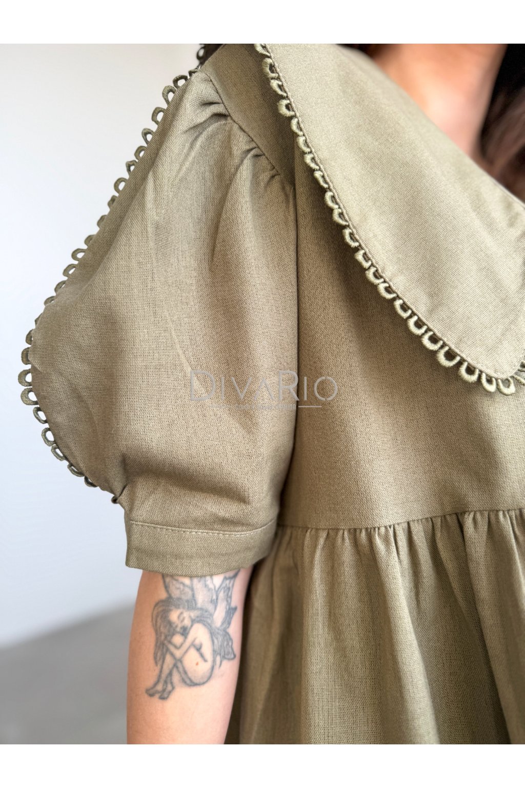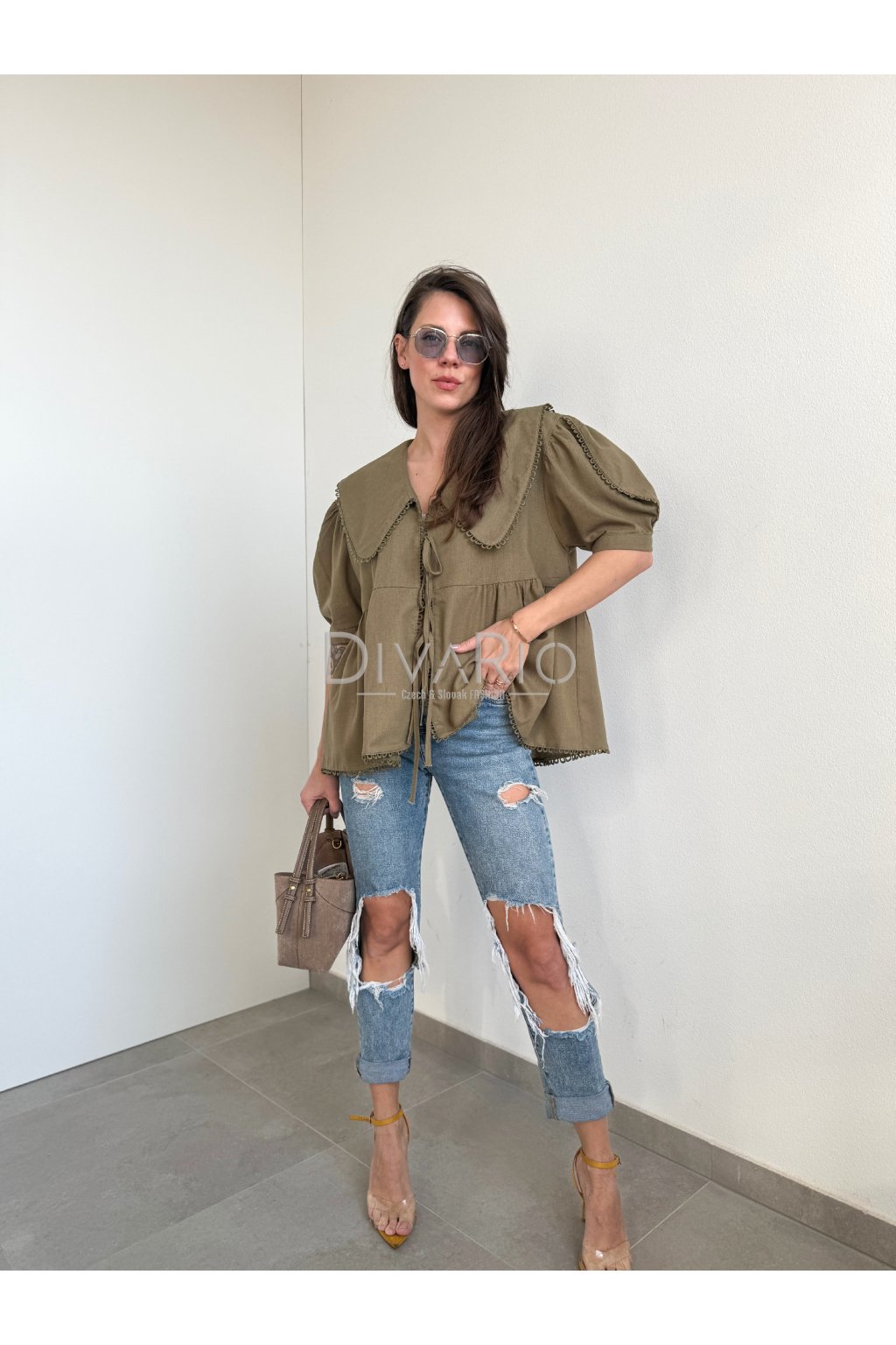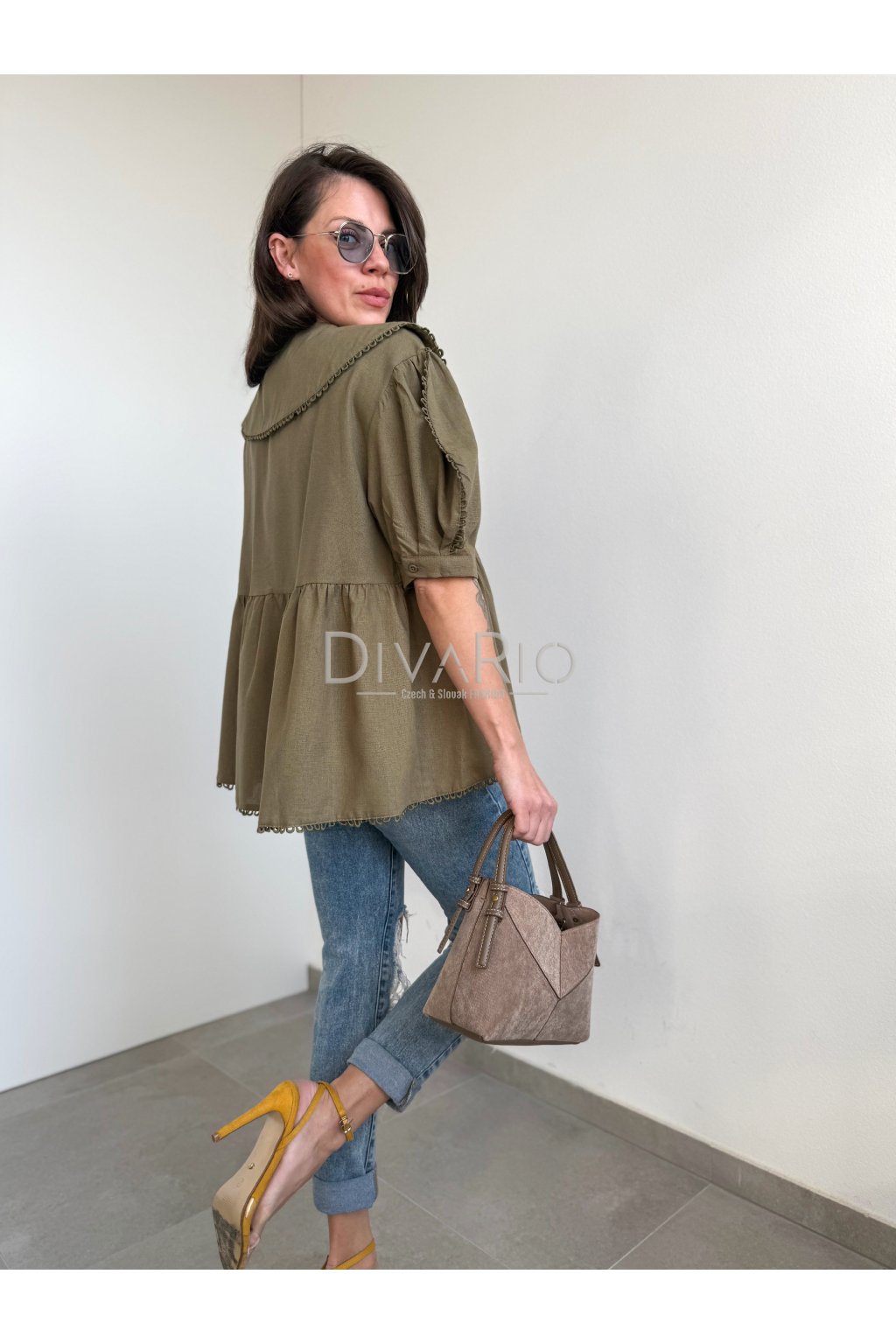 Khaki zelená ľanová košeľa s viazaním, krátky puff rukáv, golierik. Top kvalita, viazanie v prednewj časti, balonove krátke rukávy, oversize strih,