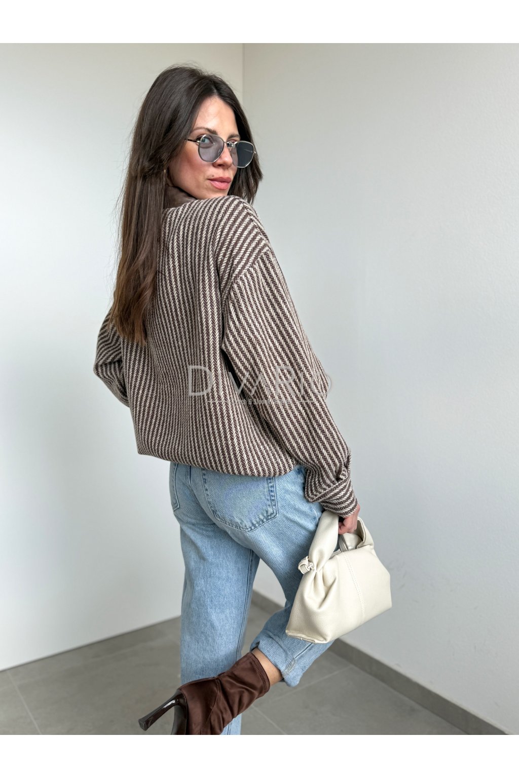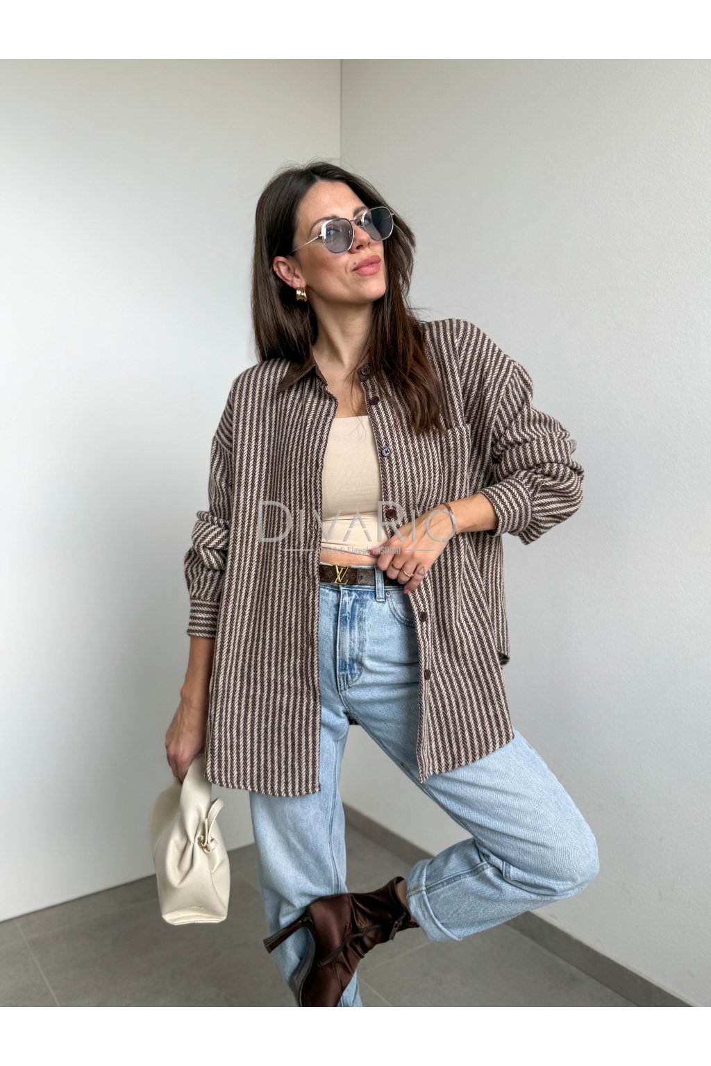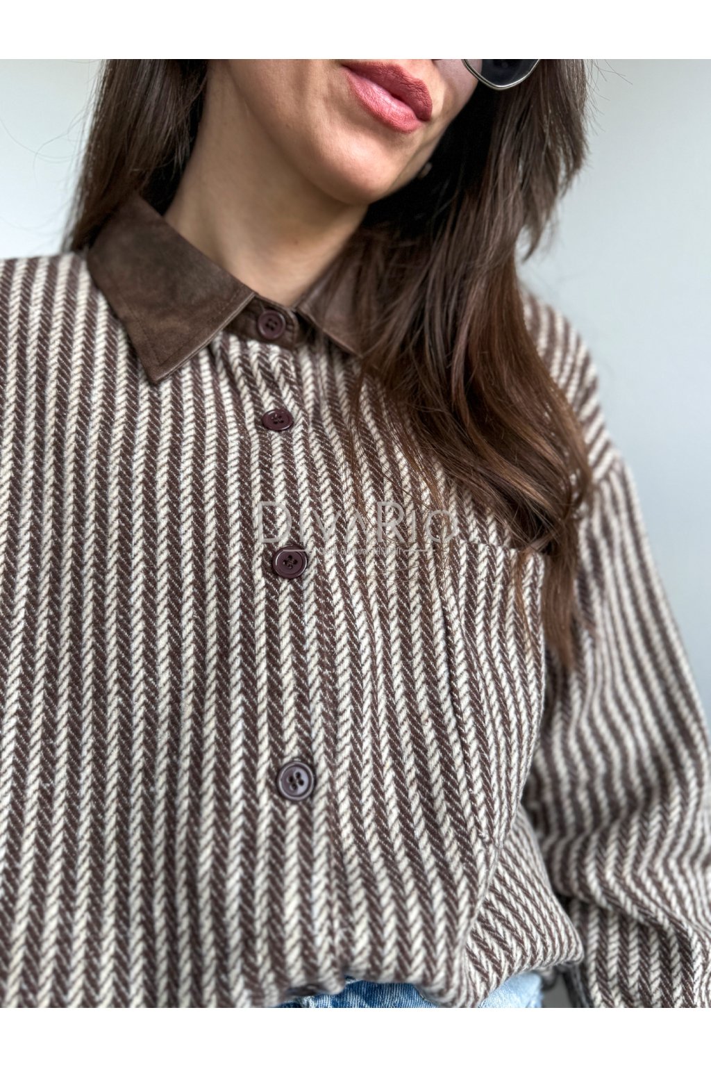 Prúžkovaná košeľa s koženkovým detailom na golieri, zapínanie na gombíky. Dlhý rukáv. Možné využiť ako top ako bundu, pod bundu na vrstvenie alebo okolo pasu.