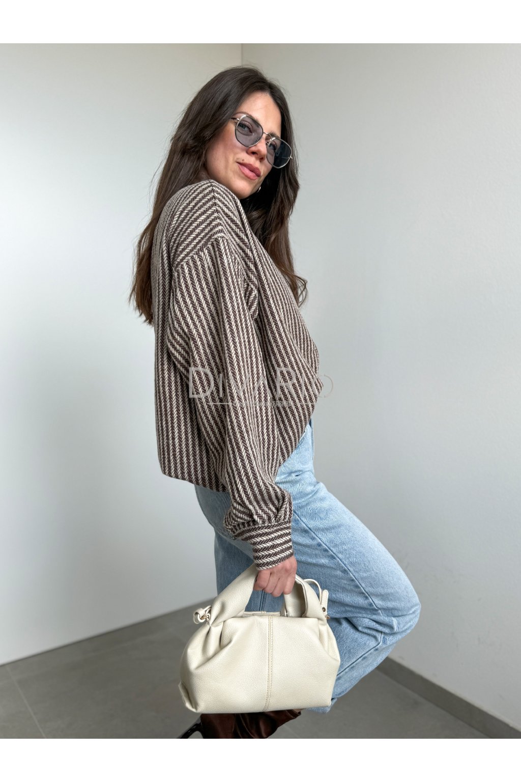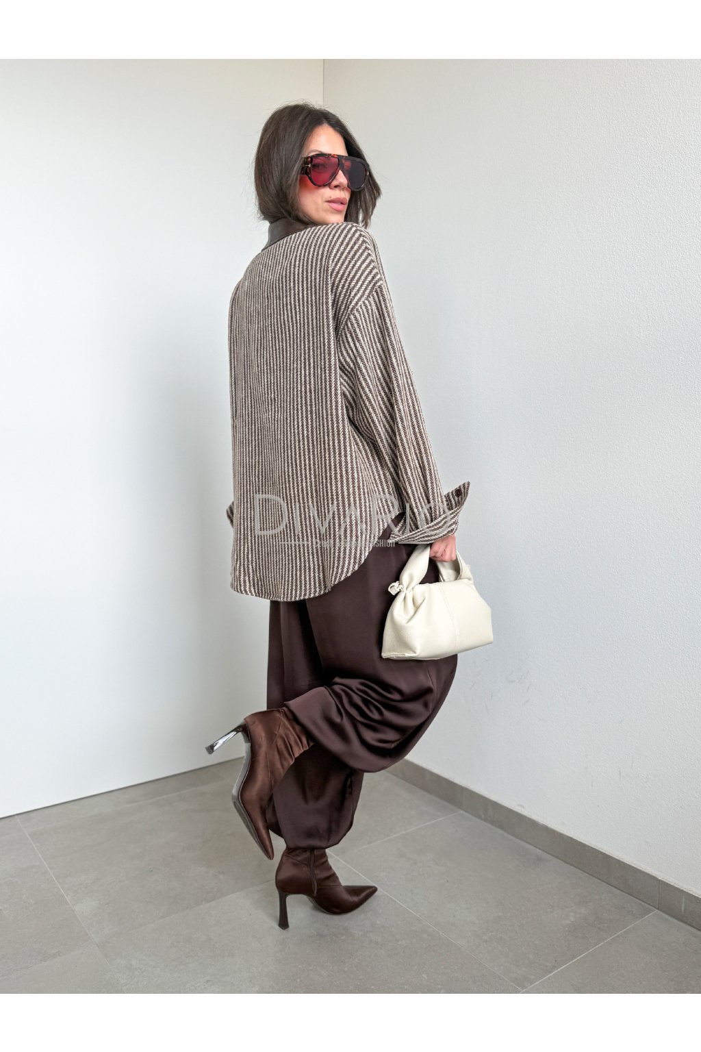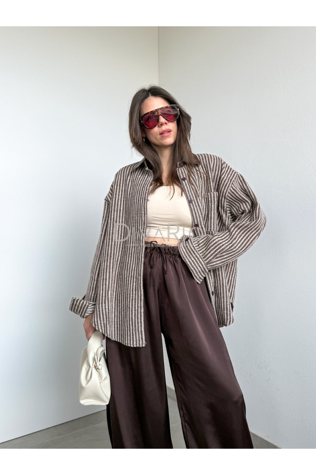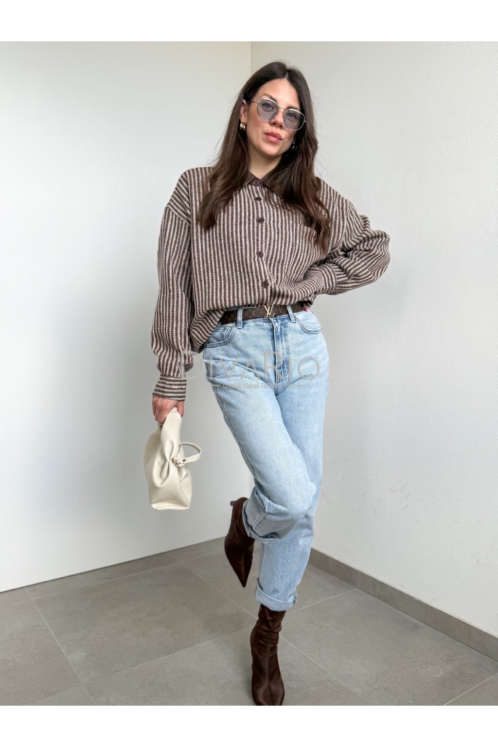 Prúžkovaná košeľa s koženkovým detailom na golieri, zapínanie na gombíky. Dlhý rukáv. Možné využiť ako top ako bundu, pod bundu na vrstvenie alebo okolo pasu.