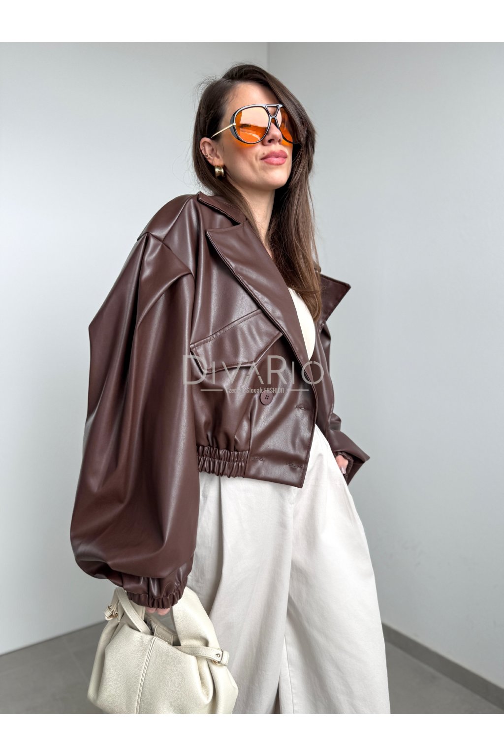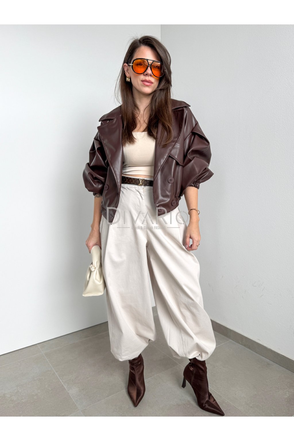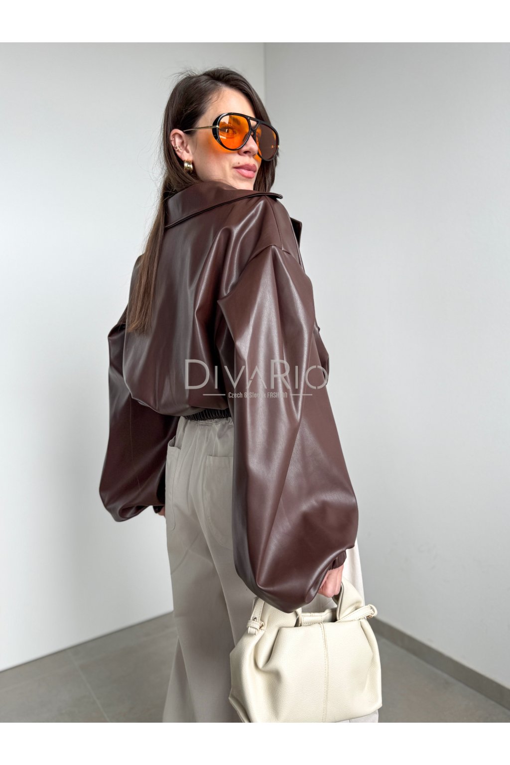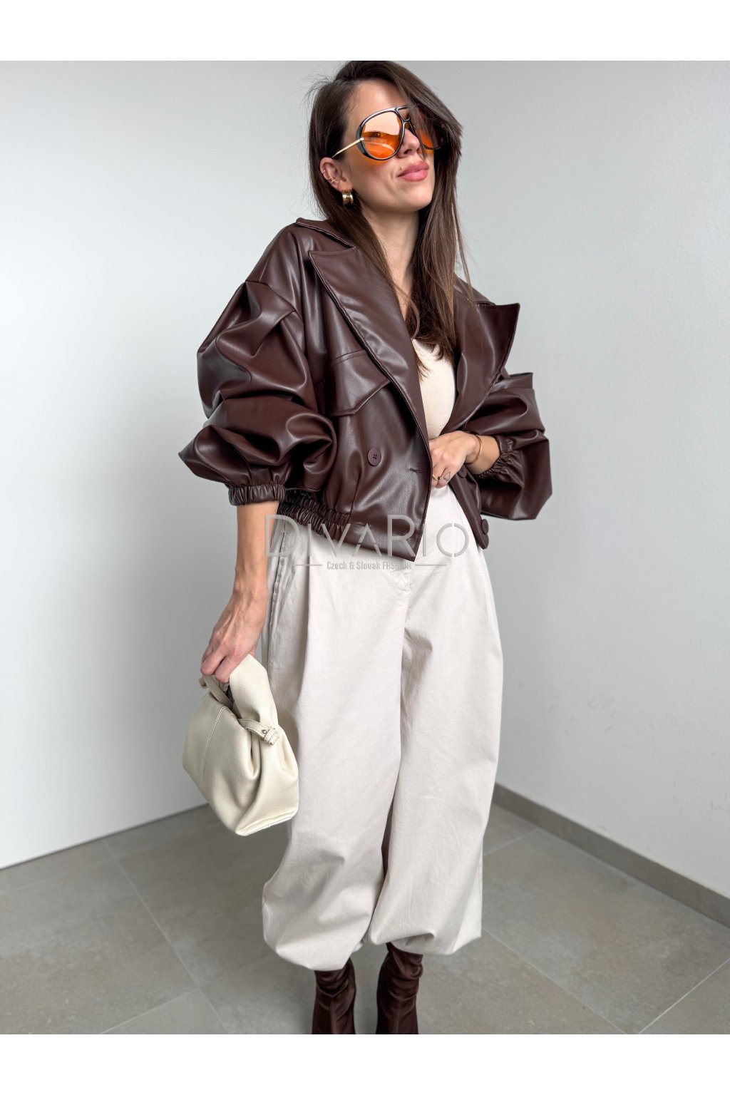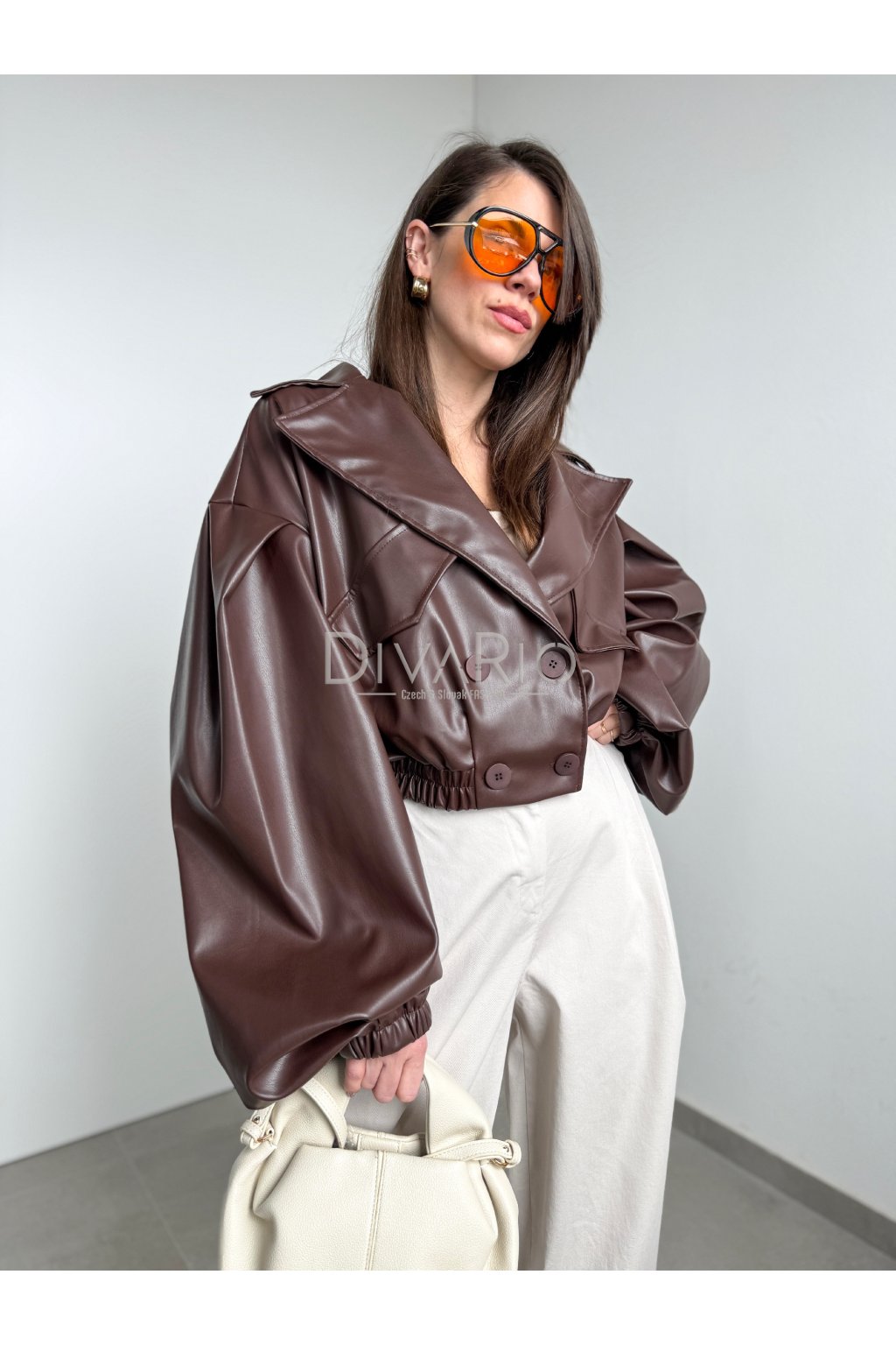 Koženková bunda v tmavo hnedej farbe, balonové dlhé rukávvy, kratší bomberový strih, zapínanie na gombíky. čierne vnútro.