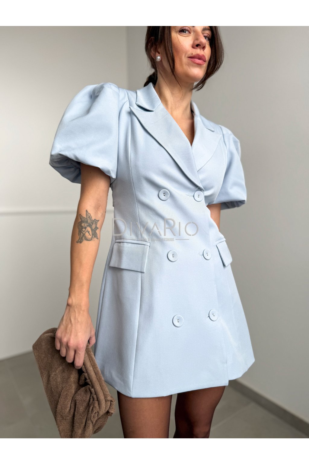 Sakové šaty v baby modrej farbe, krátky puff rukáv, top kvalita. Zapínanie na gombíky. Na chrbte úzky výrez.