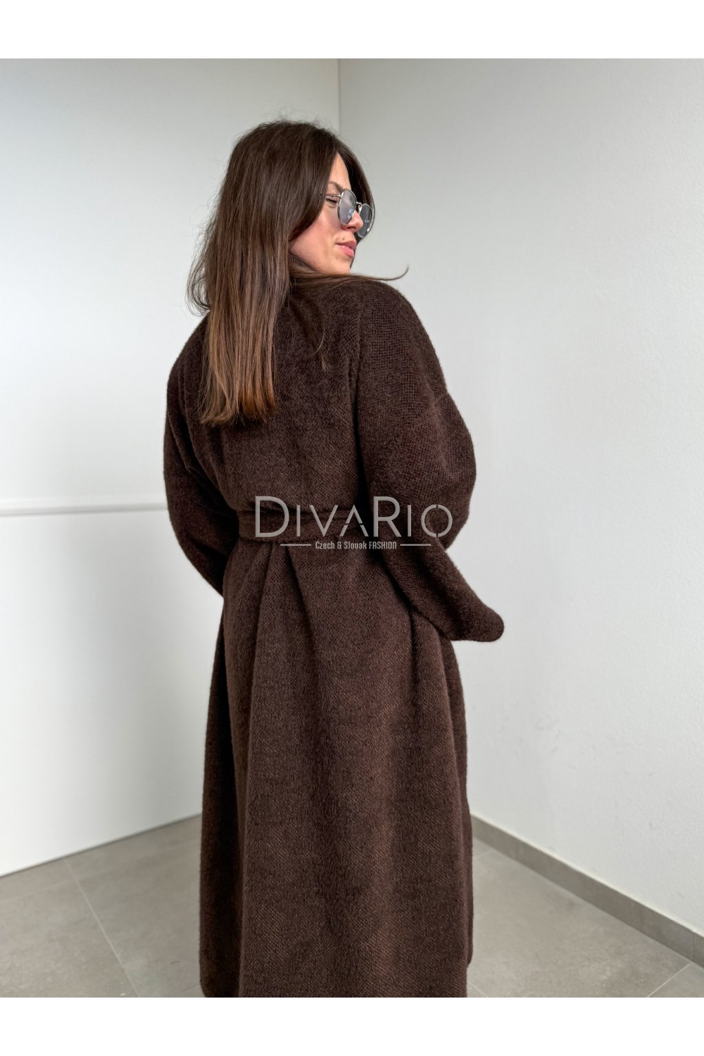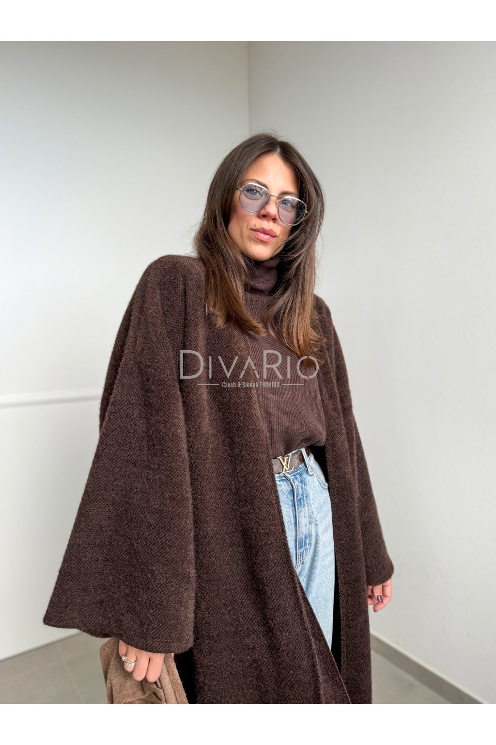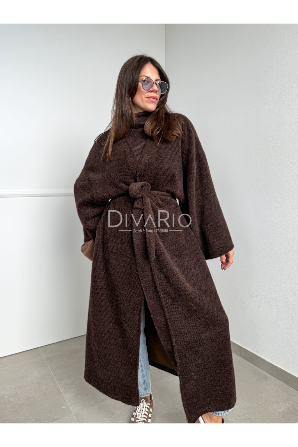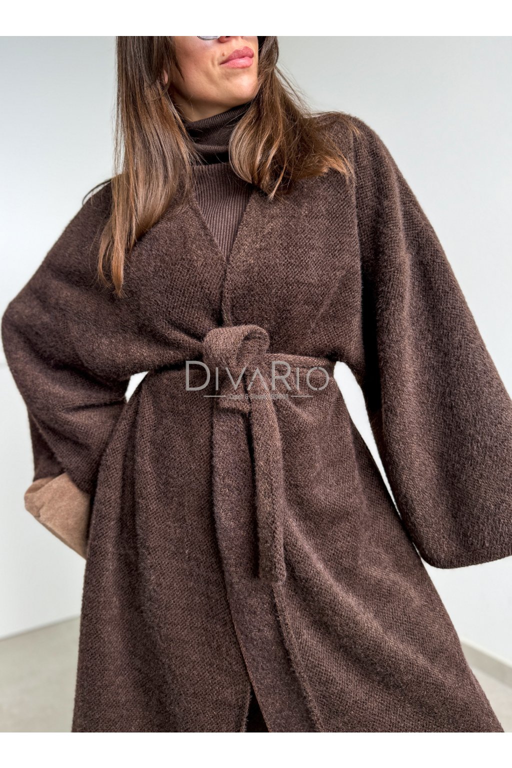 Tmavo hnedý dlhý tenký kabátik/sveter, rozšírené rukávy, látkový opasok súťasťou kabatika. Nie je futrovaný.