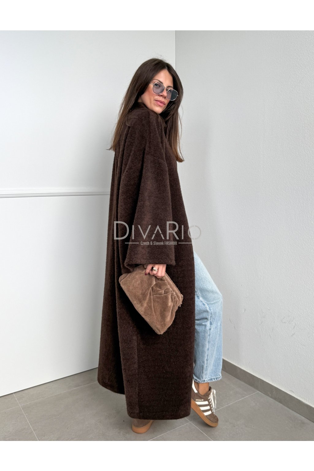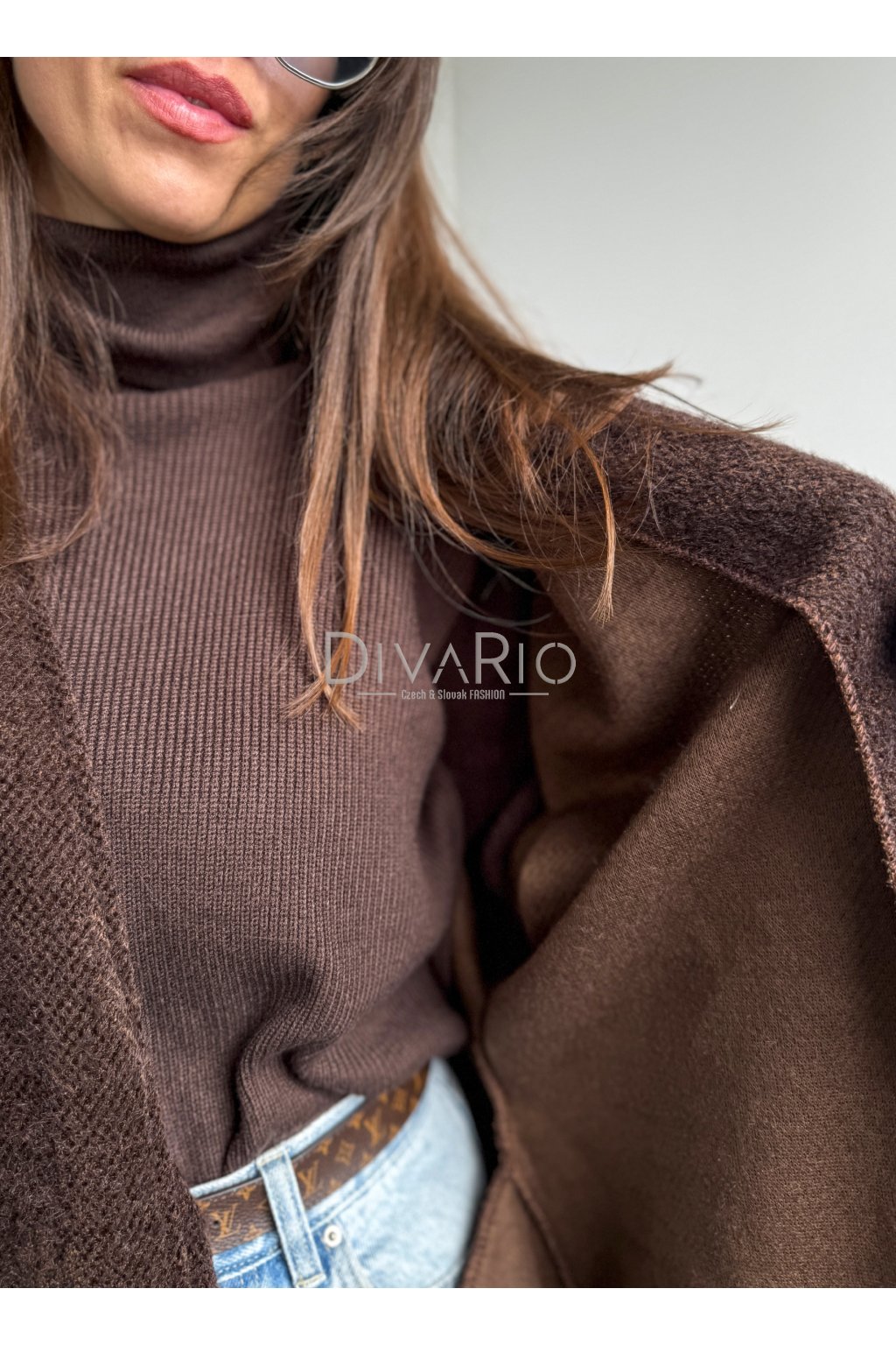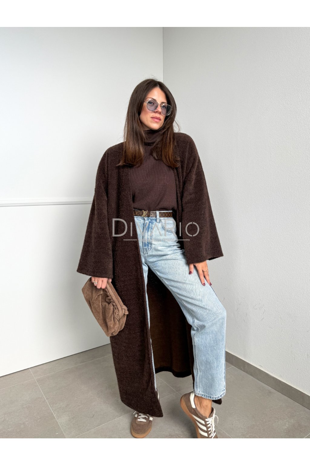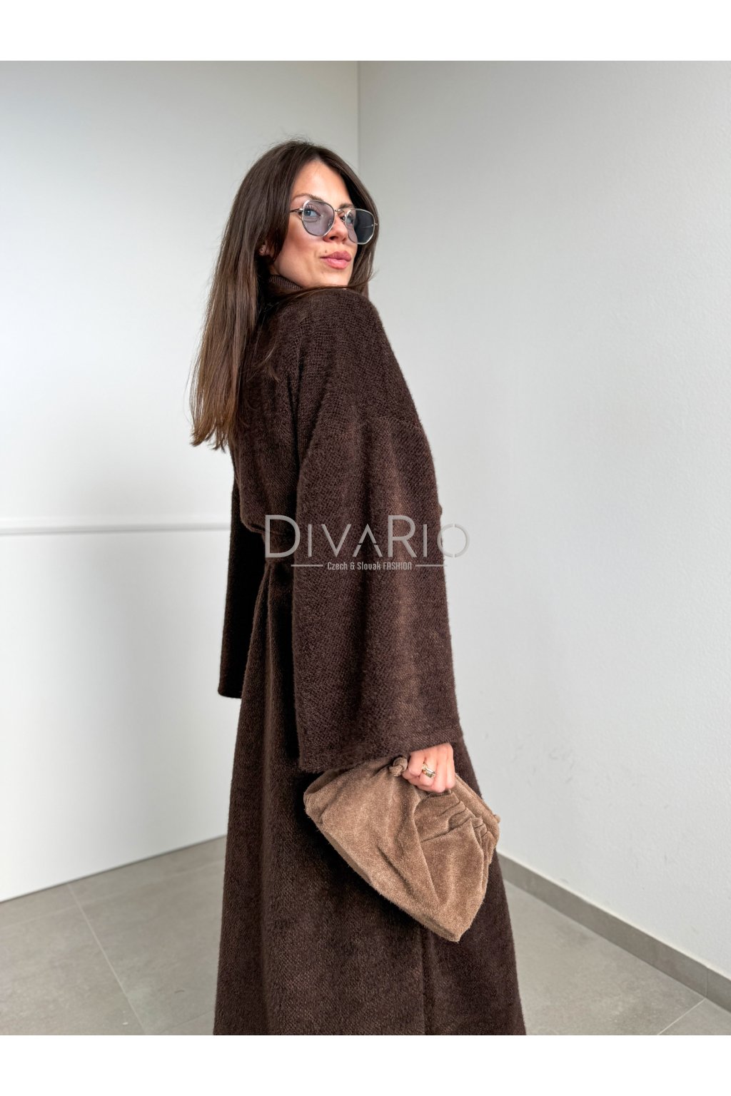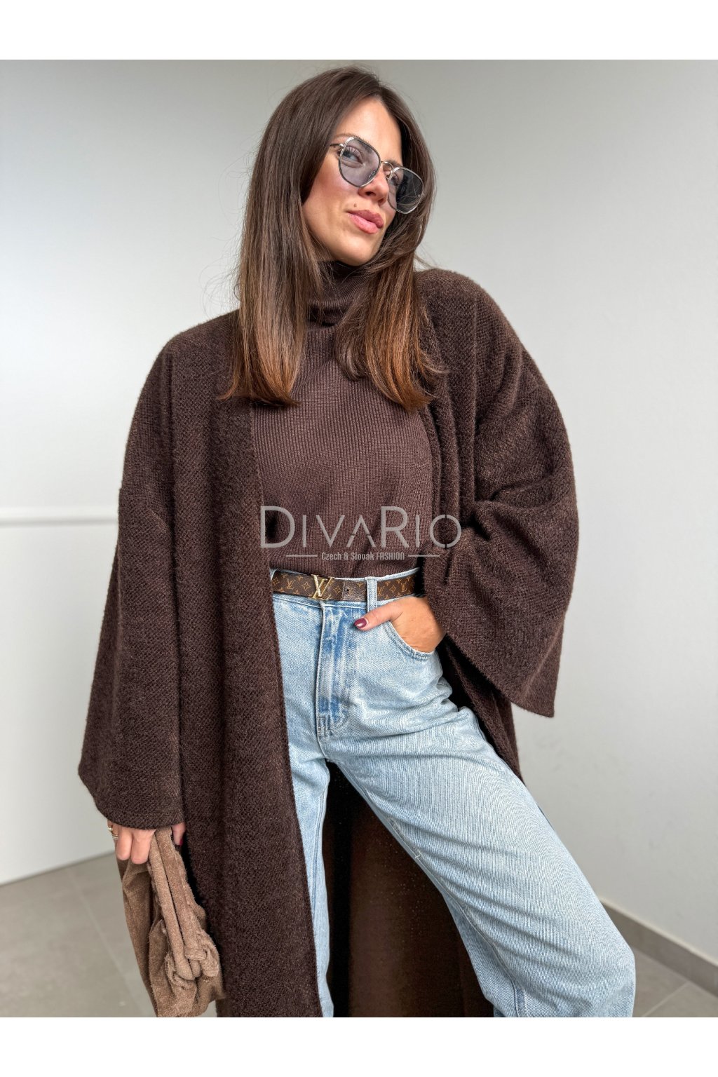 Tmavo hnedý dlhý tenký kabátik/sveter, rozšírené rukávy, látkový opasok súťasťou kabatika. Nie je futrovaný.