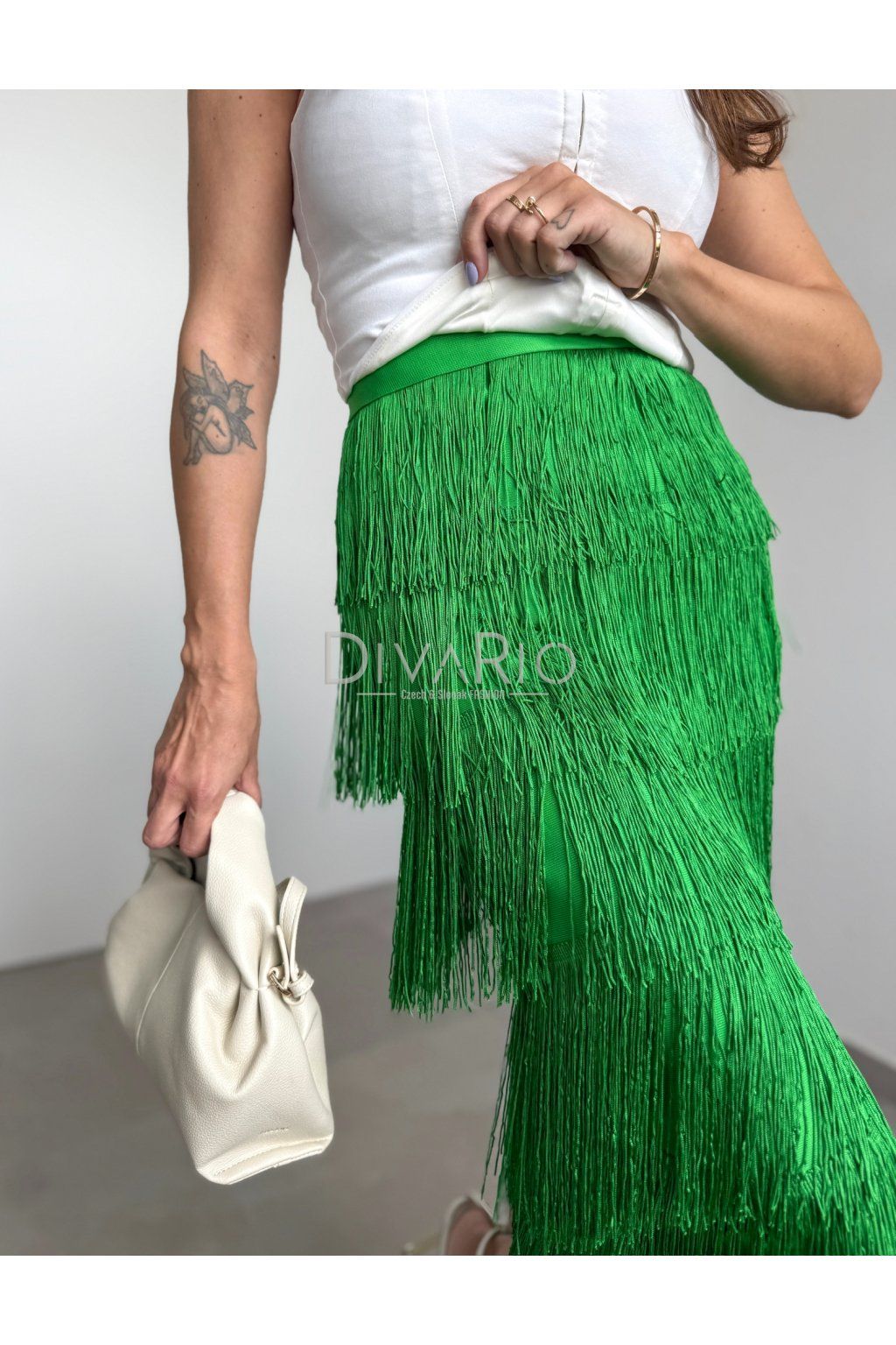 Midi zelená sukňa so strapcami, vysoký pas. Elastický materiál, odporúčame zvoliť o číslo väčšiu veľkosť.