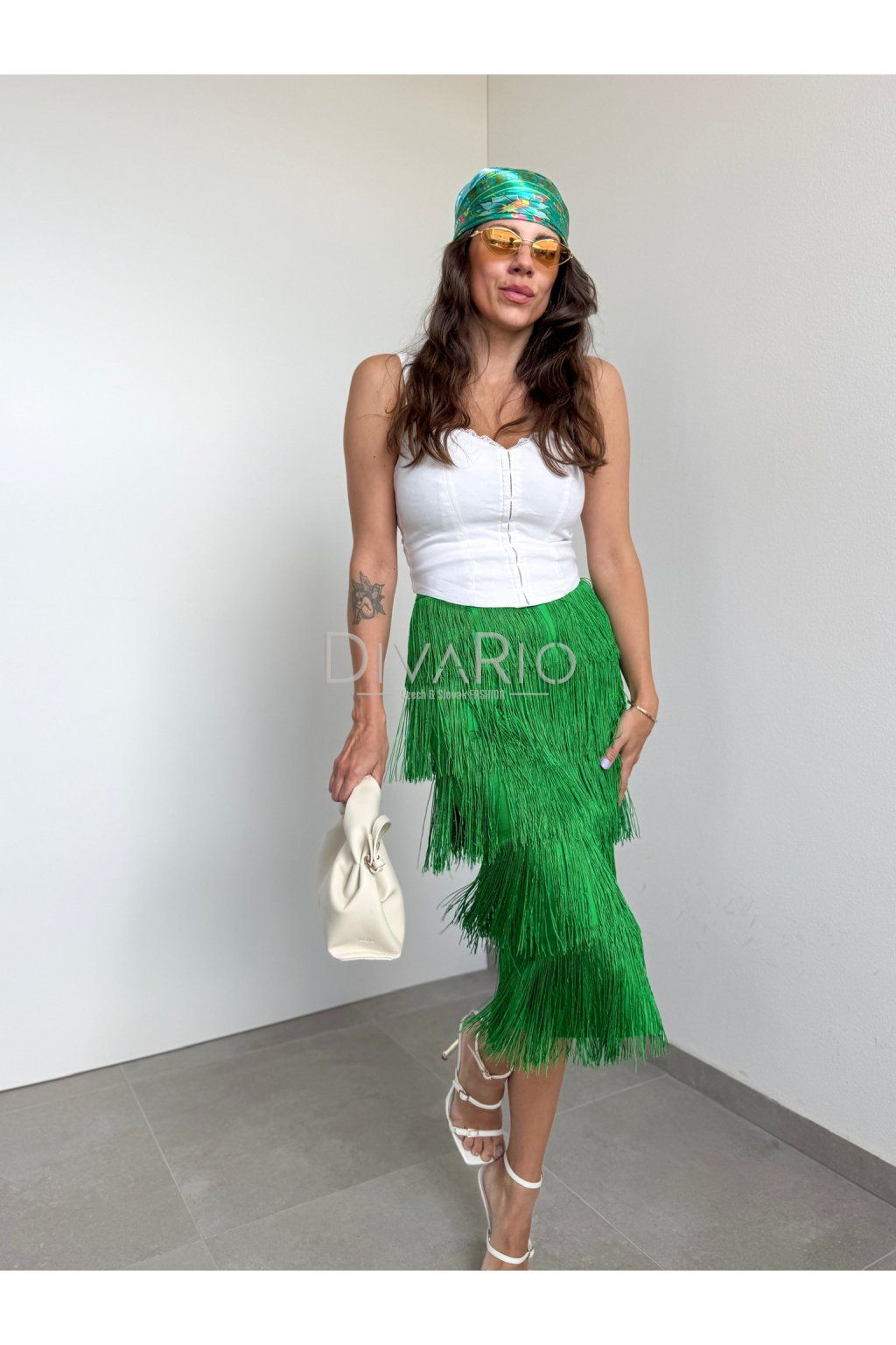 Midi zelená sukňa so strapcami 3007