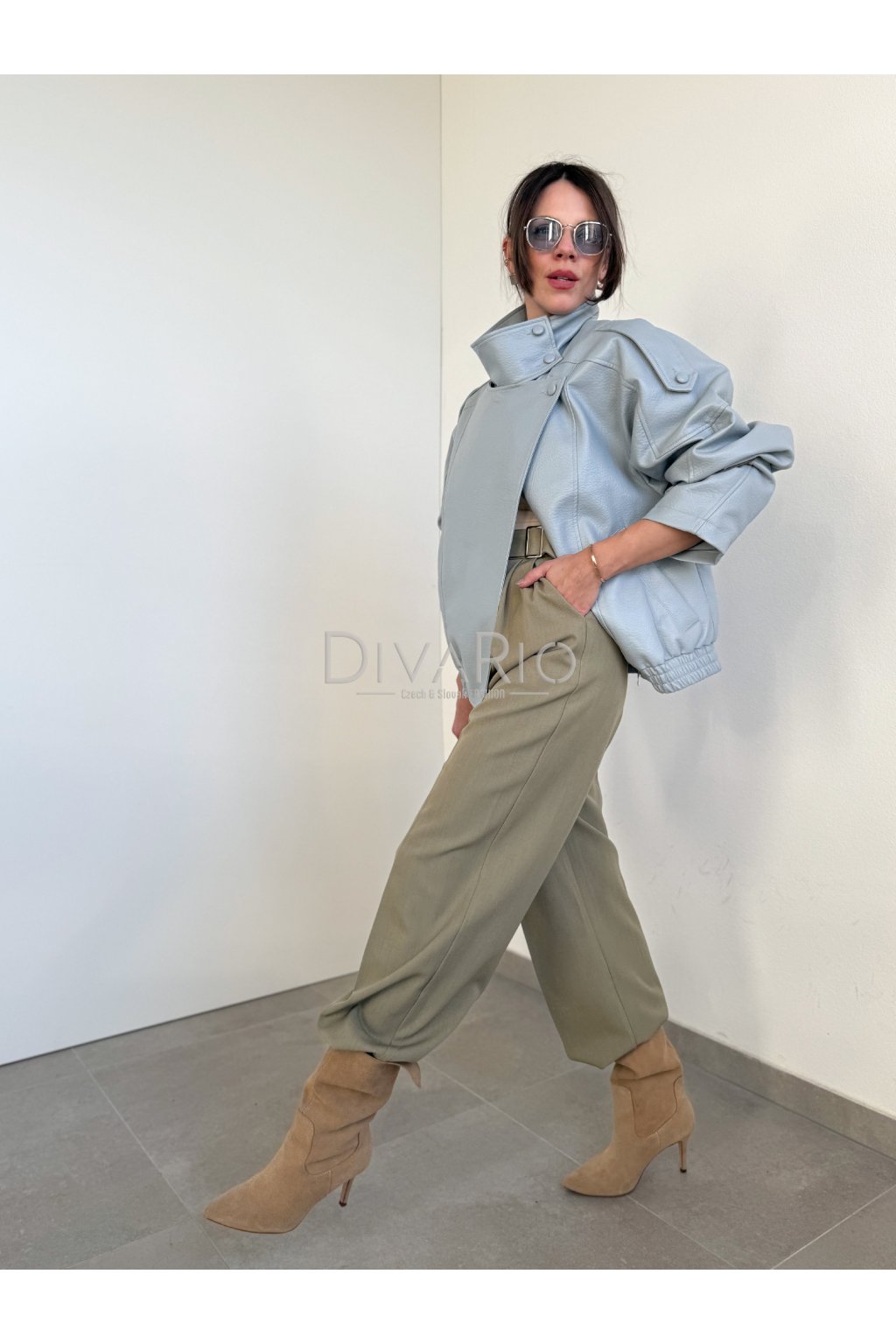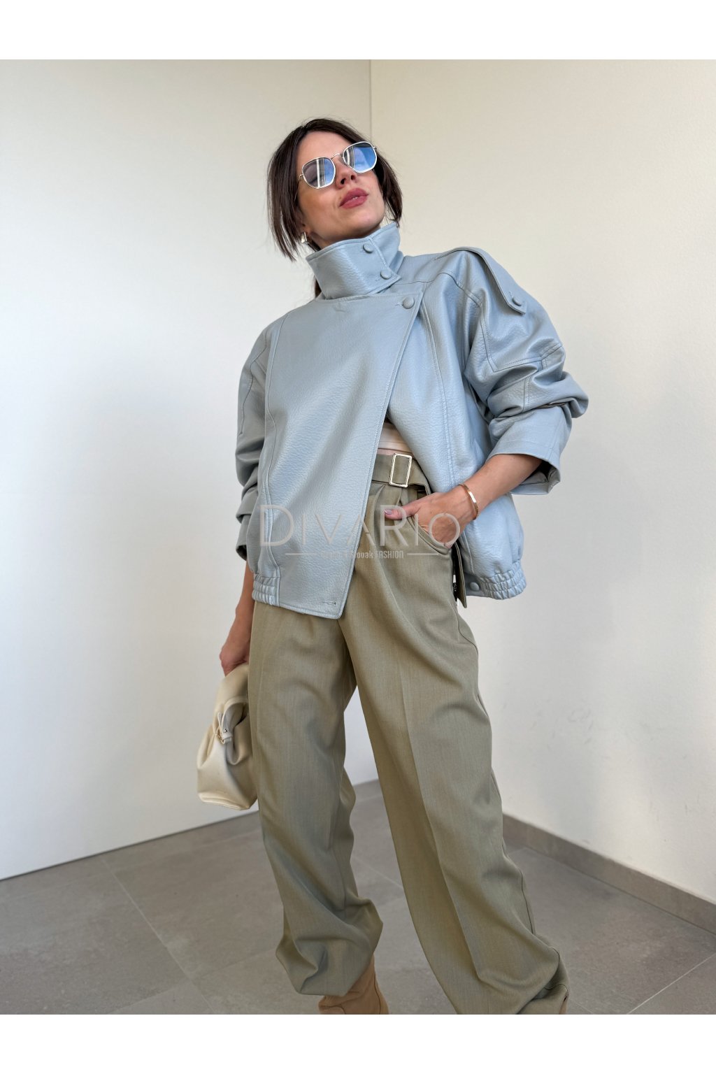 Svetlo modrá koženková bunda v ikonickom strihu. Dlhý rukáv, zapínanie na zips a gombíky - cvoky. Mäkka koženka.