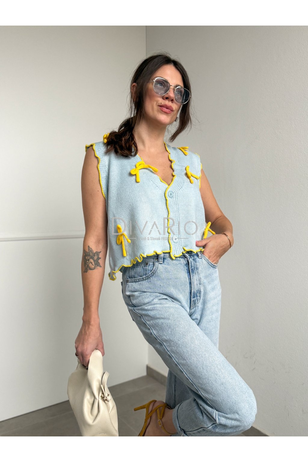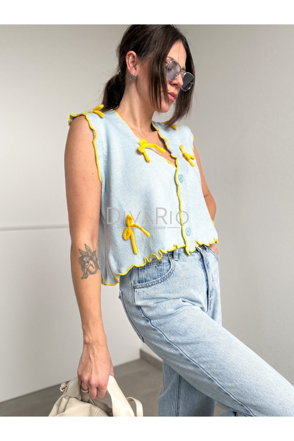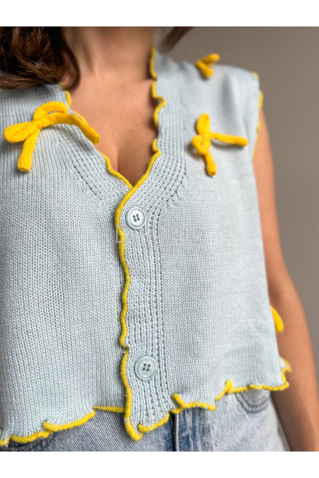 Pletená vesta s baby blue farbe, žlté mašličky. Zapínanie na gombík, skrátený strih.