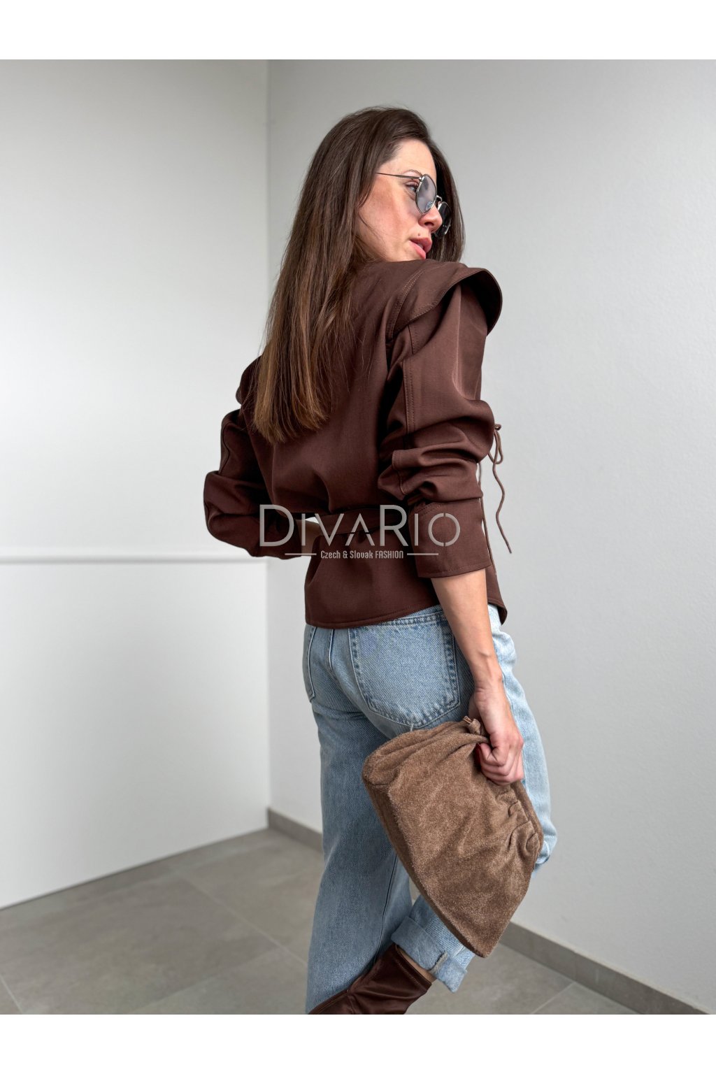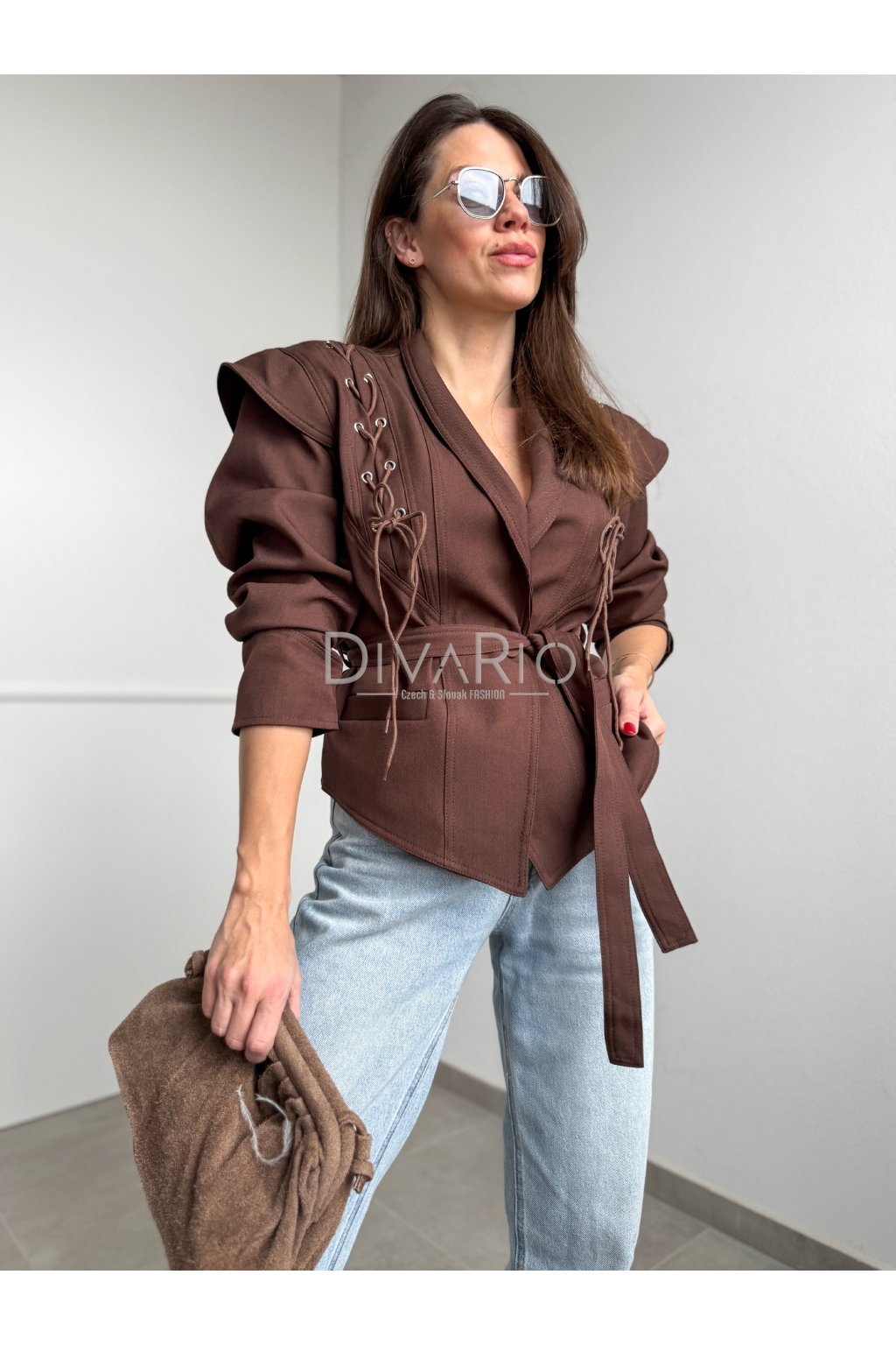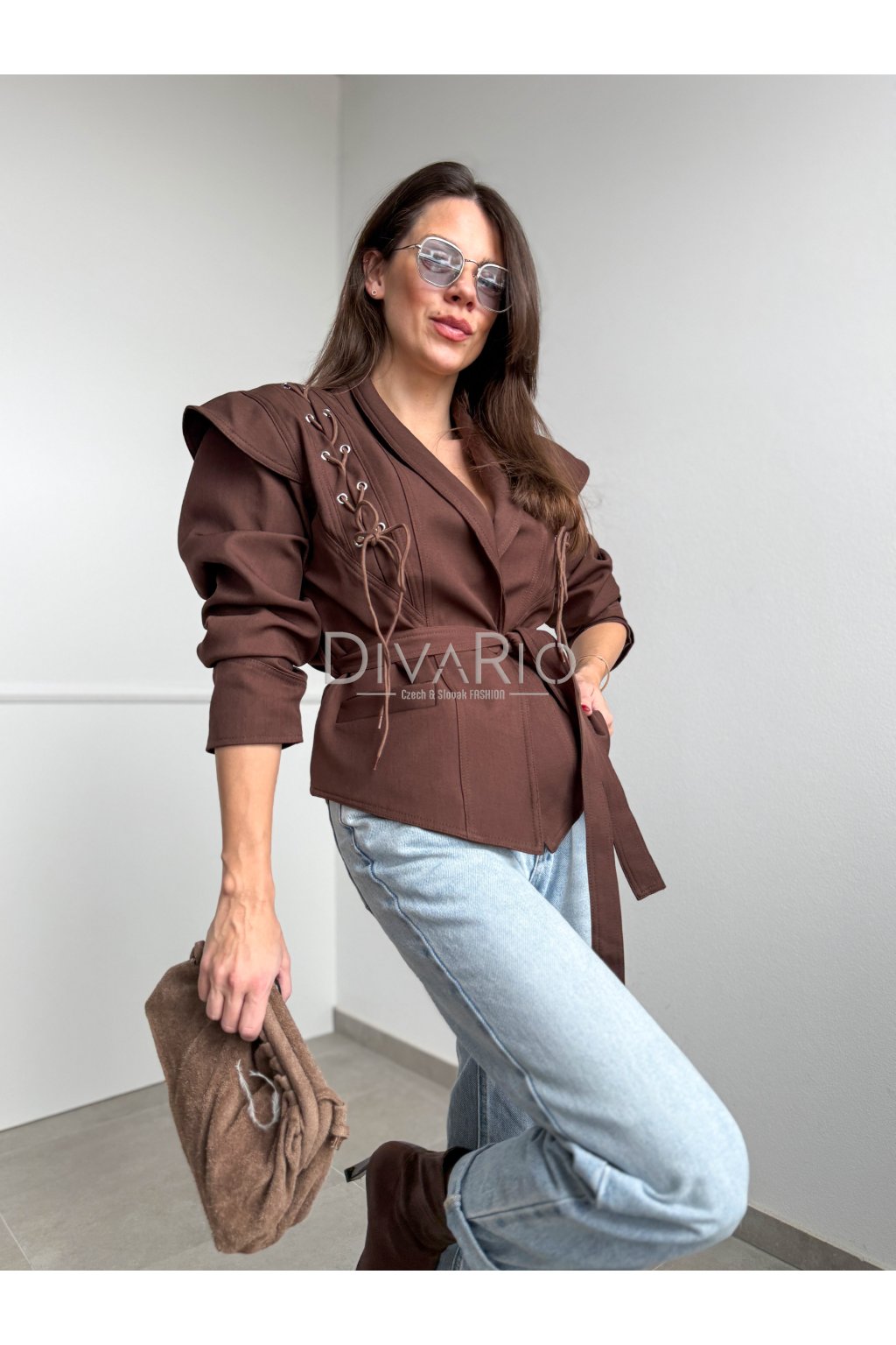 Sako s viazaním v čokoládovej hnedej farbe. Kratší strih, dlhý rukáv. Veľkosť UNI je vhodná pre veľkosti XS až M.