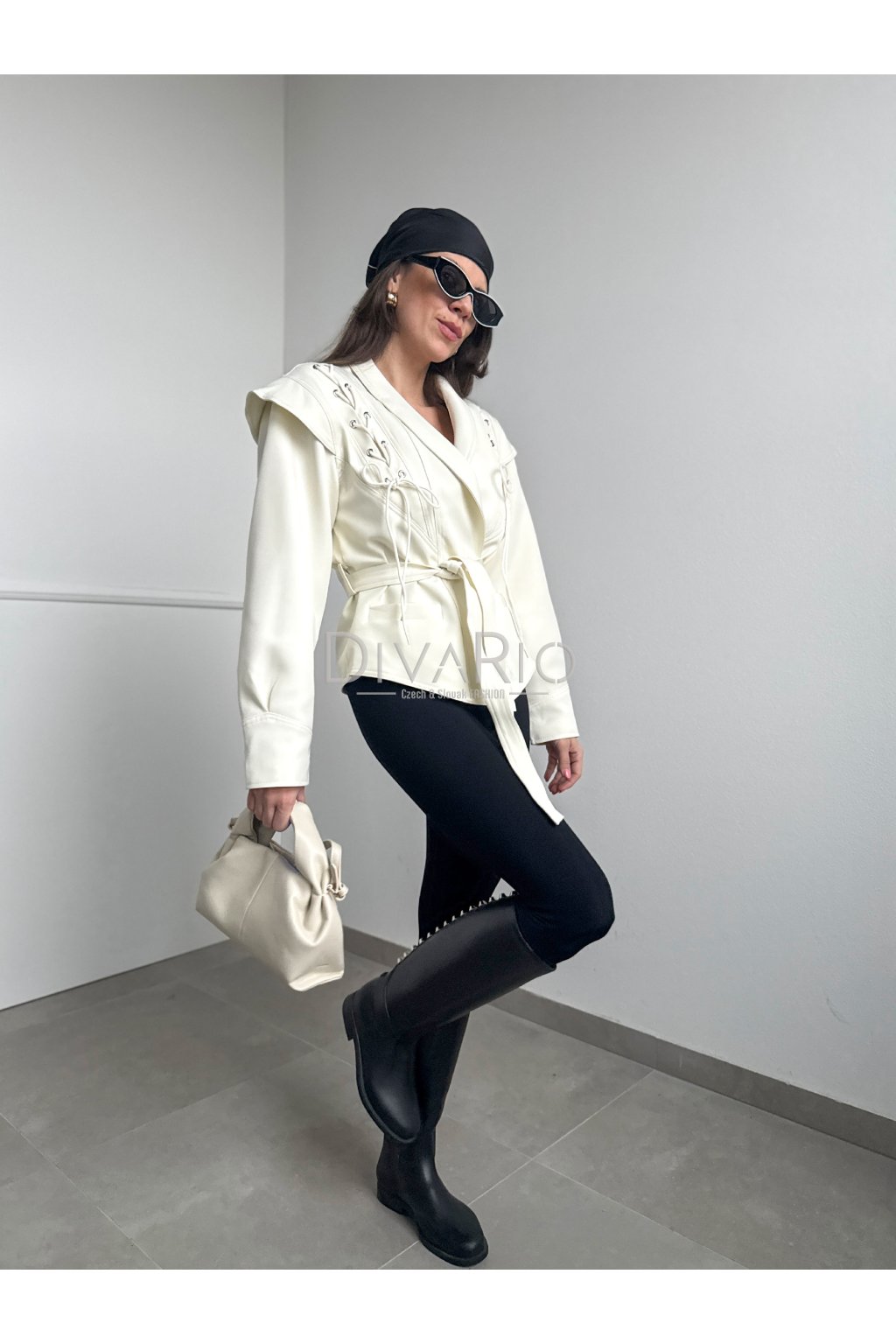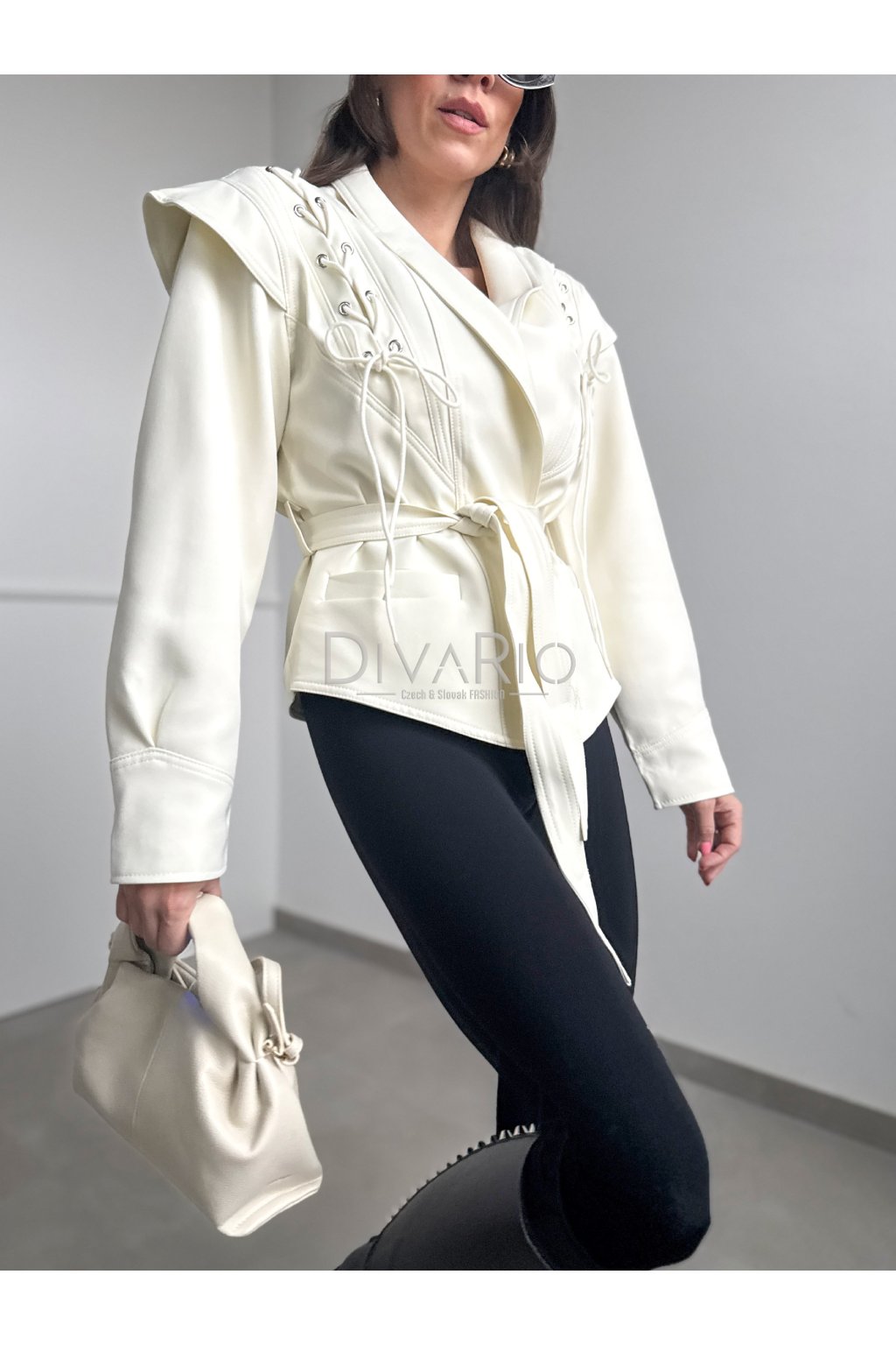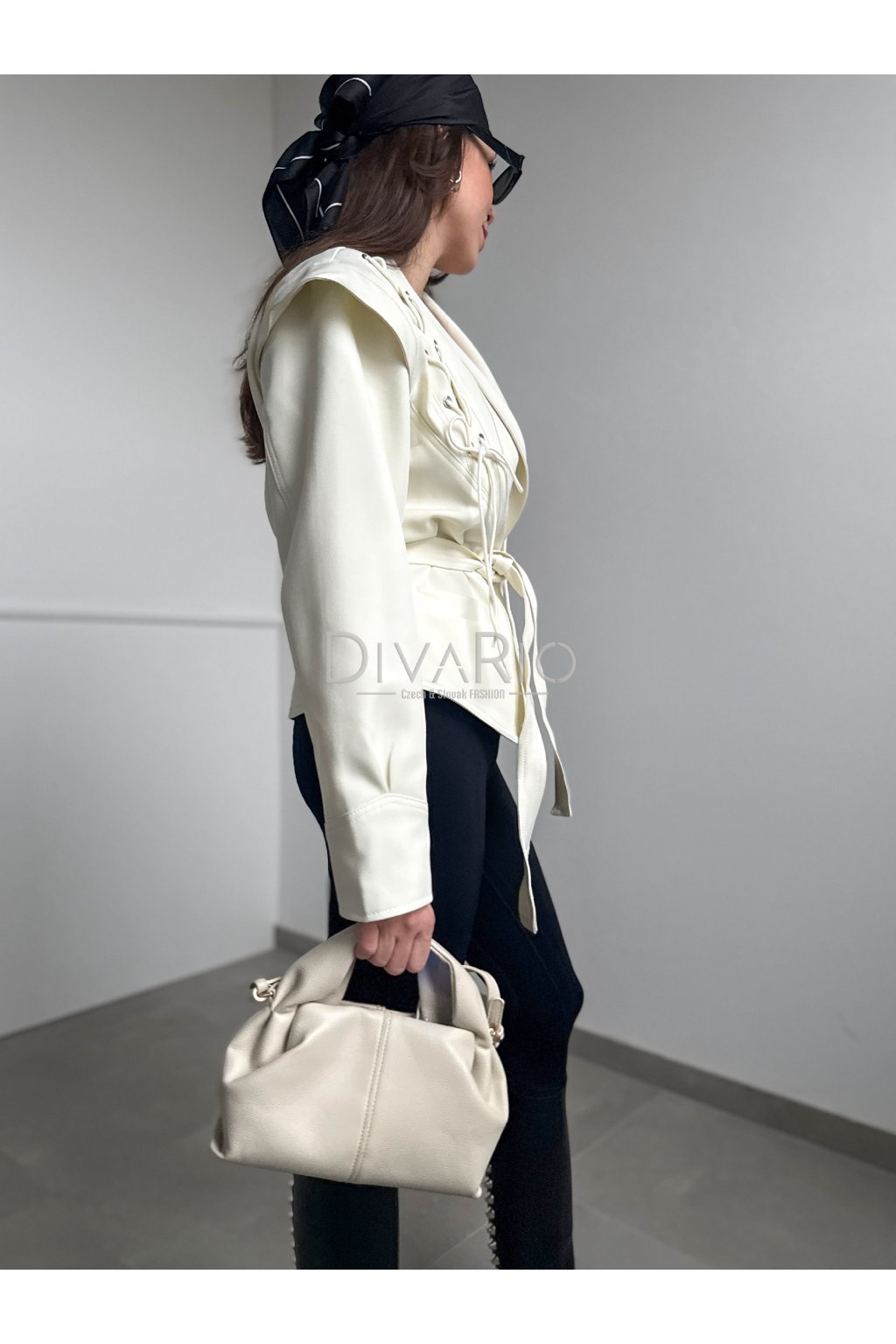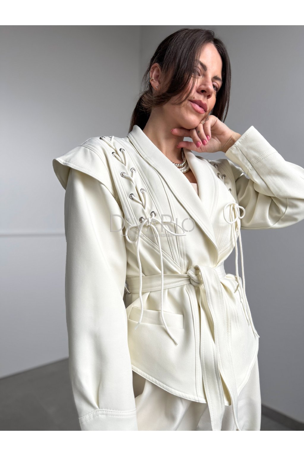 Sako s viazaním v krémovej farbe. Kratší strih, dlhý rukáv. Veľkosť UNI je vhodná pre veľkosti XS až M.