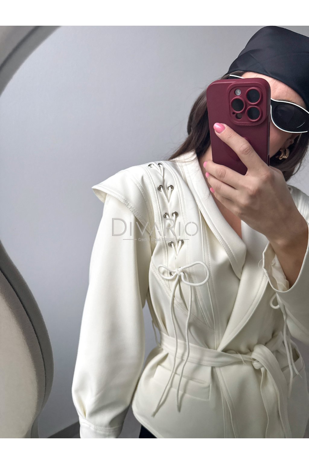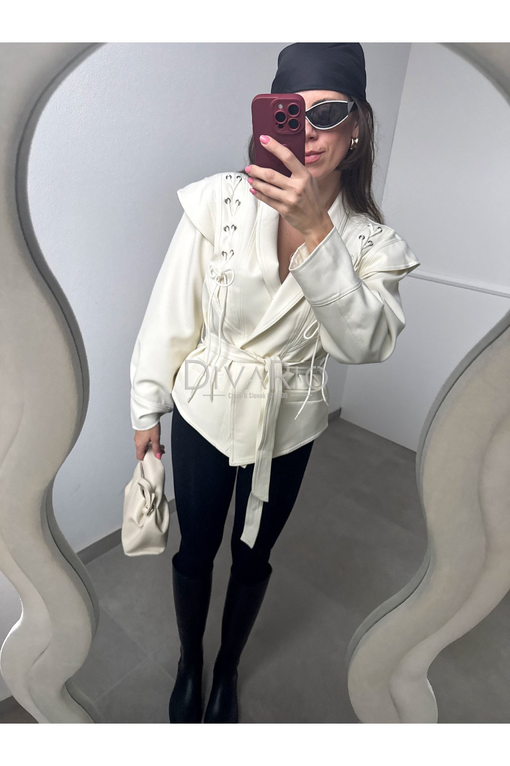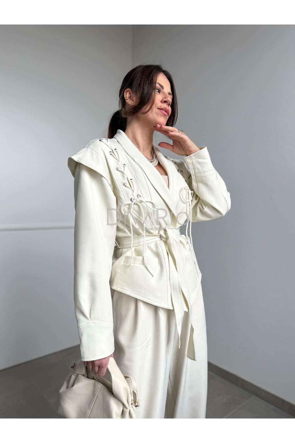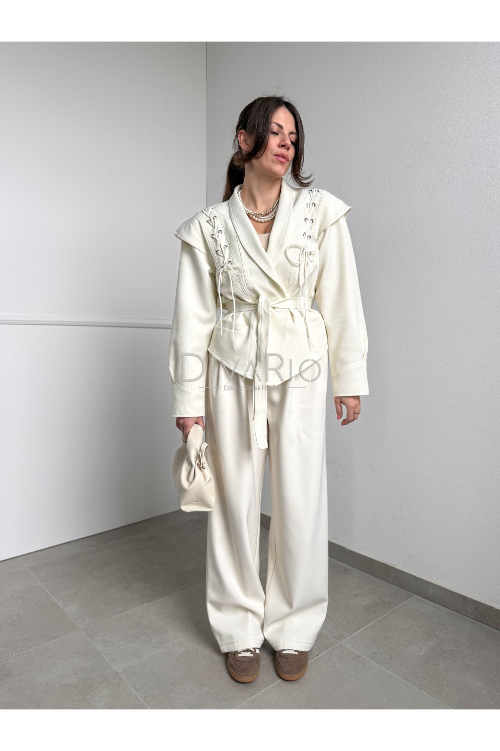 Sako s viazaním v krémovej farbe. Kratší strih, dlhý rukáv. Veľkosť UNI je vhodná pre veľkosti XS až M.