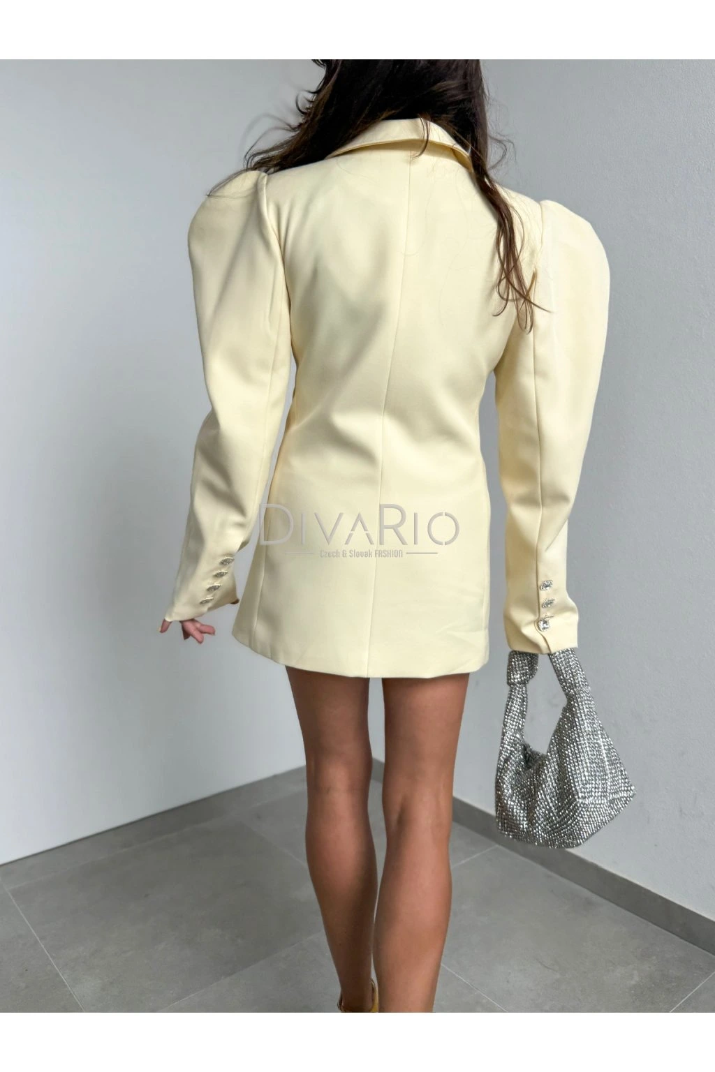 Sakové šaty v butteryellow (maslovo žltej) farbe, extravagantné ramena a dlhý rukáv, ozdobné strieborné diamantikové gombíky a menšie na rukávoch. Top kvalita, šaty sú futrované.