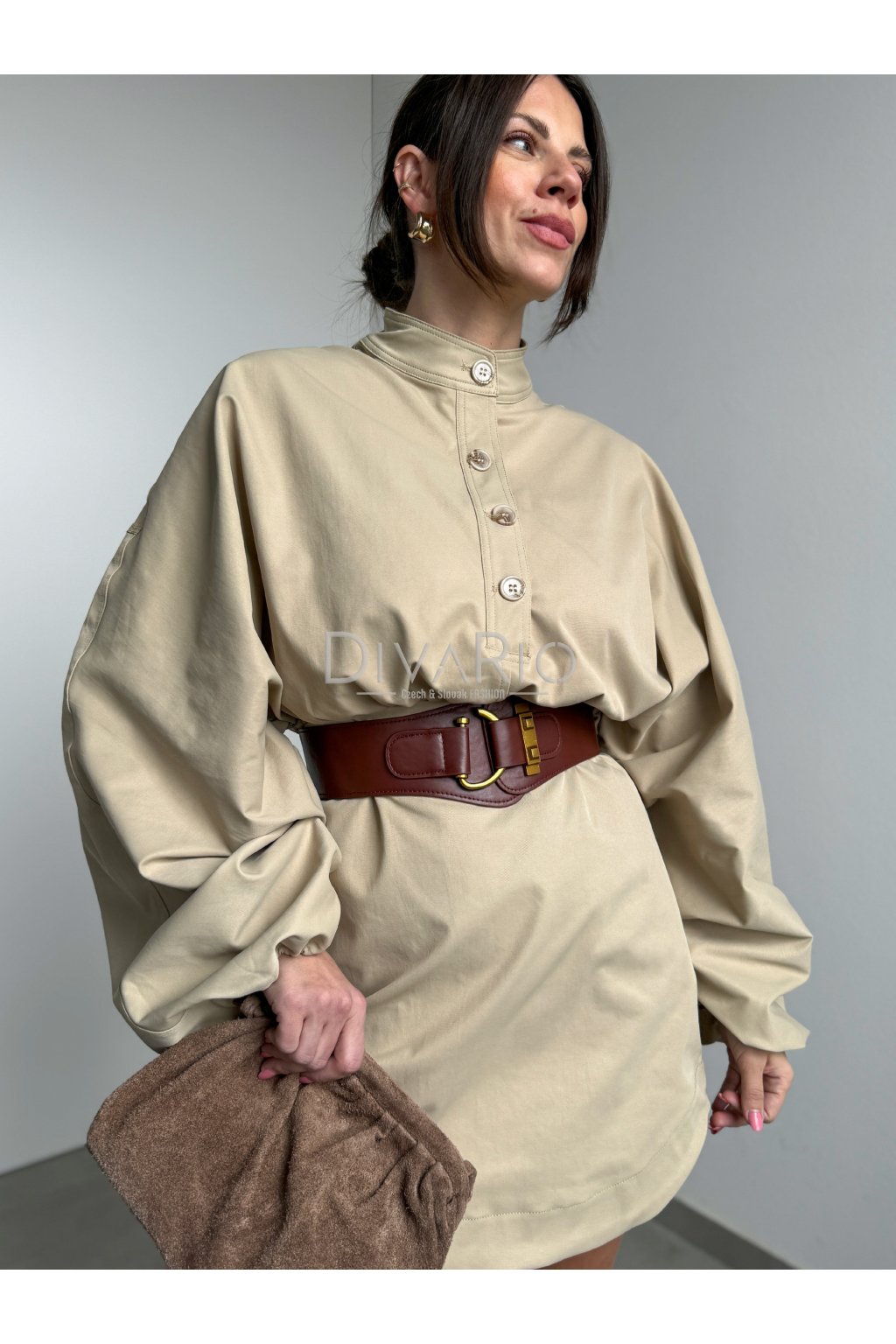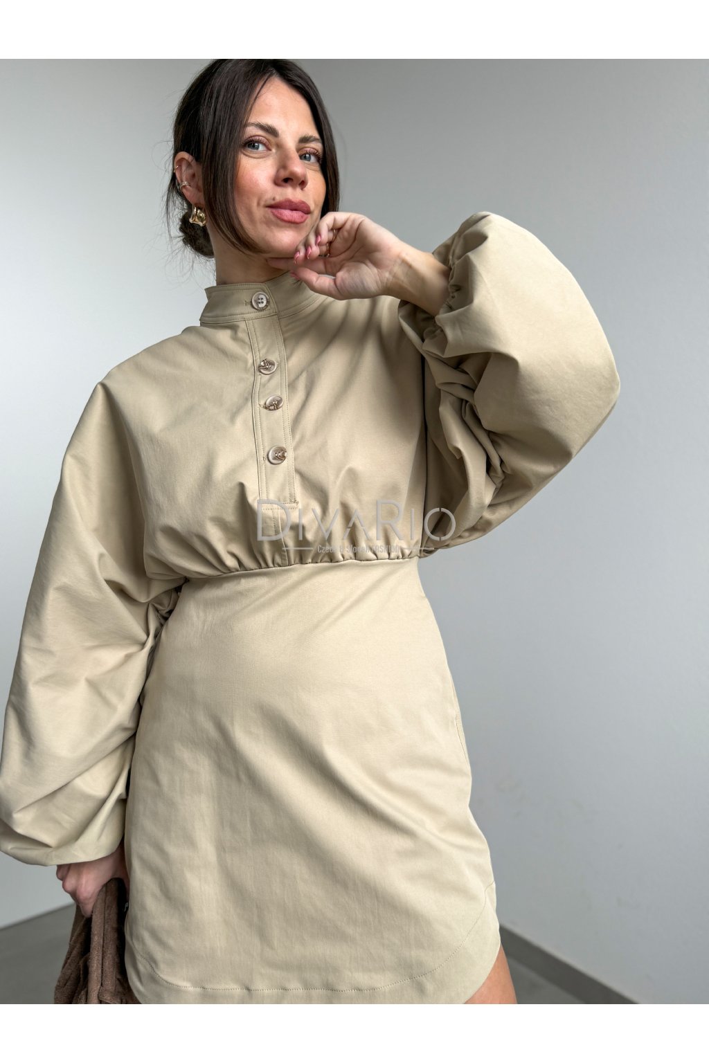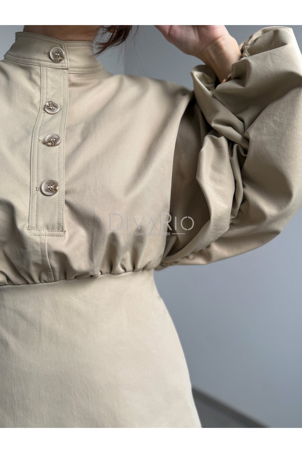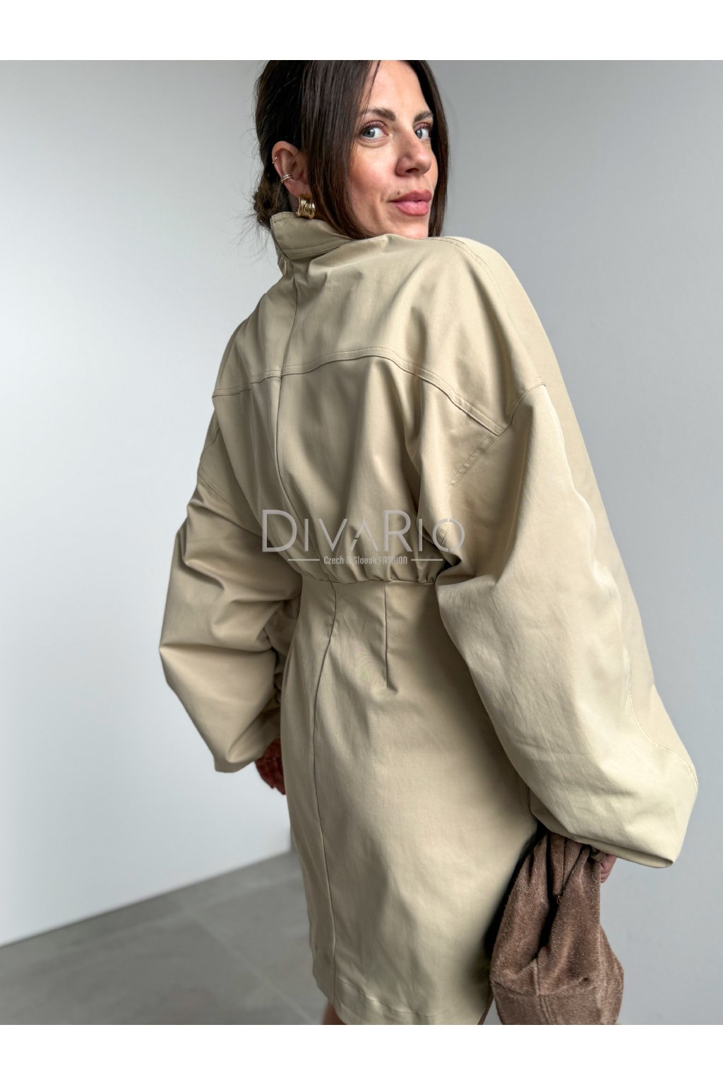 Bežové šaty s dlhým bomberovým rukávom (nariasené po celej dĺžke, na konci gumička). Stojačik na krku. Prestrihnuté v pase. Zapínanie na zips a gombíky. Tuchší materiál. Súčasťou šiat nie je opasok.