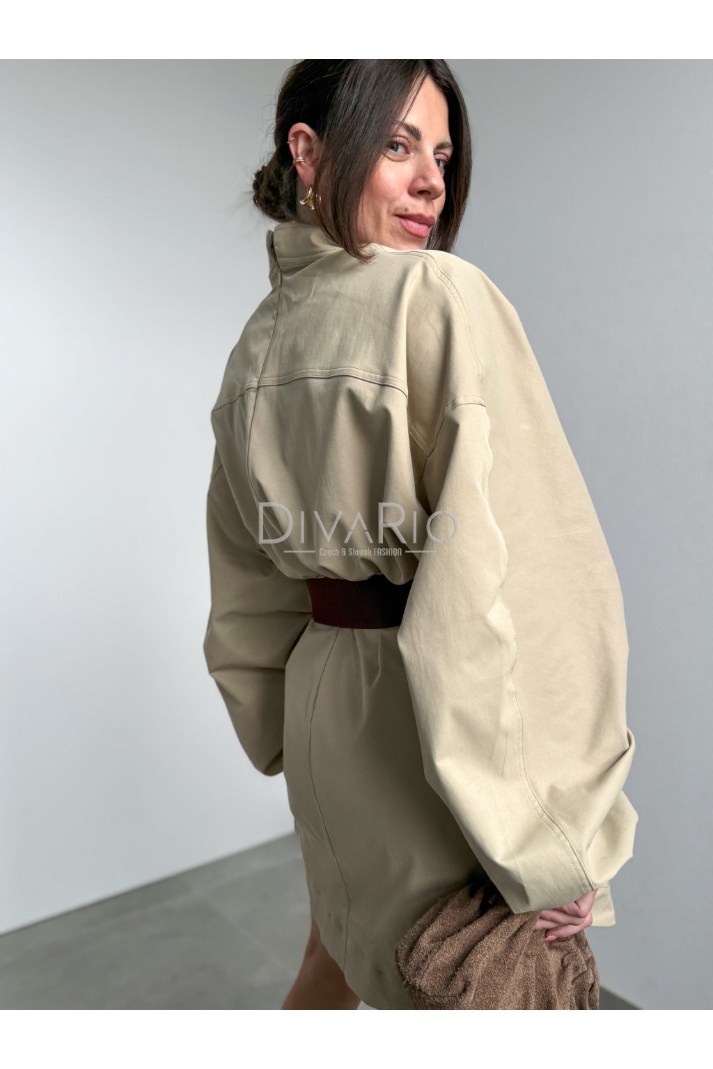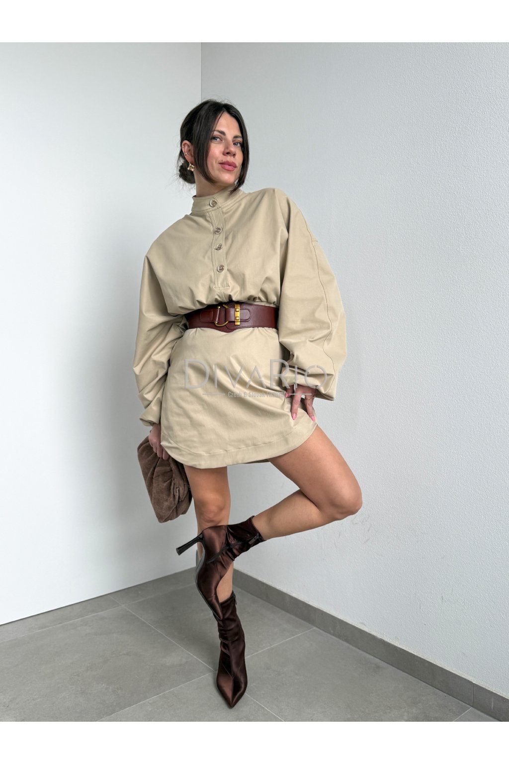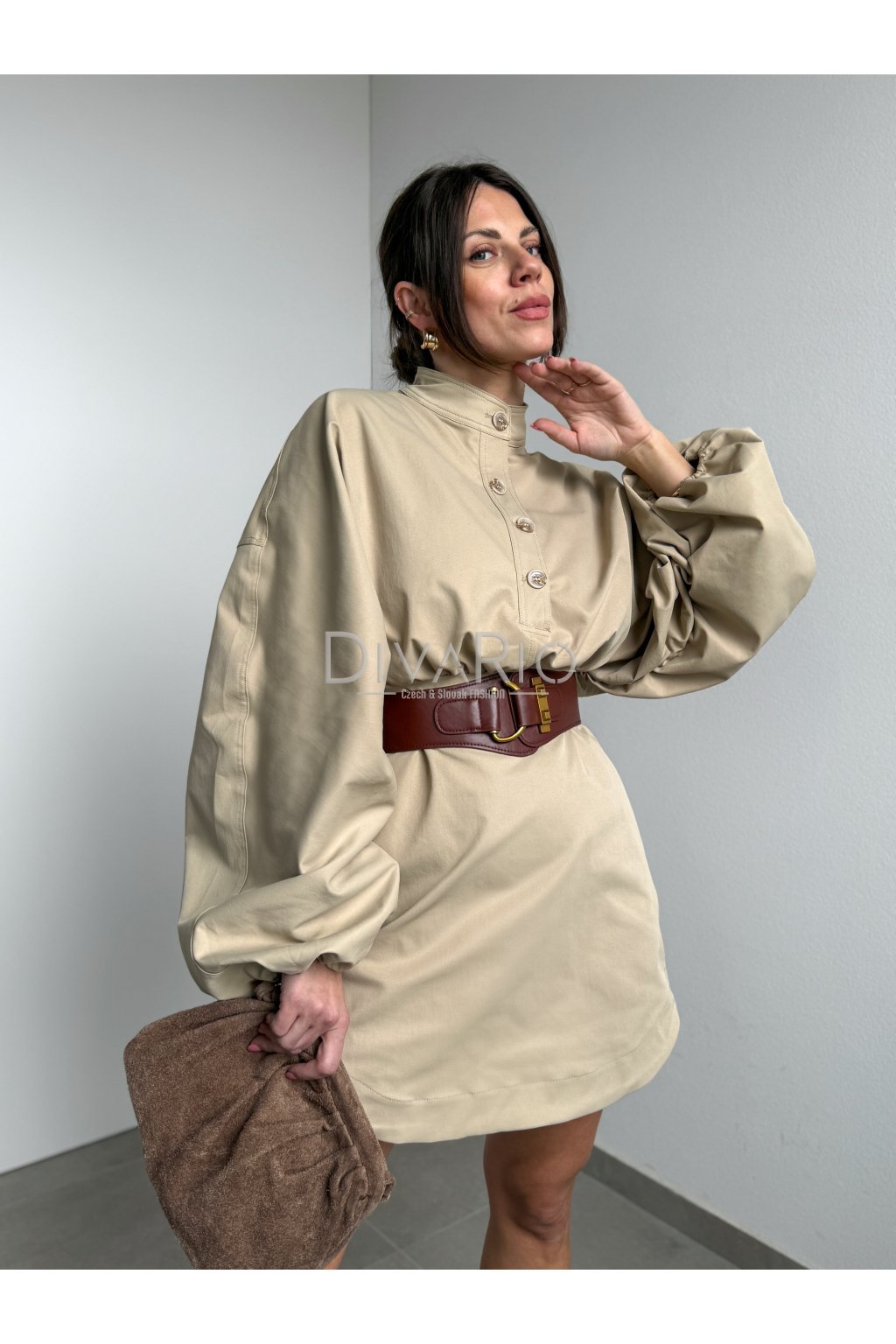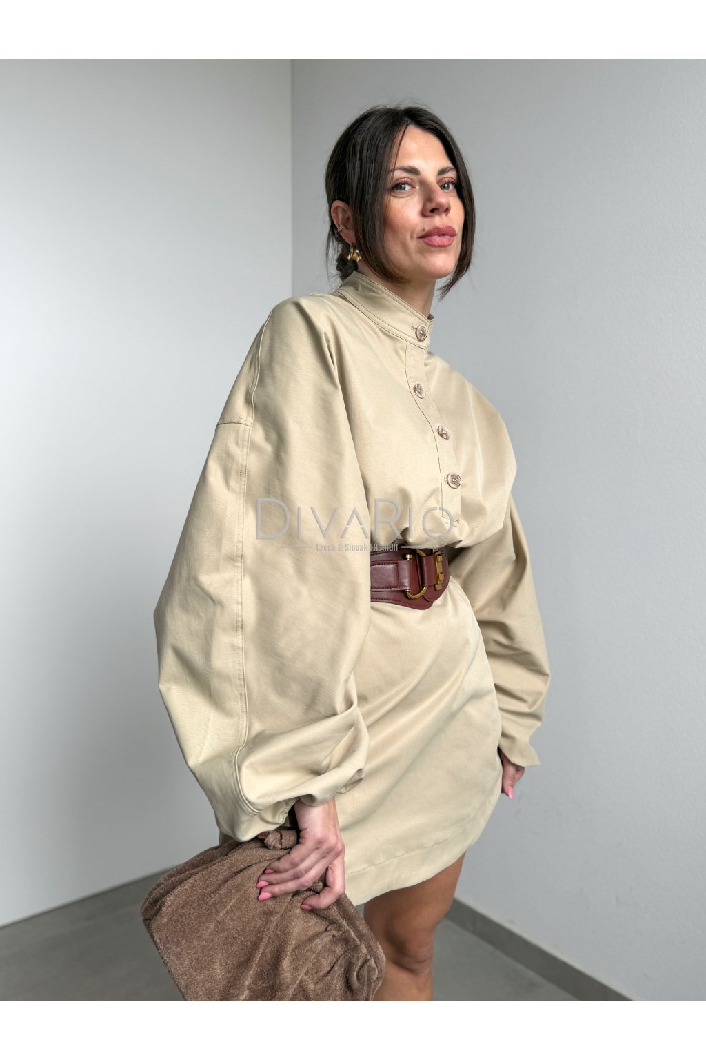 Bežové šaty s dlhým bomberovým rukávom (nariasené po celej dĺžke, na konci gumička). Stojačik na krku. Prestrihnuté v pase. Zapínanie na zips a gombíky. Tuchší materiál. Súčasťou šiat nie je opasok.