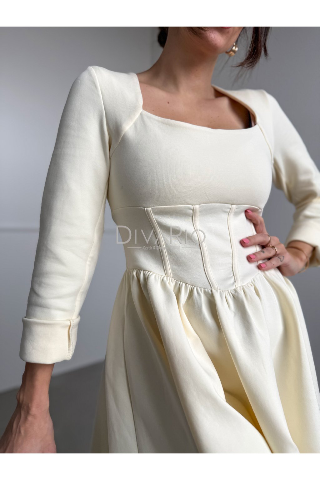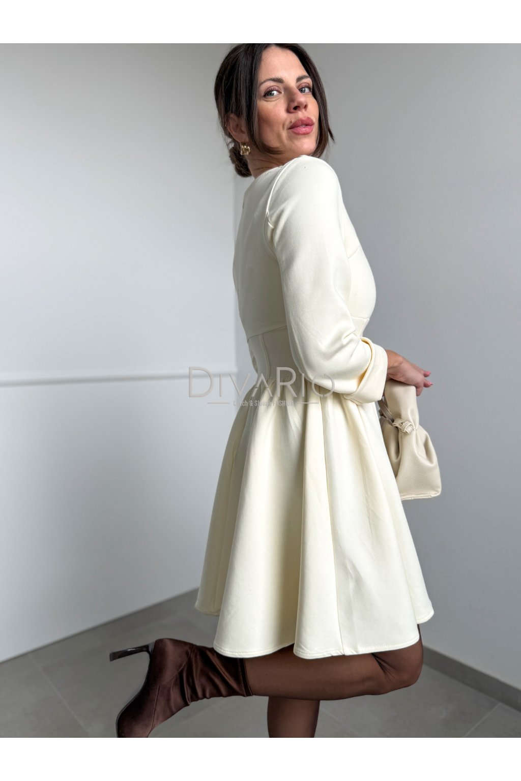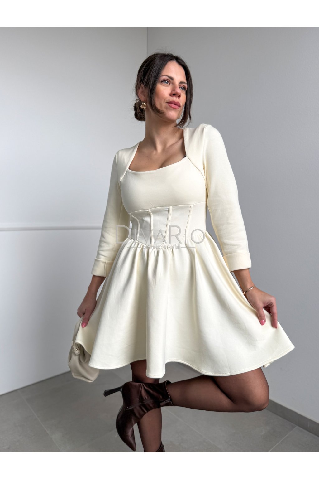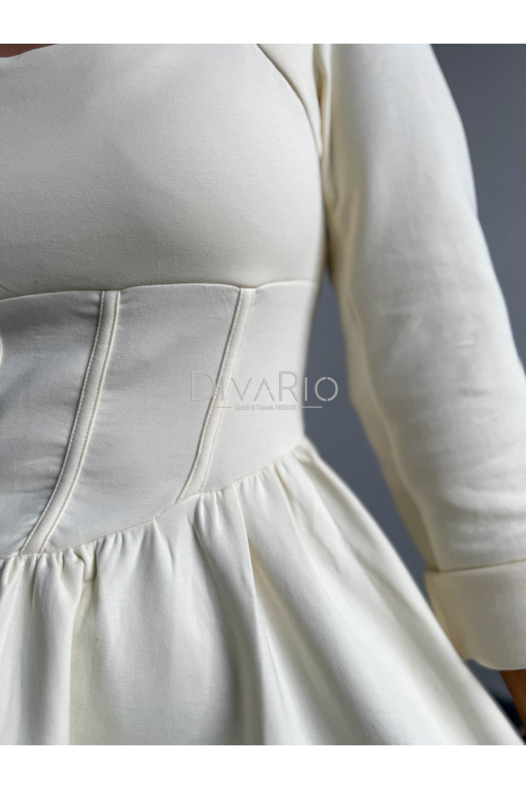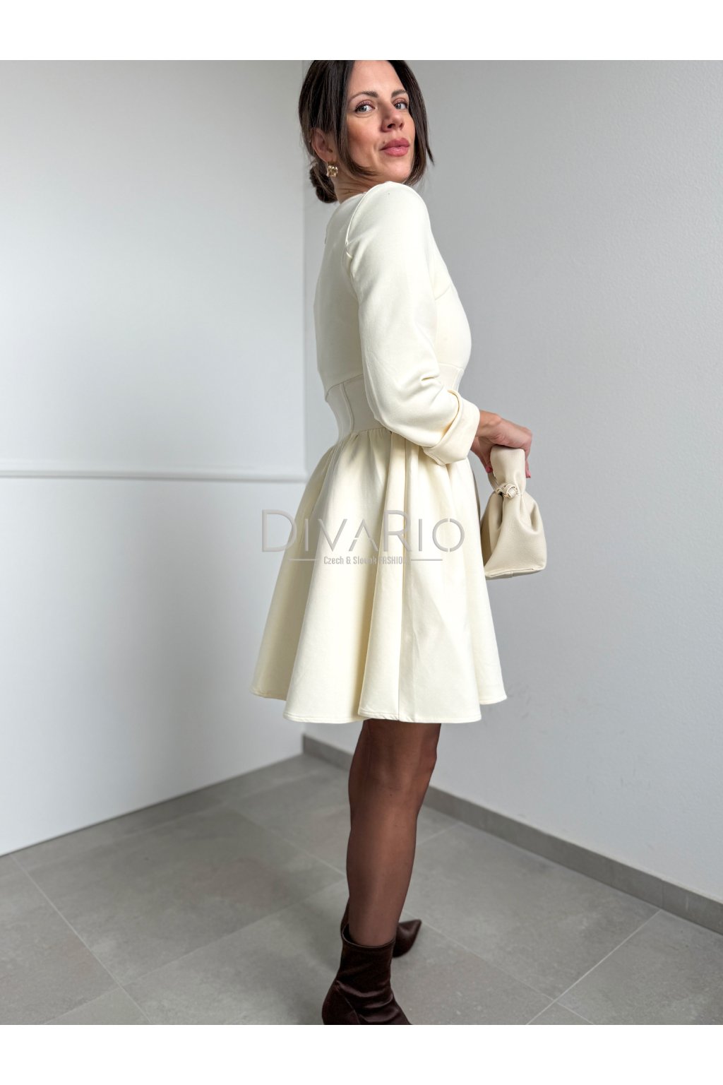 Krátke krémové teplákové šaty, prestrihnuté v pase, áčková sukňa, dlhý rukáv.