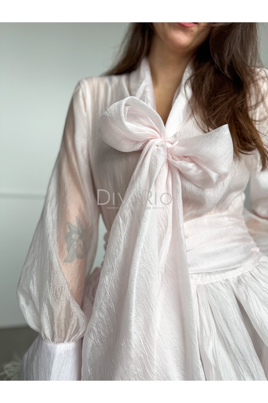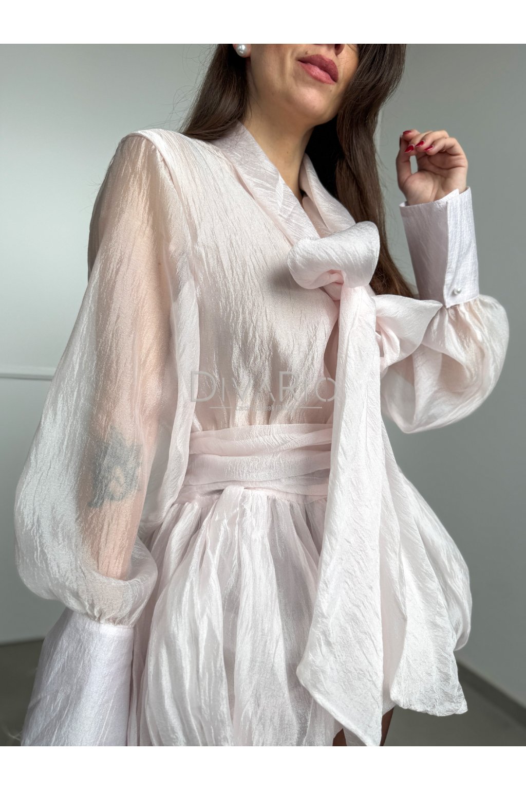 Krátke jemne ružové šaty s dlhym rukávom, balonová sukňa, vršok jemne priesvitný. Prestrihnuté v pase. Vhodné pre nižšie ženy. Široké patenty na priehľadných rukávoch s perličkovým gombíkom.