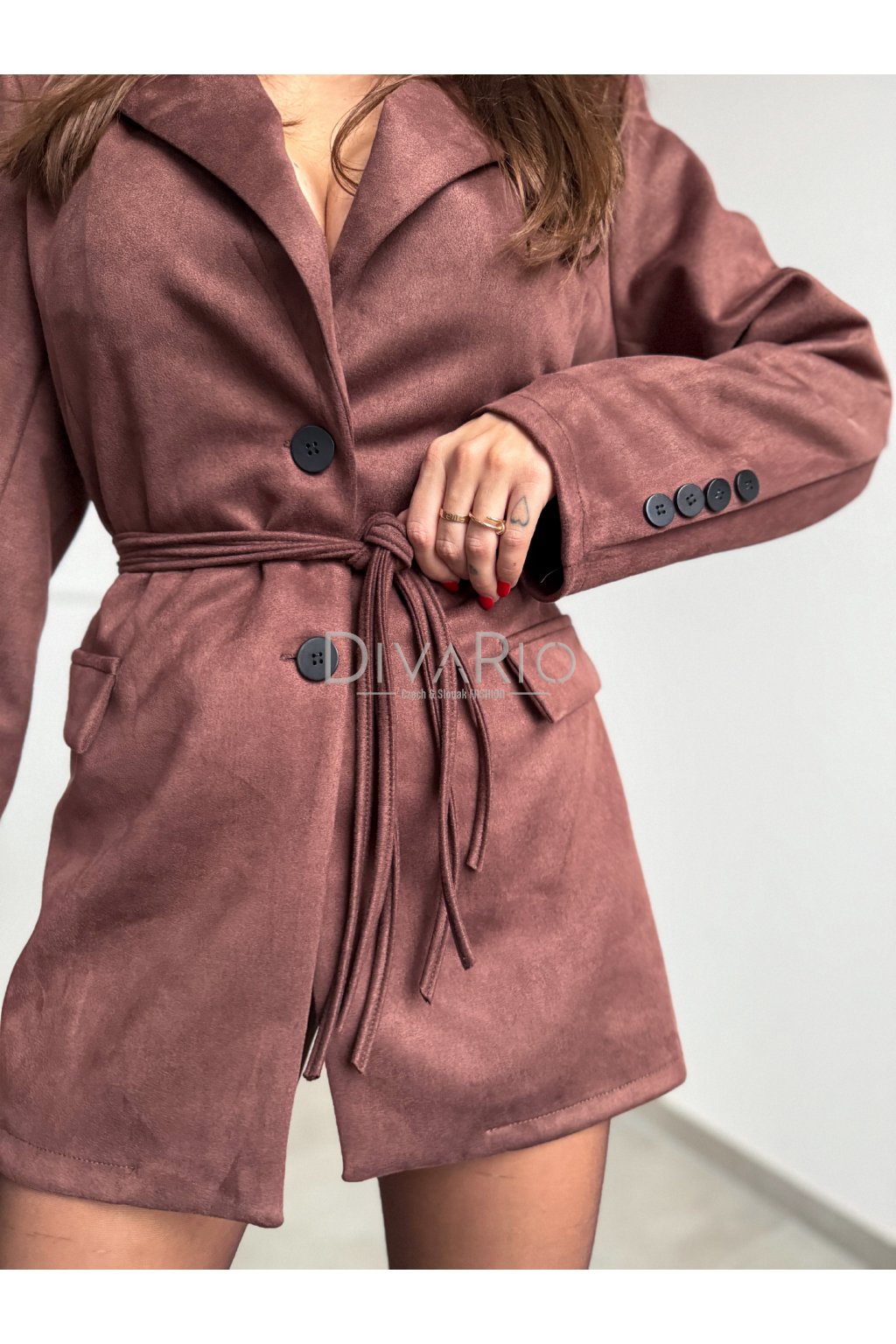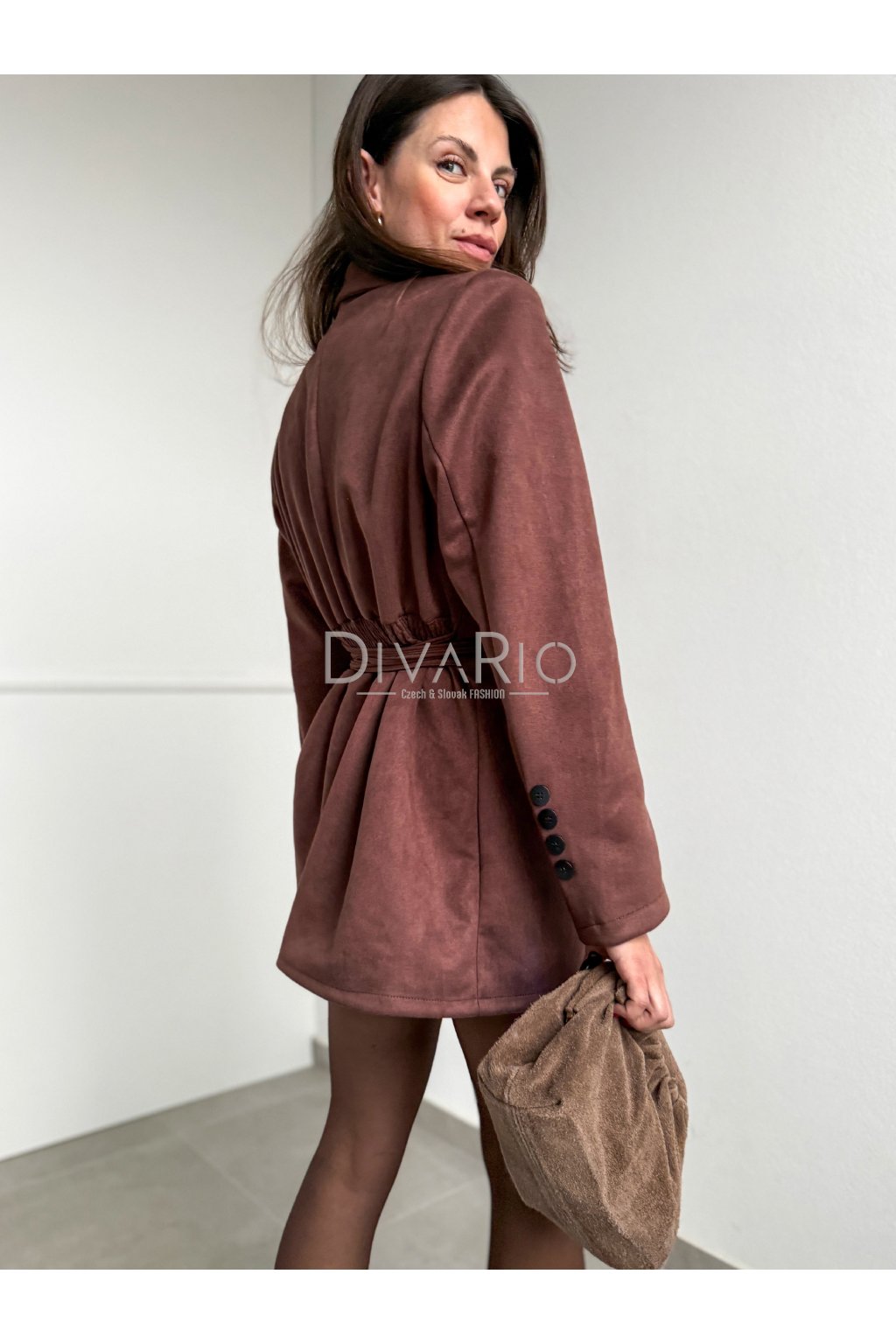 Suede blazer so zapínaním v hnedej farbe, prestrihnuté v pase, dlhý rukáv. Suede - materiál pripomínajúci semiš/brúsenp kožu.