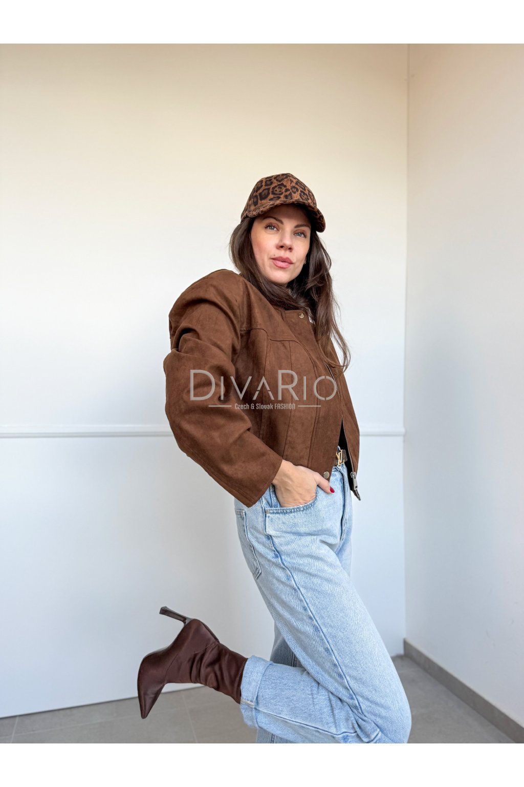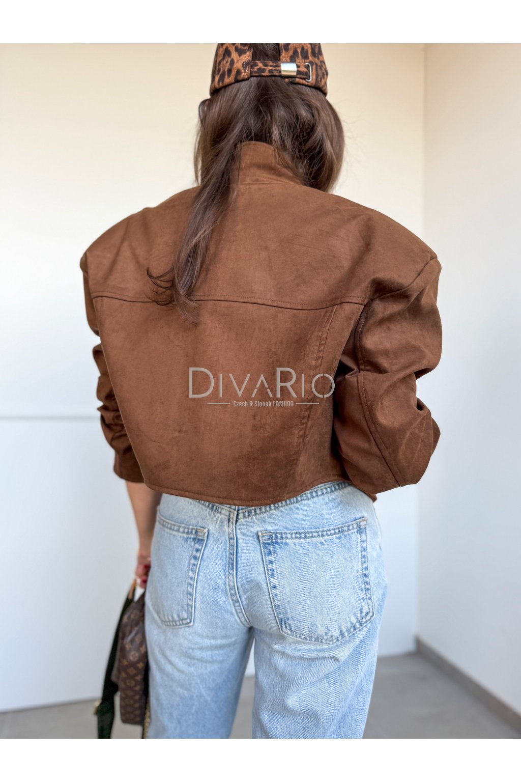 Skrátená bunda, efekt brúsenej kože, zapínanie na zips, dlhý širší rukáv. Vypcjaté ramená.