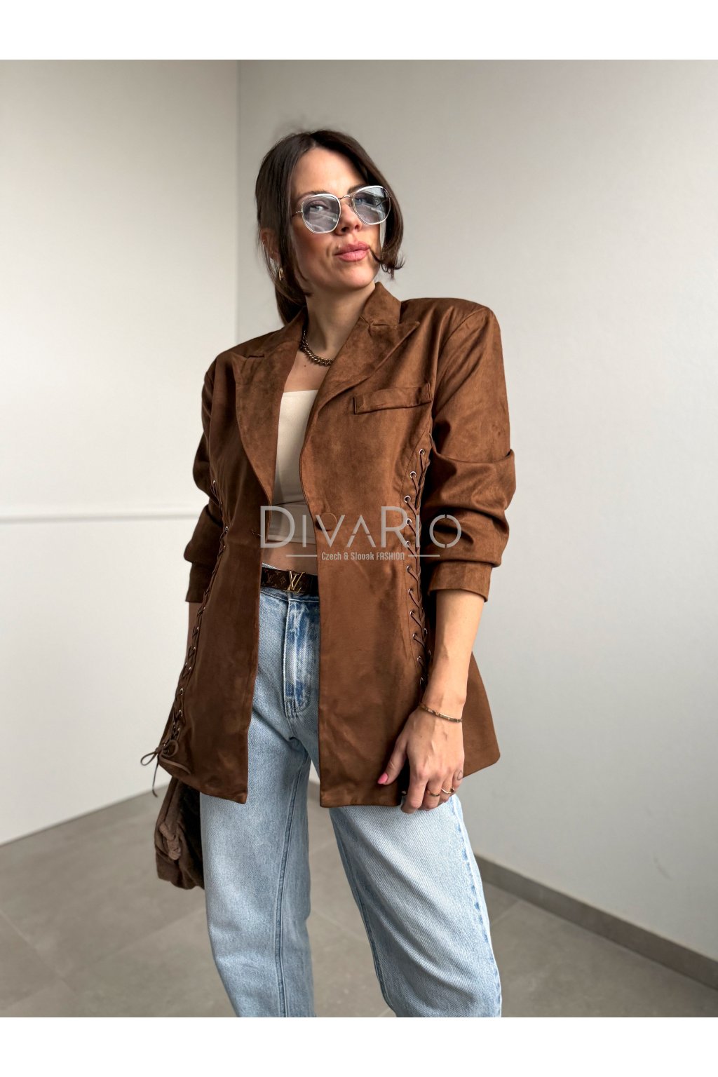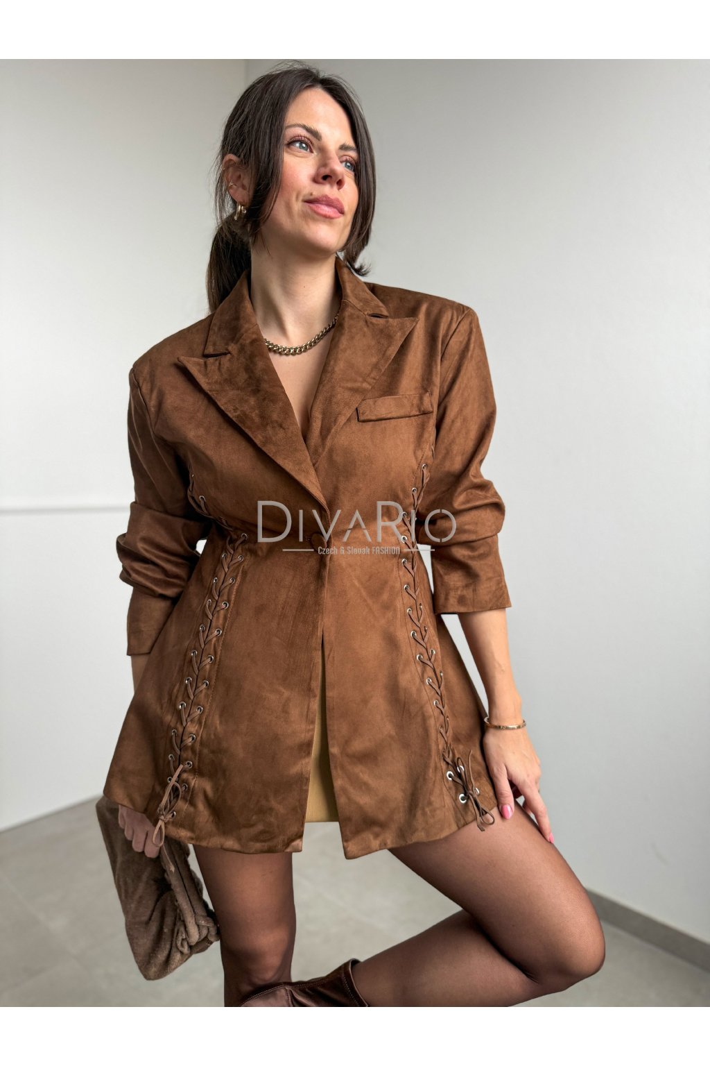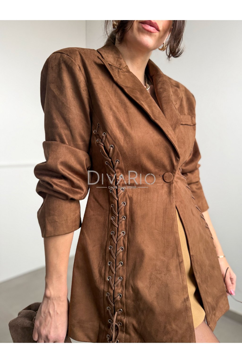 Predĺžené hnedé sako s efektom brúsenej kože/semišu. Zužovací efekt pasu, podširé, top kvalita. Dlhý rukáv, ozdobné prepletanie. Veľkosť UNi vhodná od Xs po M.